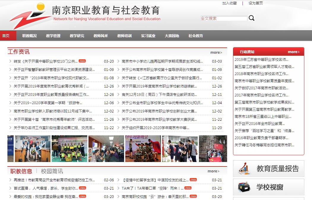 南京職業(yè)教育與社會教育網(wǎng)由南京市職教(成人)教研室主辦。南京近代職業(yè)技術(shù)教育肇始于晚清洋務(wù)運(yùn)動時(shí)期,清同治四年(1865年)兩江總督李鴻章在南京聚寶門(今中華門)外創(chuàng)建金陵制造局,“屋宇皆仿外洋之式營造”“募洋匠為師,督諸匠制造炮位、門火……”。清光緒十五年(1889年)外國教會創(chuàng)辦的南京斯密斯紀(jì)念醫(yī)院附設(shè)醫(yī)學(xué)堂是近代南京地區(qū)最早實(shí)施實(shí)業(yè)教育(職業(yè)技術(shù)教育)的學(xué)校,也是南京西醫(yī)學(xué)校之始。光緒二十一年(1895年),兩江總督張之洞創(chuàng)辦的鐵路專門學(xué)堂(又稱礦務(wù)鐵路學(xué)堂,魯迅先生于1899-1902年曾在該學(xué)堂求學(xué))是南京地區(qū)及江蘇省內(nèi)第一所官辦的實(shí)業(yè)學(xué)堂。至辛亥革命前,南京地區(qū)共有6家實(shí)業(yè)學(xué)堂。民國初年,學(xué)制變更,南京地區(qū)的實(shí)業(yè)學(xué)堂改為實(shí)業(yè)學(xué)校。民國十一年(1922年),根據(jù)民國政府頒布的《壬戌學(xué)制》,南京地區(qū)實(shí)業(yè)學(xué)校改為職業(yè)學(xué)校。1949年3月,南京解放前夕,全市共有8所中等職業(yè)技術(shù)學(xué)校,在校生651人,教職工321人,另有4所高等學(xué)校附設(shè)的高級職業(yè)科。1949年4月南京解放后,市人民政府對接管的所有公私立學(xué)校進(jìn)行整頓改造,并陸續(xù)建立多種類型的中等專業(yè)學(xué)校。1952年以后,為適應(yīng)經(jīng)濟(jì)和社會發(fā)展需要,除中等專業(yè)學(xué)校外,南京地區(qū)先后創(chuàng)辦了技工學(xué)校和農(nóng)業(yè)、職業(yè)中學(xué)。至1965年底,南京地區(qū)建立工業(yè)、交通、郵電等8大類中等專業(yè)學(xué)校25所,在校學(xué)生15765人,比1949年增長24倍。十一屆三中全會后,南京開始實(shí)行中等教育結(jié)構(gòu)改革,通過調(diào)整、整頓,全市中等專業(yè)學(xué)校、職業(yè)中學(xué)、技工學(xué)校三類職業(yè)技術(shù)教育逐步發(fā)展,事業(yè)規(guī)模逐步擴(kuò)大,形成了適應(yīng)南京經(jīng)濟(jì)和社會發(fā)展需要的中等職業(yè)技術(shù)教育體系。進(jìn)入新世紀(jì)以來,特別是“十二五”以來,南京職業(yè)教育深入推進(jìn) “雙十提優(yōu)工程”,加快構(gòu)建“現(xiàn)代職教體系”,深化教育教學(xué)改革,逐步建立完善了“升學(xué)有門、就業(yè)有路、創(chuàng)業(yè)有方”的人才成長立交橋,全市職業(yè)教育步入發(fā)展的“黃金時(shí)期”。1.職教基礎(chǔ)能力顯著提升。全市教育系統(tǒng)現(xiàn)有職業(yè)學(xué)校27所,教職工近6000人,在校學(xué)生7萬余人。27所學(xué)校中,國家中等職業(yè)教育改革發(fā)展示范校5所,江蘇省高水平現(xiàn)代化職業(yè)學(xué)校14所、所有職校全口徑跨入江蘇省現(xiàn)代化職業(yè)學(xué)校建設(shè)行列;全市現(xiàn)有81個(gè)省級品牌特色專業(yè),33個(gè)省級高水平實(shí)訓(xùn)基地。2.現(xiàn)代職教體系初步建立。構(gòu)建起包括五年一貫制、5+2、3+3、3+4分段培養(yǎng)模式在內(nèi)的現(xiàn)代職教體系,60%以上學(xué)生在高職以上(含本科院校)就讀。3.質(zhì)控評價(jià)體系漸趨成熟。構(gòu)筑了以人才培養(yǎng)方案審批審核、統(tǒng)考統(tǒng)測、技能年段標(biāo)高檢測、學(xué)業(yè)水平測試、教學(xué)督導(dǎo)視導(dǎo)、全市中職人才交流會、就業(yè)質(zhì)量跟蹤調(diào)查反饋等為主要內(nèi)容的“質(zhì)量長城”。4.職教競爭能力大幅提高。南京在全省技能大賽中連續(xù)十年奪冠,在省信息化大賽中連續(xù)四年奪冠,職業(yè)教育優(yōu)秀教學(xué)成果獎評選全省第一,十項(xiàng)辦學(xué)指標(biāo)南京有九項(xiàng)全省第一,對口單招本科錄取突破600大關(guān),躋身全省第三,畢業(yè)生就業(yè)率和就業(yè)滿意率保持在98%以上。5.布局和專業(yè)供給側(cè)改革步伐加快。深入推進(jìn)《南京市職業(yè)教育學(xué)校布局調(diào)整方案》,順利啟動“441工程”,推動布局和專業(yè)供給側(cè)改革,實(shí)現(xiàn)教育結(jié)構(gòu)的現(xiàn)代化。6.名師隊(duì)伍建設(shè)深入推進(jìn)。“十二五”期間我室在市教育局領(lǐng)導(dǎo)下,以優(yōu)秀教學(xué)團(tuán)隊(duì)建設(shè)為抓手,著力打造師德高尚、素質(zhì)優(yōu)良、技能精進(jìn)的職教師資隊(duì)伍,這支隊(duì)伍在主要競賽、對口單招、就業(yè)指導(dǎo)、品牌特色專業(yè)建設(shè)等方面都取得了突出成績。7信息化、國際化雙輪并驅(qū),加快智慧校園建設(shè),推進(jìn)教科研手段的信息化;深化中德“雙元制”“寶馬售后英才教育項(xiàng)目”合作辦學(xué)、中(南京衛(wèi)校)英(國王學(xué)院)護(hù)理項(xiàng)目、中(南京)加(蒙特利爾)職業(yè)教育交流等國際化合作辦學(xué)渠道,總結(jié)南京職業(yè)教育十種國際化模式,架設(shè)南京職校學(xué)生海外升學(xué)、就業(yè)通道,每年全市有百余名中職生跨出國門升學(xué)或就業(yè)。南京市“十三五”南京職業(yè)教育全面貫徹落實(shí)黨的十八大和全國、全省職業(yè)教育工作會議精神和全市教育與學(xué)習(xí)型城市建設(shè)大會以及職業(yè)教育布局調(diào)整推進(jìn)會精神,深入推進(jìn)國家、省以及市中長期