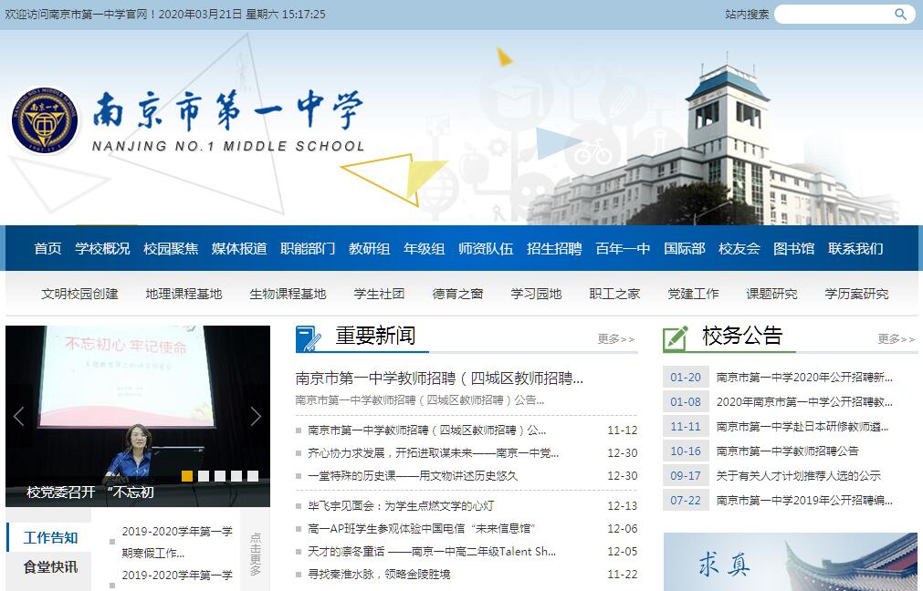 | 網站簡介: 南京市第一中學溯源于光緒三十三年(1907年)創(chuàng)設的崇文學堂,校址為清代江寧府署箭道、西花園舊址。不久思益學校(1903年創(chuàng)辦)并入,其后學校三易校名。1927年,李清悚先生創(chuàng)辦首都中區(qū)實驗學校,實踐陶行知教育思想。1933年,學校改稱南京市立第一中學。1937年抗戰(zhàn)爆發(fā),部分師生西遷,與蘇浙皖入蜀師生聯(lián)合成立國立二中。1945年,學校于原址復校,推行“真教育”。新中國成立后首任校長朱剛倡導“為祖國而教,為祖國而學”。1953年,學校被確定為14所江蘇省重點中學之一。1998年,學校深化素質教育,推行“中學導師制”。2000年,學校被評為國家級示范高中、江蘇省模范學校。2004年,被評為首批江蘇省四星級高中。2010年,學校明確了“培養(yǎng)人格健全、具有創(chuàng)新素養(yǎng)的現代公民”的育人目標,積極探索創(chuàng)新人才的培養(yǎng)模式,開啟國際化進程,續(xù)寫新的百年華章。 |
