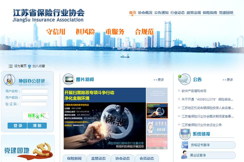 江蘇省保險(xiǎn)行業(yè)協(xié)會(huì)(英文名稱:Jiangsu Insurance Association 縮寫JIA)成立于1998年4月18日,是依照國務(wù)院頒行的《社會(huì)團(tuán)體登記管理?xiàng)l例》在江蘇省民政廳登記注冊(cè)的社團(tuán)法人。主管機(jī)關(guān)是中國保險(xiǎn)監(jiān)督管理委員會(huì)江蘇監(jiān)管局,登記管理機(jī)關(guān)為江蘇省民政廳,協(xié)會(huì)接受其業(yè)務(wù)指導(dǎo)和監(jiān)督管理。江蘇省保險(xiǎn)行業(yè)協(xié)會(huì)是江蘇省商業(yè)保險(xiǎn)業(yè)的行業(yè)性自律組織,以在江蘇省經(jīng)營保險(xiǎn)業(yè)務(wù)的保險(xiǎn)企業(yè)及保險(xiǎn)中介機(jī)構(gòu)為會(huì)員,自愿結(jié)成的省級(jí)非營利性社會(huì)法人社團(tuán)。宗旨是:遵守憲法、法律、法規(guī)、規(guī)章和國家政策,遵守社會(huì)道德風(fēng)尚,為會(huì)員提供服務(wù),維護(hù)行業(yè)利益、會(huì)員和保險(xiǎn)當(dāng)事人的合法權(quán)益,加強(qiáng)會(huì)員之間的協(xié)調(diào)和自律,自覺維護(hù)市場秩序,促進(jìn)江蘇省保險(xiǎn)業(yè)健康協(xié)調(diào)可持續(xù)發(fā)展。工作核心是服務(wù),基本職責(zé)為:自律、維權(quán)、協(xié)調(diào)、交流、宣傳。