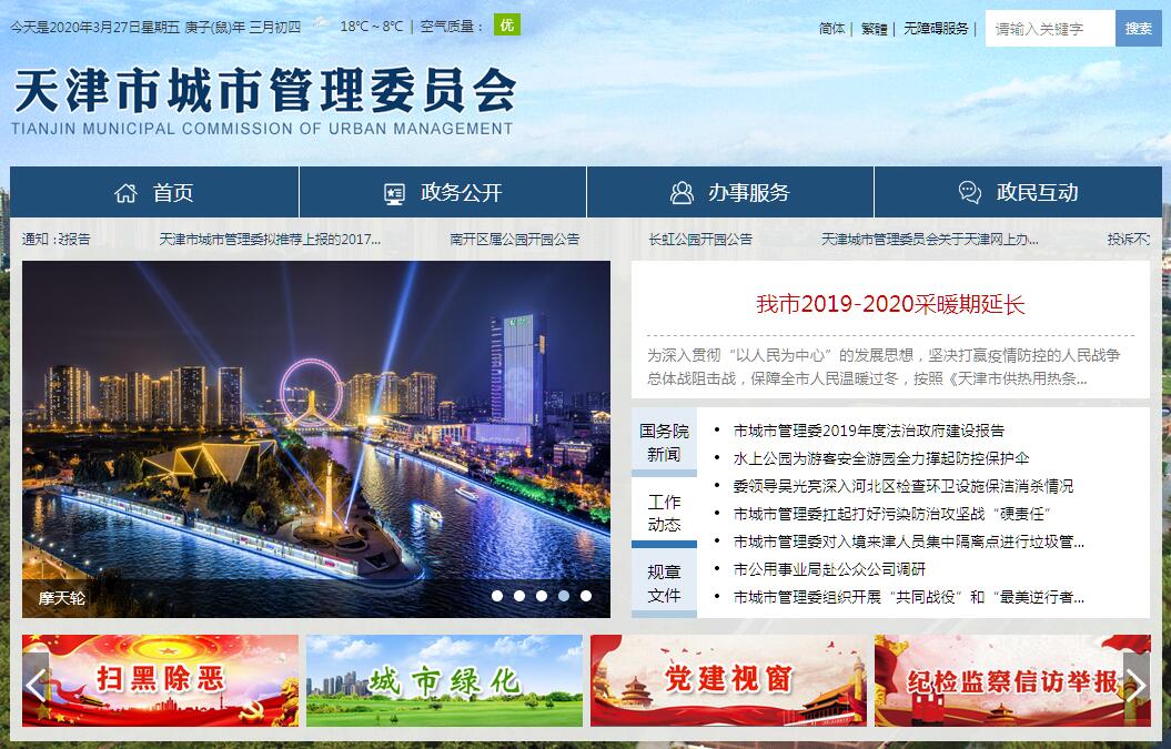 天津市城市管理委員會主要職責(zé)是:(一)貫徹執(zhí)行國家有關(guān)城市管理的法律、法規(guī)和方針、政策、標(biāo)準(zhǔn),研究起草有關(guān)地方性法規(guī)、政府規(guī)章草案,擬定有關(guān)政策、標(biāo)準(zhǔn),并組織實施。(二)組織編制有關(guān)市容市貌、環(huán)境衛(wèi)生、城鄉(xiāng)綠化以及燃氣、供熱、城市道路橋梁等市政公用基礎(chǔ)設(shè)施專項規(guī)劃。擬定市容市貌、環(huán)境衛(wèi)生、城鄉(xiāng)綠化以及燃氣、供熱、城市道路橋梁等市政公用基礎(chǔ)設(shè)施事業(yè)發(fā)展規(guī)劃和計劃,參與擬定燃氣、供熱、城市道路橋梁等市政公用基礎(chǔ)設(shè)施年度建設(shè)計劃,指導(dǎo)區(qū)編制區(qū)域市容市貌、環(huán)境衛(wèi)生、城鄉(xiāng)綠化、市政公用基礎(chǔ)設(shè)施事業(yè)發(fā)展。(三)配合有關(guān)部門做好市容市貌、環(huán)境衛(wèi)生、城鄉(xiāng)綠化及燃氣、供熱、城市道路橋梁等市政公用基礎(chǔ)設(shè)施用地管理工作。(四)擬訂完善城市管理考核指標(biāo)體系和管理制度,并對市級有關(guān)部門和區(qū)城市管理工作進行考核,承擔(dān)相關(guān)責(zé)任。(五)組織實施市容市貌建設(shè)項目,負責(zé)市容市貌管理工作。負責(zé)戶外廣告設(shè)置的規(guī)劃、管理、監(jiān)督和綜合協(xié)調(diào)工作。負責(zé)城鎮(zhèn)街道綜合整修管理工作,指導(dǎo)各區(qū)做好街道綜合整修具體工作。負責(zé)本市功能照明的維護、運行、監(jiān)督管理和景觀照明的規(guī)劃、建設(shè)、維護、運行、監(jiān)督管理。負責(zé)戶外廣告設(shè)置、功能照明設(shè)施及景觀照明設(shè)施安全監(jiān)管工作。負責(zé)重大節(jié)日、重要活動期間的環(huán)境布置和城市照明保障。(六)負責(zé)環(huán)境衛(wèi)生的組織管理和監(jiān)督檢查工作。負責(zé)環(huán)境衛(wèi)生設(shè)施建設(shè)管理。負責(zé)環(huán)境衛(wèi)生行業(yè)管理、機動車輛清洗行業(yè)管理。負責(zé)組織、協(xié)調(diào)全市環(huán)境秩序的綜合治理工作。(七)負責(zé)全市生活廢棄物清掃、收集、運輸和處置的統(tǒng)一監(jiān)督管理,推動生活廢棄物再生利用和無害化處理工作,負責(zé)生活垃圾分類工作。負責(zé)渣土治理綜合管理。(八)牽頭負責(zé)全市城鄉(xiāng)綠化工作。負責(zé)組織全市城鄉(xiāng)的全民義務(wù)植樹工作。對全市重大活動中涉及城市園林綠化工作及城區(qū)重大蟲情疫情的防治實施統(tǒng)一指揮。指導(dǎo)公園、動物園、風(fēng)景游覽區(qū)園林綠化工作。組織指導(dǎo)全市古樹名木保護工作,監(jiān)督指導(dǎo)城市規(guī)劃區(qū)內(nèi)古樹名木保護工作。(九)負責(zé)公園管理,負責(zé)園林綠化行業(yè)管理。負責(zé)城市園林綠化設(shè)施建設(shè)、養(yǎng)護和管理。(十)負責(zé)燃氣、供熱、城市道路橋梁等市政公用基礎(chǔ)設(shè)施運行管理的監(jiān)督檢查。(十一)研究編制全市城市管理綜合行政執(zhí)法工作規(guī)劃,制定工作目標(biāo)、標(biāo)準(zhǔn),并組織實施和考核。組織、指揮、調(diào)度全市城市管理綜合行政執(zhí)法機構(gòu)開展執(zhí)法活動。負責(zé)重大和跨區(qū)域違法違規(guī)案件的查處及執(zhí)法協(xié)調(diào)工作。負責(zé)城市管理綜合行政執(zhí)法監(jiān)督工作,制定執(zhí)法程序,規(guī)范執(zhí)法文書和處罰標(biāo)準(zhǔn)。負責(zé)城市管理綜合執(zhí)法隊伍的考核、監(jiān)察工作。負責(zé)全市城市管理綜合行政執(zhí)法人員的培訓(xùn)、考核和執(zhí)法資格審查工作。指導(dǎo)城市管理綜合行政執(zhí)法信訪工作。(十二)負責(zé)城市維護管理專項資金的安排和使用監(jiān)督,商市財政部門下達項目投資計劃。(十三)負責(zé)城市管理數(shù)字化建設(shè)、運行的監(jiān)管工作、組織推動市容市貌、環(huán)境衛(wèi)生、城鄉(xiāng)綠化重大科技項目的研究、鑒定和評估,以及科技成果的應(yīng)用推廣。(十四)負責(zé)本系統(tǒng)普法、宣傳教育、綜合統(tǒng)計、對外交流工作。(十五)依法依規(guī)履行城市管理領(lǐng)城安全生產(chǎn)監(jiān)管職責(zé),實施安全生產(chǎn)專業(yè)監(jiān)管,強化監(jiān)管執(zhí)法,查處違法違規(guī)行為。協(xié)調(diào)處置城市管理應(yīng)急突發(fā)事件。(十六)管理市城市公用事業(yè)管理局。(十七)組織推動本領(lǐng)域招商引資工作。(十八)負責(zé)本系統(tǒng)人才隊伍建設(shè)。(十九)承辦市委、市政府交辦的其他事項。