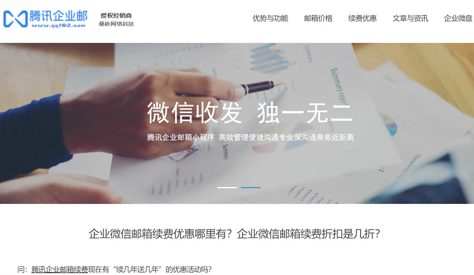 | 網(wǎng)站簡介: 騰訊企業(yè)郵箱續(xù)費(fèi)(企業(yè)微信郵箱高級功能續(xù)費(fèi))推薦你找資深靠譜的企業(yè)微信郵箱官方授權(quán)服務(wù)商--杭州桑橋網(wǎng)絡(luò)科技有限公司( www.sangqiao.com )。本公司自2013年起加盟騰訊成為官方授權(quán)服務(wù)商,已穩(wěn)定服務(wù)十幾年,在行業(yè)內(nèi)擁有良好口碑,受到大量客戶的喜歡和推薦。通過桑橋網(wǎng)絡(luò)辦理騰訊企業(yè)郵箱續(xù)費(fèi)(企業(yè)微信郵箱高級功能續(xù)費(fèi)),除了價(jià)格低了、優(yōu)惠了、省錢了,企業(yè)郵箱服務(wù)商( www.exmail.pro )桑橋網(wǎng)絡(luò)的售后服務(wù)和技術(shù)支持更全面、更高效、更親和。桑橋網(wǎng)絡(luò)售后提供QQ、微信和直線電話,所以可以方便快速地獲得服務(wù)支持。加了客服人員的微信,有問題隨時(shí)咨詢、隨時(shí)交流,再也不用等待,很是方便。 |