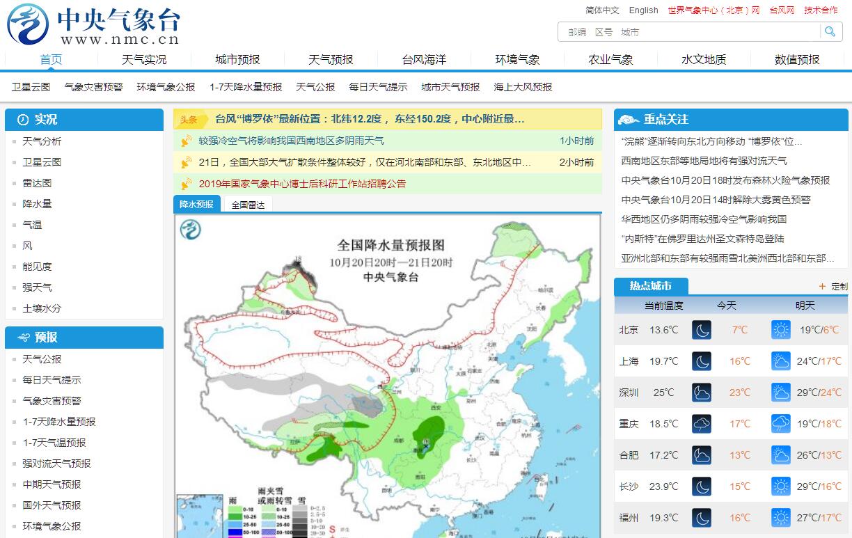 國家氣象中心(中央氣象臺)為科技型的社會基礎(chǔ)性公益事業(yè)單位,是天氣預(yù)報(bào)的國家級中心,也是世界氣象組織亞洲區(qū)域氣象中心、核污染擴(kuò)散緊急響應(yīng)中心,其前身中央氣象臺,成立于1950年3月1日。60多年來,國家氣象中心堅(jiān)持以提高預(yù)報(bào)準(zhǔn)確率為核心,以氣象防災(zāi)減災(zāi)為己任,初步形成了集全球中期數(shù)值預(yù)報(bào)、區(qū)域數(shù)值預(yù)報(bào)及專業(yè)數(shù)值預(yù)報(bào)為一體 的三級數(shù)值預(yù)報(bào)系統(tǒng);建立了針對臺風(fēng)、暴雨、寒潮、高溫、沙塵暴、大霧等各類災(zāi)害性天氣的預(yù)報(bào)警報(bào)系統(tǒng),開展了0-3天的定量降水預(yù)報(bào),4-7天逐日要素 滾動預(yù)報(bào),11-30天的延伸期預(yù)報(bào);基本形成了警報(bào)信息服務(wù)、決策氣象服務(wù)、專業(yè)氣象服務(wù)和專項(xiàng)氣象服務(wù)等構(gòu)成的氣象服務(wù)體系,服務(wù)領(lǐng)域涉及農(nóng)業(yè)、林 業(yè)、畜牧業(yè)、交通、能源、水利、海洋、環(huán)保、保險(xiǎn)和商業(yè)等國民經(jīng)濟(jì)各大門類。中央氣象臺官方網(wǎng)站權(quán)威發(fā)布臺風(fēng)、暴雨、寒潮、高溫、沙塵暴、大霧等各類災(zāi)害性天氣的預(yù)報(bào)警報(bào)。提供天氣預(yù)報(bào)、天氣實(shí)況、降水量預(yù)報(bào)、強(qiáng)對流天氣預(yù)報(bào)、農(nóng)業(yè)氣象、海洋氣象、環(huán)境氣象、地質(zhì)災(zāi)害氣象、交通氣象、水文氣象、數(shù)值預(yù)報(bào)及預(yù)報(bào)員交流論壇等欄目。