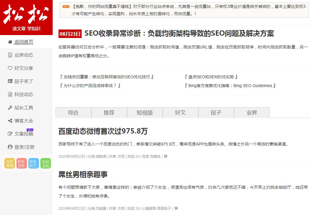 | 網(wǎng)站簡介: 松松網(wǎng)(盧松松博客)從2009年創(chuàng)立至今,已經(jīng)成為國內(nèi)知名的垂直網(wǎng)站之一。我們一直致力于提供前沿的網(wǎng)絡(luò)推廣知識,為草根站長與創(chuàng)業(yè)者提供全面的網(wǎng)絡(luò)推廣、網(wǎng)絡(luò)營銷、網(wǎng)站優(yōu)化、創(chuàng)業(yè)故事等文章。 |