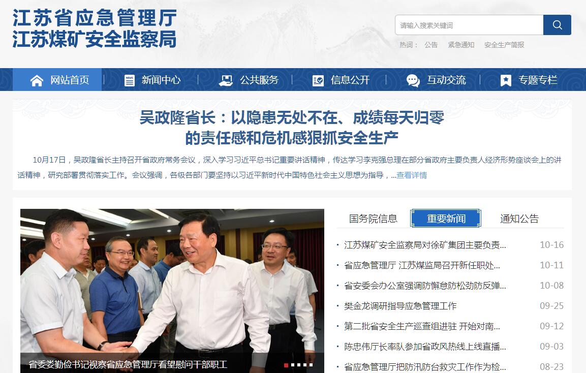 江蘇省應(yīng)急管理廳主要職責(zé):(一)負責(zé)應(yīng)急管理工作,指導(dǎo)全省各級各部門應(yīng)對安全生產(chǎn)類、自然災(zāi)害類等突發(fā)事件和綜合防災(zāi)減災(zāi)救災(zāi)工作。負責(zé)安全生產(chǎn)綜合監(jiān)督管理和工礦商貿(mào)行業(yè)安全生產(chǎn)監(jiān)督管理工作。(二)擬訂應(yīng)急管理、安全生產(chǎn)等政策,組織編制省應(yīng)急體系建設(shè)、安全生產(chǎn)和綜合防災(zāi)減災(zāi)規(guī)劃。起草相關(guān)地方性法規(guī)、規(guī)章草案,組織制定相關(guān)規(guī)程、標(biāo)準(zhǔn)并監(jiān)督實施。(三)指導(dǎo)應(yīng)急預(yù)案體系建設(shè),建立完善事故災(zāi)難和自然災(zāi)害分級應(yīng)對制度。組織編制省總體應(yīng)急預(yù)案和安全生產(chǎn)類、自然災(zāi)害類專項預(yù)案。綜合協(xié)調(diào)應(yīng)急預(yù)案銜接工作,組織開展預(yù)案演練,推動應(yīng)急避難設(shè)施建設(shè)。(四)牽頭建立統(tǒng)一的應(yīng)急管理信息系統(tǒng),負責(zé)信息傳輸渠道的規(guī)劃和布局。建立監(jiān)測預(yù)警和災(zāi)情報告制度,健全自然災(zāi)害信息資源獲取和共享機制,依法統(tǒng)一發(fā)布災(zāi)情。(五)組織指導(dǎo)協(xié)調(diào)安全生產(chǎn)類、自然災(zāi)害類等突發(fā)事件應(yīng)急救援。承擔(dān)省應(yīng)對重大災(zāi)害指揮部工作。綜合研判突發(fā)事件發(fā)展態(tài)勢并提出應(yīng)對建議。協(xié)助省委、省政府指定的負責(zé)同志組織重大災(zāi)害應(yīng)急處置工作。(六)統(tǒng)一協(xié)調(diào)指揮各類應(yīng)急專業(yè)隊伍,建立應(yīng)急協(xié)調(diào)聯(lián)動機制,推進指揮平臺對接。提請、銜接解放軍和武警部隊參與應(yīng)急救援工作。(七)統(tǒng)籌應(yīng)急救援力量建設(shè),負責(zé)消防、森林火災(zāi)撲救、抗洪搶險、地震和地質(zhì)災(zāi)害救援、生產(chǎn)安全事故救援等專業(yè)應(yīng)急救援力量建設(shè)。指導(dǎo)綜合性應(yīng)急救援隊伍、各級各部門及社會應(yīng)急救援力量建設(shè)。(八)負責(zé)消防管理工作,指導(dǎo)全省各級消防監(jiān)督、火災(zāi)預(yù)防、火災(zāi)撲救等工作。(九)指導(dǎo)協(xié)調(diào)森林火災(zāi)、水旱災(zāi)害、地震和地質(zhì)災(zāi)害等防治工作。負責(zé)自然災(zāi)害綜合監(jiān)測預(yù)警工作,指導(dǎo)開展自然災(zāi)害綜合風(fēng)險評估工作。(十)組織協(xié)調(diào)災(zāi)害救助工作,組織指導(dǎo)災(zāi)情核查、損失評估、救災(zāi)捐贈工作。管理、分配中央下?lián)芎褪〖壘葹?zāi)款物并監(jiān)督使用。(十一)依法行使安全生產(chǎn)綜合監(jiān)督管理職權(quán),指導(dǎo)協(xié)調(diào)、監(jiān)督檢查省政府有關(guān)部門和各設(shè)區(qū)市政府安全生產(chǎn)工作。組織開展安全生產(chǎn)巡查、考核工作。(十二)按照分級、屬地原則,依法監(jiān)督檢查工礦商貿(mào)生產(chǎn)經(jīng)營單位貫徹執(zhí)行安全生產(chǎn)法律法規(guī)情況及其安全生產(chǎn)條件和有關(guān)設(shè)備(特種設(shè)備除外)、材料、勞動防護用品的安全生產(chǎn)管理工作。依法組織并指導(dǎo)監(jiān)督實施安全生產(chǎn)準(zhǔn)入制度。負責(zé)危險化學(xué)品安全監(jiān)督管理綜合工作和煙花爆竹安全生產(chǎn)監(jiān)督管理工作。(十三)依法組織指導(dǎo)生產(chǎn)安全事故調(diào)查處理,監(jiān)督事故查處和責(zé)任追究落實情況。組織開展自然災(zāi)害類突發(fā)事件的調(diào)查評估工作。(十四)開展應(yīng)急管理、安全生產(chǎn)等方面的對外交流與合作,組織參與安全生產(chǎn)類、自然災(zāi)害類等突發(fā)事件的跨區(qū)域救援工作。(十五)制定應(yīng)急物資儲備和應(yīng)急救援裝備規(guī)劃并組織實施,會同省糧食和物資儲備局等部門建立健全應(yīng)急物資信息平臺和調(diào)撥制度,在救災(zāi)時統(tǒng)一調(diào)度。(十六)負責(zé)應(yīng)急管理、安全生產(chǎn)、防災(zāi)減災(zāi)宣傳教育和培訓(xùn)工作。組織指導(dǎo)相關(guān)科學(xué)技術(shù)研究、推廣應(yīng)用和信息化建設(shè)工作。(十七)完成省委、省政府交辦的其他任務(wù)。