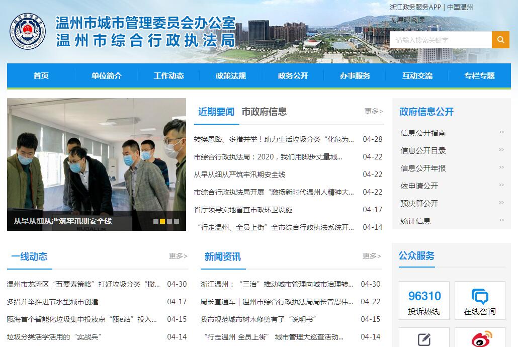 溫州市綜合行政執(zhí)法局是市政府工作部門,掛溫州市城市管理局牌子,為正縣級。溫州市綜合行政執(zhí)法局貫徹落實(shí)黨中央、省委和市委關(guān)于綜合行政執(zhí)法和城市管理工作的方針政策和決策部署,在履行職責(zé)過程中堅(jiān)持和加強(qiáng)黨對綜合行政執(zhí)法和城市管理工作的集中統(tǒng)一領(lǐng)導(dǎo)。其主要職責(zé)是:(一)宣傳、貫徹、執(zhí)行國家和省市關(guān)于開展綜合行政執(zhí)法和城市管理工作的法律、法規(guī)、方針、政策。組織擬訂有關(guān)綜合行政執(zhí)法和城市管理方面的規(guī)范性文件和管理標(biāo)準(zhǔn),并組織實(shí)施。(二)制定城市管理發(fā)展戰(zhàn)略、中長期發(fā)展規(guī)劃和年度計(jì)劃,并組織實(shí)施。參與城鄉(xiāng)規(guī)劃主管部門編制城市市容環(huán)衛(wèi)、市政公用、園林綠化等各項(xiàng)專業(yè)規(guī)劃,參與城市建設(shè)項(xiàng)目設(shè)計(jì)方案、初步設(shè)計(jì)的審查。(三)負(fù)責(zé)組織指導(dǎo)、統(tǒng)籌協(xié)調(diào)、監(jiān)督檢查、綜合考評全市綜合行政執(zhí)法和城市管理工作。(四)負(fù)責(zé)行使市容環(huán)衛(wèi)、城鄉(xiāng)規(guī)劃、園林綠化、市政公用、生態(tài)環(huán)境保護(hù)、市場監(jiān)管(室外公共場所無照經(jīng)營)、公安(侵占人行道、飼養(yǎng)動(dòng)物干擾他人正常生活)、土地和礦產(chǎn)資源、建筑業(yè)、房地產(chǎn)業(yè)、人防(民防)、水行政、安全生產(chǎn)、石油天然氣管道保護(hù)、教育管理等方面的法律、法規(guī)、規(guī)章規(guī)定的全部或部分行政處罰及相關(guān)行政監(jiān)督檢查、行政強(qiáng)制職權(quán)。綜合行政執(zhí)法的職權(quán)劃轉(zhuǎn)依據(jù)省政府批復(fù),以市政府公告為準(zhǔn)。(五)負(fù)責(zé)重大案件、跨區(qū)域案件查處和組織開展全市性重大綜合行政執(zhí)法活動(dòng)和專項(xiàng)活動(dòng)。承擔(dān)市級直接管轄范圍內(nèi)的行政處罰案件查處,對縣(市、區(qū))綜合行政執(zhí)法部門行政不作為的行政處罰案件直接立案查處。(六)負(fù)責(zé)市屬市容環(huán)衛(wèi)、市政公用、園林綠化等基礎(chǔ)設(shè)施的管理和相關(guān)的行政許可。參與財(cái)政部門編制綜合行政執(zhí)法和城市管理維護(hù)經(jīng)費(fèi)年度計(jì)劃,并組織實(shí)施和監(jiān)管使用。負(fù)責(zé)城市節(jié)約用水工作。組織協(xié)調(diào)城區(qū)防汛抗臺及城管各類突發(fā)事件的應(yīng)急處置工作。(七)負(fù)責(zé)制定智慧城管的總體規(guī)劃、近期計(jì)劃與遠(yuǎn)期計(jì)劃。負(fù)責(zé)發(fā)現(xiàn)、收集和處置城市管理問題,監(jiān)督、考評相關(guān)部門、各縣(市、區(qū))政府解決城市管理問題的情況。(八)完成市委、市政府交辦的其他任務(wù)。