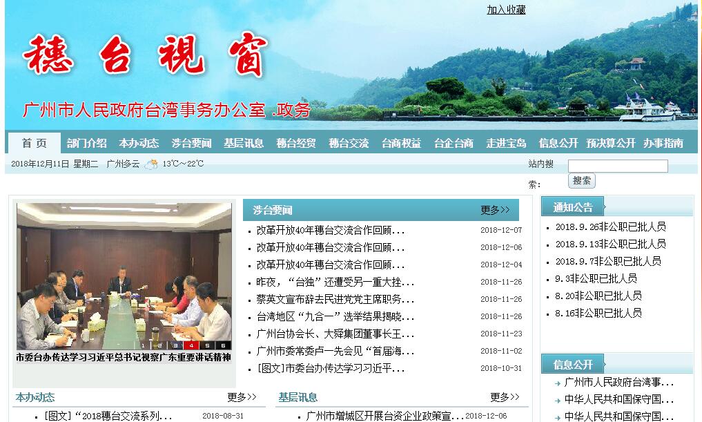 廣州市人民政府臺灣事務辦公室負責對全市對臺工作履行組織、指導、管理、協(xié)調職能。其主要職責:(一)貫徹執(zhí)行中央對臺工作方針政策;研究制定我市對臺工作的實施辦法和工作計劃,并組織實施。(二)組織、指導、管理、協(xié)調全市對臺工作;并對各級各部門貫徹執(zhí)行黨的對臺工作方針、政策情況進行檢查。(三)調查研究臺灣形勢及兩岸關系發(fā)展動向,提出對策意見和建議。(四)統(tǒng)籌協(xié)調和指導我市對臺經濟工作;協(xié)助管理臺資企業(yè);指導市臺資企業(yè)協(xié)會工作。(五)統(tǒng)籌協(xié)調和指導我市對臺文化、教育、科技、衛(wèi)生、體育以及其他各領域的交流與合作;負責我市赴臺交流、考察、講學項目和臺灣團體或人士來穗交流、考察、講學等有關項目的審核、報批工作。(六)負責對臺宣傳、涉臺新聞報道和涉臺教育工作;協(xié)調臺灣記者來穗采訪。(七)按照上級臺辦的部署和授權,負責與臺灣有關社會團體及各界人士的聯絡及溝通;指導各區(qū)、縣級市和市直有關單位及團體與臺灣重點人士的聯絡工作和重要涉臺活動。(八)保障臺灣同胞的合法權益;指導、協(xié)調處理涉臺重要事件和突發(fā)事件及穗臺兩地人員交往中的各類事務。(九)指導開展臺屬工作。(十)負責我市涉臺事務的新聞發(fā)言。(十一)負責市委對臺工作領導小組的日常工作。(十二)承辦市委、市政府和上級部門交辦的其他事項。