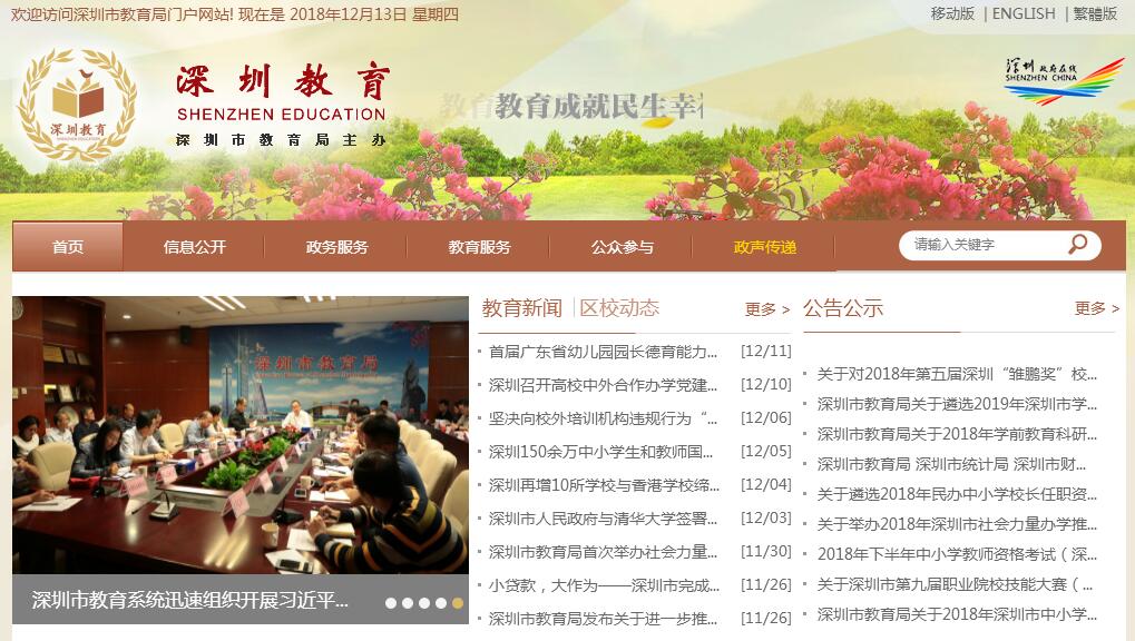 根據(jù)《中共廣東省委、廣東省人民政府關(guān)于深圳市深化行政管理體制改革試點方案的批復》(粵委〔2004〕6號),設置深圳市教育局(簡稱市教育局)。市教育局是主管全市教育行政工作的市政府組成部門。其主要職責:(一)貫徹執(zhí)行黨和國家關(guān)于教育的法律、法規(guī)、規(guī)章和方針、政府;草擬本市教育法規(guī)、規(guī)章,并組織實施。(二)編制教育事業(yè)的發(fā)展規(guī)劃和年度計劃,提出教育改革的政策和教育發(fā)展的目標、重點、結(jié)構(gòu)、速度,并協(xié)調(diào)指導實施。(三)管理市教育經(jīng)費;檢查區(qū)級教育財政撥款的執(zhí)行情況;指導協(xié)調(diào)學校教育技術(shù)裝備的配置;指導和監(jiān)督市教育系統(tǒng)內(nèi)部審計工作;參與協(xié)調(diào)全市教育系統(tǒng)學?;窘ㄔO工作。(四)統(tǒng)籌規(guī)劃、協(xié)調(diào)管理全市學前教育、基礎教育、職業(yè)教育、成人教育、中等專業(yè)教育和高等教育工作;指導學校開展教育教學改革和辦學體制、學校內(nèi)部管理體制改革;會同有關(guān)部門擬定各類教育(成人高校除外)的招生計劃;管理全市教育招生考試工作;按照管理權(quán)限,負責管理各級各類學校、社會力量辦學機構(gòu)的增設(撤并)和專業(yè)設置。(五)規(guī)劃、指導和協(xié)調(diào)全市教育系統(tǒng)的科研、科普工作;組織實施教育信息化工程;指導和管理學校開展勤工儉學和校辦產(chǎn)業(yè)工作。(六)指導全市各級各類學校的思想政治工作、德育工作、法制教育工作、精神文明建設工作、國防教育工作和體育衛(wèi)生與藝術(shù)教育工作;指導學校安全、治安保衛(wèi)和綜合治理工作。(七)管理全市教師工作;組織實施教師資格制度、職稱評聘制度,推進學校人事制度改革;指導各類學校教師和教育行政干部隊伍建設工作;負責組織中小學、幼兒園教師的繼續(xù)教育工作。(八)指導市屬高等學校黨的建設工作,負責局直屬單位黨的建設與領(lǐng)導人員的考察任免工作;負責全市教育系統(tǒng)紀檢監(jiān)察工作。(九)指導管理全市教育系統(tǒng)與國(境)外的教育交流與合作;會同有關(guān)部門對外籍教師和學生進行日常管理。(十)指導教育學會、協(xié)會、基金會等社團組織的工作。(十一)建立完善與企業(yè)、市民和社會各界對話溝通制度,提供高效優(yōu)質(zhì)服務。(十二)承辦市委、市政府和上級教育行政部門交辦的其他事項。
