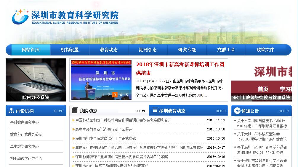 深圳市教育科學(xué)研究院是深圳市政府教育政策法規(guī)、教育科研、教學(xué)研究、質(zhì)量監(jiān)控、教師培訓(xùn)、信息服務(wù)等業(yè)務(wù)的專業(yè)指導(dǎo)和管理機(jī)構(gòu),是深圳市全額財政撥款事業(yè)單位,總編制為100人。作為深圳市的教育科學(xué)研究機(jī)構(gòu),我院具有為政府及教育行政部門提供教育決策服務(wù)、為基層教育機(jī)構(gòu)的教育教學(xué)實踐提供指導(dǎo)服務(wù)的功能。具體承擔(dān)著全市各級各類教育研究;教育科研規(guī)劃與課題管理;國際國內(nèi)教育科研合作;基礎(chǔ)教育和中職教育學(xué)科教學(xué)研究、指導(dǎo)與服務(wù);學(xué)科教學(xué)評價與質(zhì)量監(jiān)控;校長、教師等教育業(yè)務(wù)培訓(xùn);高考、中考以及高中學(xué)業(yè)考試指導(dǎo);地方課程和學(xué)校課程設(shè)置研究;地方教材和課程資源建設(shè);教研科研信息交流等職能職責(zé)。以教育“三個面向”和科學(xué)發(fā)展觀為指導(dǎo),遵循教育發(fā)展規(guī)律,踐行“以人為本”的理念,結(jié)合深圳教育發(fā)展實際,廣泛深入開展教育科學(xué)理論研究、教育教學(xué)實踐研究以及教育改革與發(fā)展研究,認(rèn)真履行教育決策參謀者、教科研實踐指導(dǎo)者、管理者角色,促進(jìn)我市教育決策的科學(xué)化、規(guī)范化,夯實我市教育改革與發(fā)展的理論基礎(chǔ),推動我市教育教學(xué)實踐持續(xù)深入發(fā)展,為率先實現(xiàn)教育現(xiàn)代化做出卓越貢獻(xiàn)。其業(yè)務(wù)范圍:(一)開展教育政策法規(guī)、教育規(guī)劃研究以及各類教育評估和行政審批的前置性評估;自主開展教育重大問題的對策研究;為市教育行政部門提供教育信息和決策咨詢的全方位服務(wù)。(二)開展教育科研,進(jìn)行教育發(fā)展研究(含事業(yè)發(fā)展規(guī)劃和政策法規(guī)研究、學(xué)校發(fā)展研究、學(xué)生身心發(fā)展研究)、教育管理與評價研究以及現(xiàn)代教育技術(shù)應(yīng)用研究。(三)開展基礎(chǔ)教育各學(xué)科的教學(xué)研究(含教材教法、課堂教學(xué)質(zhì)量、學(xué)科考試命題)、教育教學(xué)信息服務(wù)以及教學(xué)質(zhì)量監(jiān)控等工作。(四)負(fù)責(zé)全市教師繼續(xù)教育業(yè)務(wù)指導(dǎo)和課程體系建設(shè),接受教育行政管理部門委托,負(fù)責(zé)教師繼續(xù)教育的學(xué)籍管理,組織開展全市性的教師繼續(xù)教育專項培訓(xùn)以及中小學(xué)各學(xué)科教學(xué)、教材培訓(xùn)。(五)負(fù)責(zé)全市中小學(xué)地方教材、校本教材、教輔用書的編寫和審定工作。(六)接受教育行政主管部門委托,負(fù)責(zé)開展全市公、民辦中小學(xué)(幼兒園)校(園)長、教學(xué)業(yè)務(wù)干部和教師的業(yè)務(wù)培訓(xùn),市級骨干教師、新任教師以及各級培訓(xùn)基地師資的培訓(xùn);與有關(guān)機(jī)構(gòu)合作開展教師提升學(xué)歷教育。