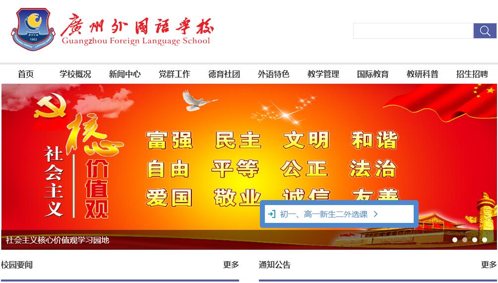 廣州外國語學校(簡稱“廣州外校”)是教育部批準開辦的全國首批七所外國語學校之一,創(chuàng)辦于1963年,在歷史上為國家培養(yǎng)了大批外語、外交人才,后因歷史原因停辦。2009年,廣州市委、市政府高起點、高標準、高品位在南沙新區(qū)復辦廣州外?!,F為廣州市唯一市屬公辦、全日制寄宿制外語特色學校。2010年恢復招生以來,廣州外校遵循“全面發(fā)展、特長發(fā)展、個性發(fā)展”的育人思路,著力創(chuàng)建外語特色品牌、科技教育品牌、教學質量品牌,相繼成為全國高中國際雙語教育實驗學校、全國外國語學校工作研究會會員學校、美國大學理事會國際代碼學校、美國大學直通車(U-pass)項目學校、德國歌德學院Pasch項目學校、廣東省青少年科技教育基地、廣州市青少年科技教育特色學校、廣州市中小學校長繼續(xù)教育實踐基地、市基礎教育國際交流與合作廣州平臺、廣州市首批(普通高中)特色學校、廣州市義務教育規(guī)范化學校,成功創(chuàng)建國家Ⅱ級田徑場、廣州市優(yōu)秀家長學校、廣州市花園式單位。廣州外校致力于構建多元、開放的國際化辦學格局,為培養(yǎng)外語、外交、外貿復合型國際化人才奠基,已開辦中美“2+1”國際高中課程班、AP國際課程班,與美、德、法、日等國多所中學締結為友好姊妹學校,與法、德、日、澳等國國際一流大學洽談和簽署國際教育合作項目,努力為學生搭建直通國際一流大學的綠色通道。廣州外校將秉承“博學、雅正、融和”的辦學理念,以一流的教師隊伍、一流的學校管理、一流的設施設備,建設成廣州市基礎教育國際化辦學示范基地、外語特色龍頭學校,打造成廣東省外語教育高地和名片,發(fā)展為中國一流、世界知名的外國語學校。