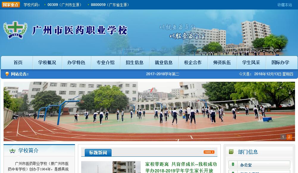 廣州市醫(yī)藥職業(yè)學(xué)校(廣州市生物醫(yī)藥高級職業(yè)技術(shù)學(xué)校)創(chuàng)辦于1964年,是一所全日制公辦國家級重點(diǎn)職業(yè)學(xué)校。隸屬廣州市教育局管理,學(xué)校一貫堅(jiān)持“以就業(yè)為導(dǎo)向,以服務(wù)為宗旨”的辦學(xué)方向,重視學(xué)生操作能力和綜合素質(zhì)的培養(yǎng)。主要為廣州及珠三角地區(qū)醫(yī)藥、食品、化妝品行業(yè)培養(yǎng)中初級專業(yè)技術(shù)人員及管理人員。是廣州市首批開展“雙證書”試點(diǎn)工作的學(xué)校,被市教育局評為“廣州市安全文明校園”,“民主管理星級考核三星級單位”和“先進(jìn)職工之家”,“廣州市家長學(xué),也是廣州市唯一一所培養(yǎng)醫(yī)藥技能人才的重要基地,正在努力建設(shè)國家示范性職業(yè)學(xué)校。多年來,以先進(jìn)的辦學(xué)理念,雄厚的師資力量、鮮明的醫(yī)藥專業(yè)設(shè)置、廣闊的就業(yè)前景以及多渠道的升學(xué)深造途徑得到社會和家長的廣泛認(rèn)同和贊譽(yù)。學(xué)校教育資源豐富,教學(xué)與實(shí)驗(yàn)實(shí)訓(xùn)設(shè)備先進(jìn),校園環(huán)境優(yōu)美,學(xué)習(xí)生活設(shè)施完善。學(xué)校師資隊(duì)伍實(shí)力雄厚,結(jié)構(gòu)優(yōu)良,擁有專兼職教師190多人,其中,中高級職稱100多人,“雙師型”專業(yè)教師占55%。學(xué)校面向全省招生,目前在校中職學(xué)生5500多名,與高校合作辦學(xué)大專學(xué)生800余人。校內(nèi)建有10000多平方米的設(shè)備先進(jìn)、適度超前的多功能實(shí)訓(xùn)中心。近年來投資了3000余萬元用于添置先進(jìn)的實(shí)驗(yàn)實(shí)訓(xùn)設(shè)備和教育信息化設(shè)備,全校共有專業(yè)實(shí)驗(yàn)室和實(shí)訓(xùn)室30余間。其中:有按照國際藥品質(zhì)量管理規(guī)范(GMP)標(biāo)準(zhǔn)建設(shè)的藥劑實(shí)訓(xùn)車間;擁有自主知識產(chǎn)權(quán)的全國首創(chuàng)建立的片劑車間虛擬現(xiàn)實(shí)教學(xué)室;設(shè)備齊全的藥品檢驗(yàn)實(shí)訓(xùn)室、模擬藥店;中藥標(biāo)本館、中藥圃等多功能區(qū)。并建有覆蓋全校教學(xué)課室、計(jì)算機(jī)房和辦公場所的千兆校園網(wǎng),校內(nèi)所有課室均配有多媒體教學(xué)設(shè)備。學(xué)校緊密結(jié)合醫(yī)藥行業(yè)發(fā)展,堅(jiān)持校企合作,注重實(shí)踐與探索,不斷培養(yǎng)與企業(yè)需求相匹配的專業(yè)技術(shù)人才,與校外100多家企業(yè)簽訂實(shí)習(xí)基地協(xié)議及訂單培養(yǎng)協(xié)議。學(xué)校是廣州地區(qū)醫(yī)藥行業(yè)藥物制劑、藥物分析、中藥制劑專業(yè)職業(yè)技能考核的定點(diǎn)單位。學(xué)生畢業(yè)時(shí)既可取得市教育局驗(yàn)印的畢業(yè)證書,又能獲得勞動部門頒發(fā)的職業(yè)資格中級證書。嚴(yán)謹(jǐn)?shù)男oL(fēng)和一流的教學(xué)質(zhì)量,使畢業(yè)生受到各地區(qū)衛(wèi)生部門,醫(yī)藥、食品、化妝品、保健品等企業(yè)的歡迎。每年的畢業(yè)生供不應(yīng)求,近幾年來就業(yè)率均在98%以上,成人高考錄取率95%以上。醫(yī)藥行業(yè)永遠(yuǎn)是朝陽行業(yè),在省、市“十二五”規(guī)劃中,生物醫(yī)藥行業(yè)是重點(diǎn)發(fā)展的支柱產(chǎn)業(yè)之一,發(fā)展前景無可限量。