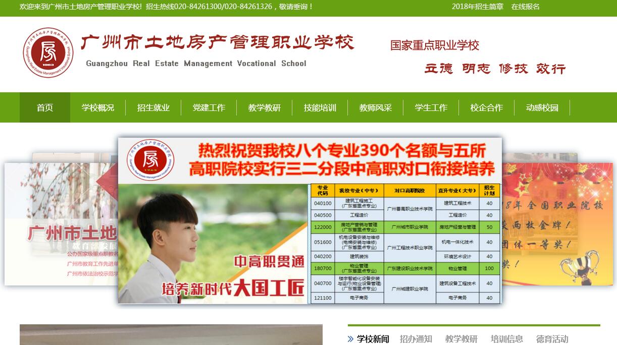 廣州市土地房產(chǎn)管理職業(yè)學校(廣州市房地產(chǎn)高級職業(yè)技術(shù)學校)是廣州市教育局屬下的一所全日制普通中等專業(yè)學校。原名廣州市房建中等專業(yè)學校,1963年創(chuàng)辦,2006年更名為現(xiàn)校名。1998年成為廣東省重點中職學校,2000年成為首批國家級重點中職學校。學校占地面積72.8畝,教學用房建筑面積5.6(4.55)萬平方米,辦學基礎(chǔ)設(shè)施設(shè)備完善,校園信息化建設(shè)程度高,獲得廣東省現(xiàn)代教育技術(shù)實驗學校資格。校內(nèi)實訓基地建筑面積2.5萬多平方米,設(shè)八個專業(yè)實訓中心,其中電梯安裝與維修專業(yè)實訓中心的建設(shè)規(guī)模與建設(shè)水平居省中職學校的先進水平。學校現(xiàn)有在編教工187人,合同制教工18人(其中專任教師132人、高級講師68人),教師中本科及本科以上學歷達100%。學校招生規(guī)模穩(wěn)定,目前在校生近3000人,職前職后培訓鑒定年均4500多人次。近三年畢業(yè)生就業(yè)率均保持在97%以上。多年來,學校認真落實黨和各級政府的職教政策,準確把握中等職業(yè)教育定位,遵循職業(yè)教育規(guī)律,抓住職教大發(fā)展的機遇,堅持內(nèi)涵發(fā)展,堅持品牌立校,用專注之心和扎實之力辦職業(yè)教育;全體教工精誠團結(jié),以愛心化解問題,以自信突破困難,以責任開創(chuàng)遠景,不斷創(chuàng)新辦學模式和人才培養(yǎng)模式,不斷深化內(nèi)部管理體制改革和教育教學改革,在永不放棄的努力中,辦出了自己的特色和成效。學校的穩(wěn)定發(fā)展與改革成果,受到上級領(lǐng)導、教育同行和社會行業(yè)的關(guān)注和肯定,學校先后獲得“廣東省職業(yè)技術(shù)教育先進集體”、“廣東省文明校園”、“廣州市文明示范校園”、“廣州市文明單位”、“廣州市教育工作先進單位”、“廣州市安全文明單位”、“廣州市依法治校示范?!?、“廣州市治安內(nèi)保工作先進單位”、“廣州市書香校園”、“廣東省書香校園”、“廣州市語言文字工作示范學?!?、“廣州市健康學?!钡确Q號和榮譽。