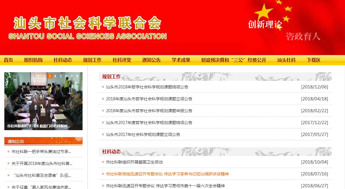 汕頭市社會科學(xué)聯(lián)合會于1984年4月19日成立。2005年8月市編委批準(zhǔn),同意加掛“汕頭市社會科學(xué)研究所”牌子,增加事業(yè)編制2名。現(xiàn)有編制共8名。市社科聯(lián)是市委和市人民政府領(lǐng)導(dǎo)下的由各社科團(tuán)體組成的人民團(tuán)體,是黨和政府聯(lián)系與團(tuán)結(jié)廣大社會科學(xué)工作者的橋梁和紐帶,主要任務(wù)是:(一)指導(dǎo)、聯(lián)絡(luò)和協(xié)調(diào)各個學(xué)會、研究會、協(xié)會的工作;(二)組織各種學(xué)術(shù)理論研究活動,開展省內(nèi)外的學(xué)術(shù)交流;(三)開展社會科學(xué)的宣傳普及工作和智力開發(fā)、咨詢服務(wù)工作;(四)組織優(yōu)秀社會科學(xué)研究成果的評選活動;(五)組織社會科學(xué)界完成黨和政府交給的各項任務(wù);(六)組織社會科學(xué)界積極參與社會協(xié)商對話、民主監(jiān)督和民主管理;(七)維護(hù)本會所代表的社會科學(xué)工作者及其團(tuán)體的合法權(quán)益。目前,我市社會科學(xué)學(xué)會(協(xié)會、研究會)共34個,會員有1萬多人,形成了全市性的社會科學(xué)工作網(wǎng)絡(luò)。?成立20多年來,在市委、市政府的正確領(lǐng)導(dǎo)下,在省社科聯(lián)和市委宣傳部的關(guān)懷和指導(dǎo)下,市社科聯(lián)發(fā)揮了黨和政府聯(lián)系團(tuán)結(jié)廣大社會科學(xué)工作者的橋梁和紐帶的作用,堅持理論聯(lián)系實際,緊緊圍繞市委、市政府的中心工作,以“汕頭經(jīng)濟(jì)特區(qū)論壇”、“汕頭經(jīng)濟(jì)特區(qū)社科文叢”、“汕頭社科通俗讀物”、“社科普及周”為載體,以“汕頭社科”期刊為園地,指導(dǎo)、聯(lián)絡(luò)和協(xié)調(diào)各學(xué)會積極開展理論研討和社科知識宣傳教育普及活動,努力尋找社科工作與經(jīng)濟(jì)工作結(jié)合點(diǎn),為市委市政府的決策提供理論支持和參考,為繁榮發(fā)展哲學(xué)社會科學(xué)事業(yè)和推動我市四個文明建設(shè)取得了一定的成績。從2009年11月汕頭市社科普及周開始,我市社科普及工作陸續(xù)啟動了“城市論壇”、“國學(xué)論壇”、“家長論壇”、“潮學(xué)論壇”、“經(jīng)濟(jì)論壇”、“養(yǎng)生論壇”,使我市社科普及工作常態(tài)化、經(jīng)常化。在全國大中城市社科聯(lián)工作會議上,我會榮獲“2005—2006年度全國大中城市先進(jìn)社科聯(lián)”、“2007——2008年度全國大中城市先進(jìn)社科聯(lián)”等光榮稱號。在創(chuàng)建好班子活動中,市社科聯(lián)領(lǐng)導(dǎo)班子被市評為2007、2008、2009年度“好班子”。