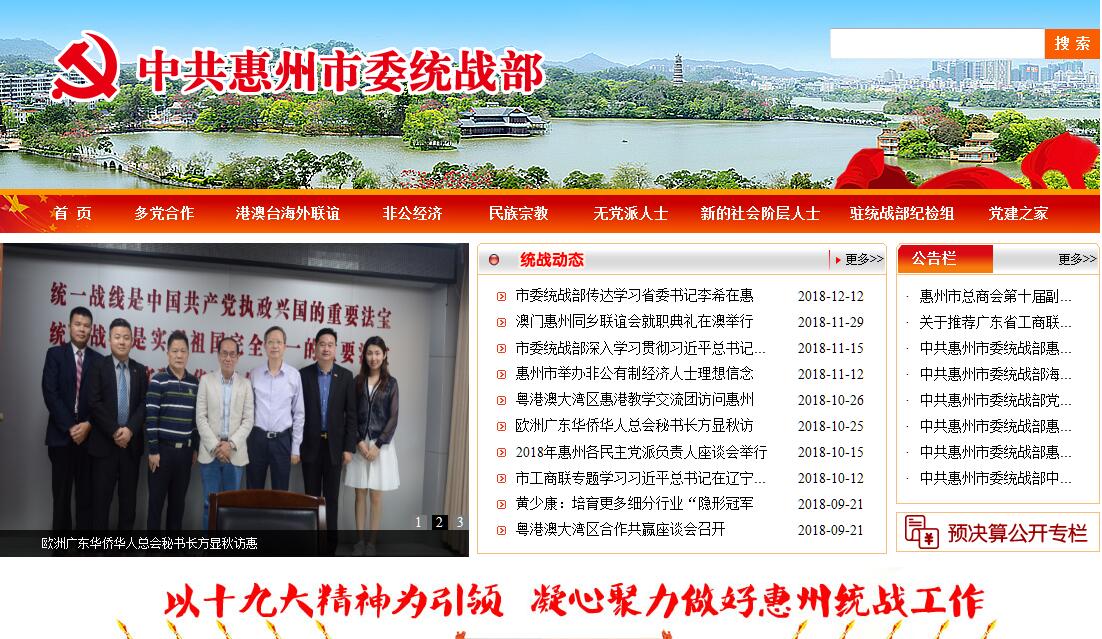 中共惠州市委統(tǒng)戰(zhàn)部是惠州市委主管統(tǒng)一戰(zhàn)線工作的職能部門。其主要職責(zé)是:(一)貫徹執(zhí)行黨的各項統(tǒng)戰(zhàn)方針、政策;協(xié)調(diào)統(tǒng)一戰(zhàn)線各方面的關(guān)系,向市委反映統(tǒng)一戰(zhàn)線情況,提出惠州市統(tǒng)戰(zhàn)工作的意見和建議。(二)負(fù)責(zé)聯(lián)系各民主黨派和無黨派代表人士,通報情況,反映意見和建議,貫徹落實黨的有關(guān)方針、政策。(三)協(xié)助做好黨外人士的政治安排和實職安排工作;協(xié)同有關(guān)部門做好黨外后備干部隊伍建設(shè)工作。(四)聯(lián)系和培養(yǎng)黨外知識分子代表人物。(五)負(fù)責(zé)開展以祖國統(tǒng)一為重點的海外統(tǒng)戰(zhàn)工作。(六)聯(lián)系非公有制經(jīng)濟代表人士,貫徹黨的有關(guān)方針政策,協(xié)調(diào)關(guān)系,反映情況。(七)聯(lián)系少數(shù)民族代表人物和宗教團體及其代表人物,貫徹黨的有關(guān)方針政策,了解情況,協(xié)調(diào)關(guān)系;協(xié)助有關(guān)部門做好少數(shù)民族干部的培養(yǎng)、選拔工作。(八)指導(dǎo)協(xié)調(diào)各縣(市、區(qū))、惠州學(xué)院黨委統(tǒng)戰(zhàn)部和市直有關(guān)部門的統(tǒng)戰(zhàn)工作;協(xié)助有關(guān)部門管理縣級黨委統(tǒng)戰(zhàn)部長。(九)指導(dǎo)和協(xié)調(diào)市委臺灣工作辦公室(市政府臺灣事務(wù)局)有工作。(十)承辦市委和省委統(tǒng)戰(zhàn)部交辦的其他事項。