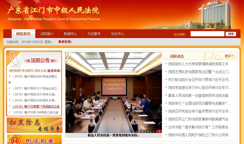 江門市中級人民法院建院于1983年6月1日,內(nèi)設(shè)立案庭、刑一庭、刑二庭、民一庭、民二庭、民三庭、民四庭、行政庭(與賠償委員會辦公室合署)、審監(jiān)庭、法警支隊等審判業(yè)務(wù)機構(gòu),下轄蓬江區(qū)、江海區(qū)、新會區(qū)、臺山市、開平市、恩平市、鶴山市7個基層人民法院,基層人民法院共派出中心法庭35個。江門市中級人民法院是國家審判機關(guān),依法獨立行使審判權(quán),接受廣東省高級人民法院的監(jiān)督和指導,監(jiān)督和指導下級法院的審判工作,對江門市人民代表大會及其常務(wù)委員會負責并報告工作。其要工作職責是:(一)審判法律規(guī)定和上級法院指定由本院管轄的以及本院認為依法應(yīng)當由自己審判的刑事、民事、行政等第一審案件。(二)審判基層人民法院依照法律規(guī)定移送審判的刑事、民事、行政等第一審案件。(三)審判不服基層人民法院判決或裁定的上訴案件及檢察院抗訴第二審刑事、民事、行政等案件。(四)審判由市人民檢察院按照審判監(jiān)督程序提出抗訴的案件。(五)審查處理不服本院已發(fā)生法律效力的判決或裁定的各類申請再審和申訴案件,對其中確有錯誤的依照審判監(jiān)督程序進行再審。(六)審查處理不服基層人民法院已發(fā)生法律效力的判決或裁定提出申訴、申請再審而被駁回的案件,對其中確有錯誤的,依照審判監(jiān)督程序提審或指令下級人民法院再審。(七)審理減刑、假釋案件。(八)對基層人民法院管轄不明或者有爭議的案件指定管轄。(九)監(jiān)督和指導基層人民法院的審判工作和其他工作。(十)依法行使司法執(zhí)行權(quán)和司法決定權(quán)。(十一)依法決定國家賠償。(十二)管理、協(xié)調(diào)全市法院執(zhí)行工作。(十三)負責司法鑒定工作。(十四)管理、協(xié)調(diào)全市法院司法警察工作。(十五)針對案件審理中發(fā)現(xiàn)的問題,向有關(guān)單位和部門提出司法建議。(十六)指導全市法院系統(tǒng)思想政治、教育培訓工作;按照權(quán)限管理法官和其他人員;協(xié)助管理全市法院系統(tǒng)的機構(gòu)編制;指導全市法院系統(tǒng)的監(jiān)察工作。(十七)結(jié)合審判工作宣傳法制,教育公民自覺遵守憲法、法律和社會公德。(十八)承辦其他應(yīng)由市中級法院負責的工作。