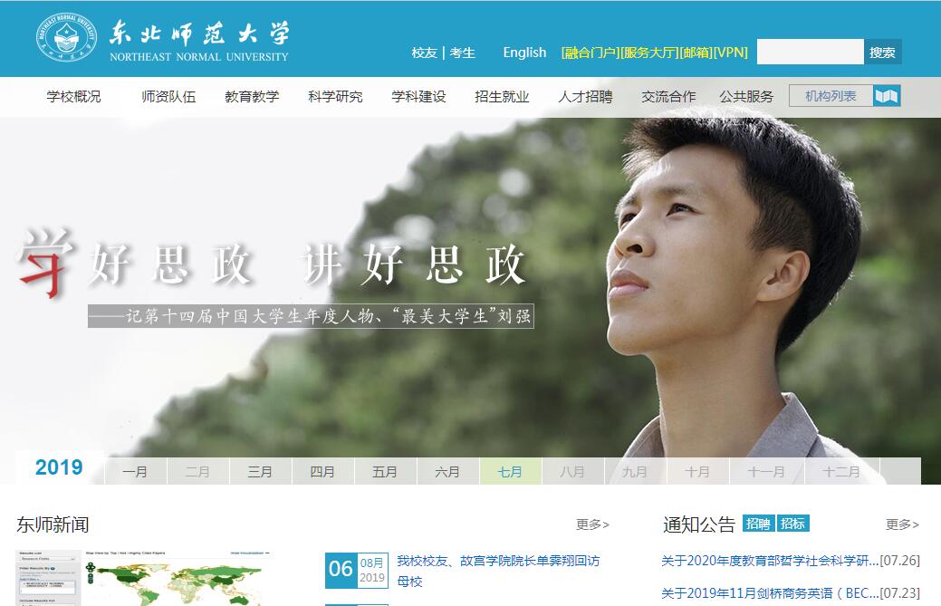 紅色傳承,星火東漸。東北師范大學(xué)原名東北大學(xué),1946年建校,是中國共產(chǎn)黨在東北地區(qū)創(chuàng)建的第一所綜合性大學(xué)。1949年定址于長春。1950年易名為東北師范大學(xué)。1958年劃歸吉林省,更名為吉林師范大學(xué)。1980年重新劃歸教育部,復(fù)名為東北師范大學(xué)。1996年成為首批國家“211工程”重點建設(shè)大學(xué)。2004年經(jīng)教育部批準(zhǔn)設(shè)立研究生院。兩區(qū)辦學(xué),專業(yè)合理。學(xué)校現(xiàn)有自由校區(qū)和凈月校區(qū)。全日制在校學(xué)生25000余人。專任教師1631人,其中教授475人,副教授600人。設(shè)有23個學(xué)院(部),78個本科專業(yè),34個碩士學(xué)位授權(quán)一級學(xué)科,17個碩士專業(yè)學(xué)位授權(quán)點,22個博士學(xué)位授權(quán)一級學(xué)科,1個博士專業(yè)學(xué)位授權(quán)點,20個博士后科研流動站,5個國家重點學(xué)科。學(xué)科點覆蓋了除軍事學(xué)和醫(yī)學(xué)以外的11個學(xué)科門類。特色鮮明,成效斐然。學(xué)校以教育教學(xué)為立校之本。建校70年來,形成了“為基礎(chǔ)教育服務(wù)”的鮮明辦學(xué)特色,被譽(yù)為“人民教師的搖籃”。上世紀(jì)50年代,我國著名教育家、校長成仿吾提出了為中小學(xué)教育服務(wù)的辦學(xué)思想,學(xué)校首開中國高師函授教育之先河;80年代,學(xué)校主動服務(wù)農(nóng)村基礎(chǔ)教育,走出了一條享譽(yù)基礎(chǔ)教育界的“長白山之路”;90年代,實施“優(yōu)師工程”,為基礎(chǔ)教育培養(yǎng)優(yōu)秀教師;進(jìn)入新世紀(jì),啟動實施“教育家培養(yǎng)工程”,探索“U-G-S教師教育新模式”。“優(yōu)師工程”和“U-G-S教師教育新模式”先后榮獲高等教育國家級教學(xué)成果一等獎。科研強(qiáng)校,成果豐碩。學(xué)校以科學(xué)研究為強(qiáng)校之本,形成了以教育學(xué)、歷史學(xué)、思想政治教育、生物學(xué)、生態(tài)學(xué)、化學(xué)等為代表的優(yōu)長學(xué)科。近年來,化學(xué)、材料科學(xué)、工程學(xué)、植物與動物學(xué)4個學(xué)科進(jìn)入ESI全球排名前1%,ESI總篇均被引位居全國高校第4名?,F(xiàn)有藥物基因和蛋白篩選1個國家工程實驗室和6個部級重點實驗室。世界文明史研究中心、農(nóng)村教育研究所2個教育部人文社會科學(xué)重點研究基地。2012年、2014年、2015年,白志東教授、王恩波教授、劉益春教授先后榮獲國家自然科學(xué)二等獎。2015年,林志純教授、韓東育教授榮獲第七屆社科優(yōu)秀成果獎一等獎。2016年,學(xué)科綜合實力排名進(jìn)入世界500強(qiáng)。2017年,我校馬克思主義理論、世界史、數(shù)學(xué)、化學(xué)、統(tǒng)計學(xué)、材料科學(xué)與工程6個學(xué)科入選“雙一流”建設(shè)學(xué)科。開放辦學(xué),助力發(fā)展。學(xué)校先后與美國、加拿大、英國、澳大利亞、韓國、日本、俄羅斯等30多個國家和地區(qū)的289所大學(xué)和科研機(jī)構(gòu)建立了合作交流關(guān)系。2015年,與美國羅格斯新澤西州立大學(xué)合作設(shè)立了東北師范大學(xué)羅格斯紐瓦克學(xué)院。學(xué)校在韓國、西班牙、美國、加拿大、蒙古建立了孔子學(xué)院。國家漢辦、國務(wù)院僑辦、教育部及外交部分別在我校設(shè)立了“國際漢語教師培訓(xùn)基地”“華文教育基地”“教育援外基地”“中國-東盟教育培訓(xùn)中心”。中國赴日本國留學(xué)生預(yù)備學(xué)校設(shè)在我校。群星璀璨,人才輩出。學(xué)校擁有一批國內(nèi)外著名的專家學(xué)者。詩人、《中國人民解放軍軍歌》詞作者公木(張松如),作家蕭軍、吳伯簫,文學(xué)史家楊公驥,語言學(xué)家孫常敘,歷史學(xué)家李洵、丁則民、林志純,教育學(xué)家陳元暉,音樂家馬可、呂驥,病理學(xué)家白希清,數(shù)學(xué)家張德馨,核物理學(xué)家王琳,地理學(xué)家丁錫祉,鳥類學(xué)家傅桐生,中科院院士生物學(xué)家郝水,新中國學(xué)校體育創(chuàng)始人之一楊鐘秀,大型團(tuán)體操編導(dǎo)藝術(shù)家楊瑞雪等著名學(xué)者,都曾經(jīng)工作生活在這里。建校 70年來,學(xué)校培養(yǎng)各級各類畢業(yè)生30余萬人,一大批優(yōu)秀人才在教育領(lǐng)域脫穎而出,如攻克世界著名數(shù)學(xué)難題獲得國家自然科學(xué)一等獎的包頭九中教師陸家羲、感動中國的支邊教師馮志遠(yuǎn)、全國模范教師郭力華、全國特級教師竇桂梅、全國十杰教師馬憲華等。同時也培養(yǎng)了著名生態(tài)學(xué)家鄭光美院士、物理學(xué)家孫昌璞院士、地理學(xué)家劉興土院士、著名作家張笑天等為代表的各類人才。七秩華誕,繼往開來。2016年,學(xué)校迎來70華誕。東北師大將以70年校慶為新起點、新契機(jī),踐行“尊重的教育、創(chuàng)造的教育”理念,堅持立德樹人,致力教育創(chuàng)新,發(fā)展辦學(xué)特色,提升教育質(zhì)量,努力推進(jìn)世界一流師范大學(xué)建設(shè)進(jìn)程。