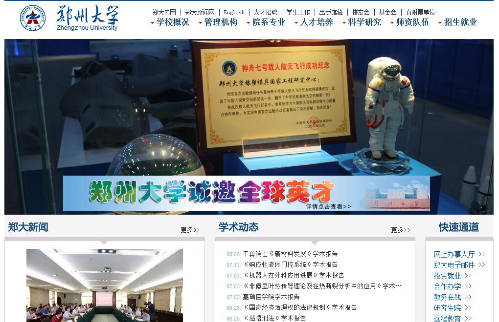 鄭州大學(xué)(簡稱鄭大,英文簡稱:ZZU)由河南省人民政府舉辦,法定住所地為河南省鄭州市科學(xué)大道100號。學(xué)??傉嫉孛娣e5700余畝,現(xiàn)有四個校區(qū):主校區(qū)(鄭州市科學(xué)大道100號)、南校區(qū)(鄭州市大學(xué)北路75號)、北校區(qū)(鄭州市文化路97號)和東校區(qū)(鄭州市大學(xué)北路40號)。學(xué)校面向全國招生,現(xiàn)有全日制普通本科生5.4萬余人、各類在校研究生(含非全日制)1.9萬余人,以及來自91個國家和地區(qū)的留學(xué)生近2000人。鄭州大學(xué)是國家“211工程”重點(diǎn)建設(shè)高校、一流大學(xué)建設(shè)高校和“部省合建”高校。站在新的歷史起點(diǎn)上,學(xué)校確立了綜合性研究型的辦學(xué)定位,提出了一流大學(xué)建設(shè)“三步走”發(fā)展戰(zhàn)略,力爭到本世紀(jì)中葉建成世界一流綜合性研究型大學(xué)。鄭州大學(xué)醫(yī)科教育源于1928年的國立第五中山大學(xué),1952年河南醫(yī)學(xué)院獨(dú)立建院,開啟了河南醫(yī)學(xué)高等教育的先河;原鄭州大學(xué)創(chuàng)建于1956年,是新中國創(chuàng)辦的第一所綜合性大學(xué),1996年被列入國家“211工程”重點(diǎn)建設(shè)高校;鄭州工業(yè)大學(xué)成立于1963年,是原化工部直屬的重點(diǎn)院校。2000年7月,原鄭州大學(xué)、鄭州工業(yè)大學(xué)和河南醫(yī)科大學(xué)三校合并組建新鄭州大學(xué)。教育家、歷史學(xué)家、哲學(xué)家嵇文甫教授,物理學(xué)家霍秉權(quán)教授,化學(xué)家侯德榜教授,耐火材料專家鐘香崇院士,土木工程專家孫國梁教授,耳鼻咽喉科專家董民聲教授,食管細(xì)胞學(xué)創(chuàng)始人沈瓊教授,人體寄生蟲學(xué)專家蘇壽汦教授等一大批知名專家學(xué)者,都曾在此弘文勵教。悠久歷史鑄就鄭大特色文化。植根中原文化的博大精深和沉穩(wěn)厚重,形成鄭大人包容寬厚、奮發(fā)進(jìn)取的優(yōu)良品質(zhì);匯聚多元文化的交融共生,學(xué)生來自全國31個省市自治區(qū)、世界91個國家和地區(qū),形成多地域、多民族、多文化交流融合的文化氛圍;文、理、工、醫(yī)等12個學(xué)科門類均衡發(fā)展,形成多學(xué)科交叉、相融互補(bǔ)的育人氛圍;傳承和弘揚(yáng)源遠(yuǎn)流長的特色文化,三個老校區(qū)的特色文化長期積淀與升華,孕育了“求是擔(dān)當(dāng)”的鄭大使命與精神,形成“篤信仁厚、慎思勤勉”的鄭大校風(fēng)。在強(qiáng)化自身文化建設(shè)的同時,學(xué)校注重發(fā)揮文化引領(lǐng)的社會職責(zé),努力為華夏文明傳承創(chuàng)新做出新的貢獻(xiàn)。 融合發(fā)展完成綜合性大學(xué)布局。學(xué)校設(shè)有哲學(xué)、經(jīng)濟(jì)學(xué)、法學(xué)、教育學(xué)、文學(xué)、歷史學(xué)、理學(xué)、工學(xué)、農(nóng)學(xué)、醫(yī)學(xué)、管理學(xué)、藝術(shù)學(xué)12大學(xué)科門類,各學(xué)科門類均衡發(fā)展;有臨床醫(yī)學(xué)、材料科學(xué)與工程、化學(xué)3個一流建設(shè)學(xué)科;有凝聚態(tài)物理、材料加工工程、中國古代史、有機(jī)化學(xué)、化學(xué)工藝、病理學(xué)與病理生理學(xué)6個國家重點(diǎn)(培育)學(xué)科;化學(xué)、材料科學(xué)、臨床醫(yī)學(xué)、工程學(xué)、藥理學(xué)與毒理學(xué)、生物學(xué)與生物化學(xué)6個學(xué)科(領(lǐng)域)ESI排名全球前1%,化學(xué)、臨床醫(yī)學(xué)ESI排名進(jìn)入全球前3‰;ESI學(xué)術(shù)機(jī)構(gòu)全球排名第910位,位列全國高校第46位。學(xué)校有30個一級學(xué)科博士學(xué)位授權(quán)點(diǎn)、2個博士專業(yè)學(xué)位授權(quán)點(diǎn)、59個一級學(xué)科碩士學(xué)位授權(quán)點(diǎn)、25個碩士專業(yè)學(xué)位授權(quán)點(diǎn)、19個工程碩士領(lǐng)域、24個博士后科研流動站?,F(xiàn)有教職工5700余人,其中兩院院士、學(xué)部委員11人,海外院士4人;“國家杰出青年科學(xué)基金”獲得者7人、長江學(xué)者7人、國家“百千萬人才工程”人選24人、國家“千人計(jì)劃”人選7人,教授752人,具有博士學(xué)位教師2174人,形成了一支以院士和學(xué)術(shù)大師為引領(lǐng),以“杰青”“長江”等為學(xué)術(shù)帶頭人,青年博士為骨干的人才隊(duì)伍。中國工程院何季麟院士擔(dān)任河南省資源與材料工業(yè)技術(shù)研究院院長,英國醫(yī)學(xué)科學(xué)院院士、中國工程院外籍院士尼克?萊蒙擔(dān)任鄭州大學(xué)醫(yī)學(xué)科學(xué)院院長,南振中先生、張海先生、二月河先生等執(zhí)教我校。立德樹人形成完備人才培養(yǎng)體系。學(xué)校校本部現(xiàn)有46個院系,114個本科專業(yè)。學(xué)?,F(xiàn)有國家級教學(xué)團(tuán)隊(duì)4個,國家級教學(xué)名師6人,國家級專業(yè)綜合改革試點(diǎn)專業(yè)6個,國家級特色專業(yè)14個,通過國際工程教育認(rèn)證專業(yè)11個,國家級實(shí)驗(yàn)教學(xué)示范中心5個,國家級虛擬仿真實(shí)驗(yàn)中心1個,國家級工程實(shí)踐教育中心7個,國家級精品課程14門,國家級精品視頻公開課4門,國家級精品資源共享課14門,國家級雙語教學(xué)示范課程2門,國家精品在線開放課程2門,國家級人才培養(yǎng)模式創(chuàng)新實(shí)驗(yàn)區(qū)2個,國家理科基礎(chǔ)科學(xué)研究和教學(xué)人才培養(yǎng)基地1個、國家大學(xué)