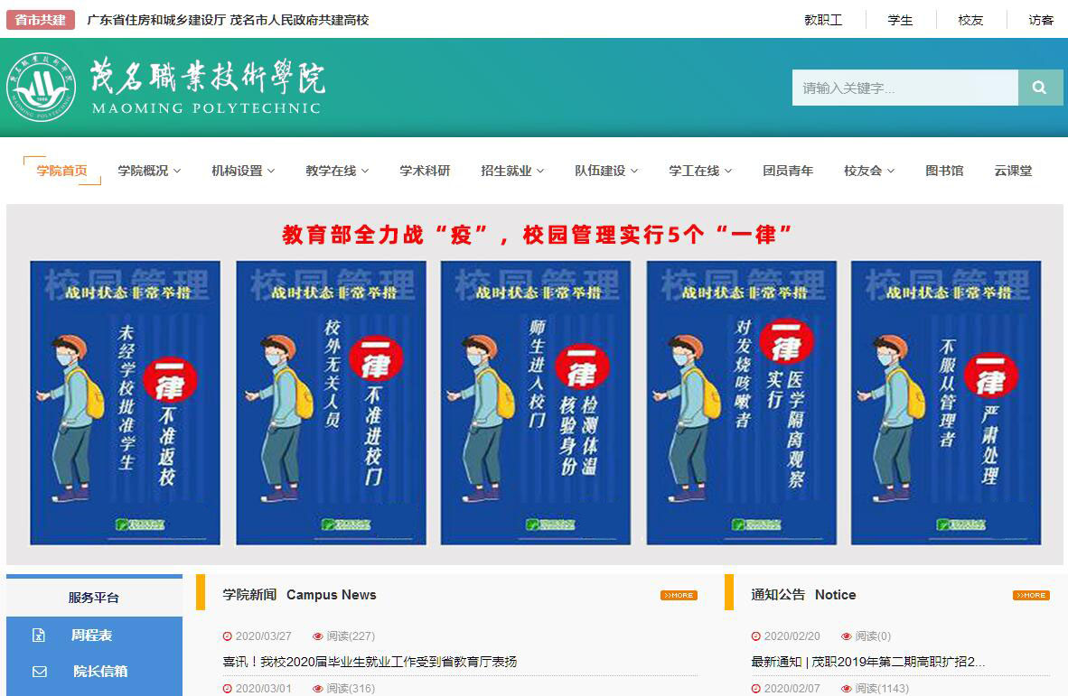 茂名職業(yè)技術(shù)學(xué)院是廣東省住房和城鄉(xiāng)建設(shè)廳、茂名市人民政府共建高校,2004年經(jīng)廣東省人民政府批準(zhǔn)成立,是茂名市第一所全日制公辦高等職業(yè)技術(shù)院校,學(xué)校前身是創(chuàng)建于1986年的國家重點(diǎn)中專學(xué)校茂名市建設(shè)中等專業(yè)學(xué)校。學(xué)校秉持“修德 強(qiáng)技 求實(shí) 創(chuàng)新”校訓(xùn),確立“價(jià)值觀+知識(shí)+技能+創(chuàng)新”四位一體人才培養(yǎng)目標(biāo),注重培養(yǎng)學(xué)生的職業(yè)能力、創(chuàng)新精神和創(chuàng)業(yè)能力,大力推進(jìn)工學(xué)結(jié)合,校企合作,以培養(yǎng)生產(chǎn)、服務(wù)、管理第一線的高級(jí)技術(shù)技能人才為己任,先后為社會(huì)輸送了4萬余名畢業(yè)生。學(xué)?,F(xiàn)有文明北、水東灣新城和人民南三個(gè)校區(qū),現(xiàn)有校園面積1003.79畝,建筑面積215886.61平方米,其中教學(xué)行政用房面積106302.4平方米,學(xué)生宿舍面積83315平方米,體育場(館)面積6.2萬平方米,教科研儀器設(shè)備值約5500萬元,圖書館館藏紙質(zhì)圖書達(dá)到56萬多冊(cè),中文期刊342種、外文期刊4種、報(bào)紙40種、電子圖書33萬余種、數(shù)據(jù)庫8個(gè)。有省級(jí)實(shí)訓(xùn)基地6個(gè),校內(nèi)實(shí)訓(xùn)室127個(gè),與企業(yè)合作共建的校外實(shí)訓(xùn)基地175個(gè)。建有工程測量、化學(xué)檢驗(yàn)、數(shù)控車床、電工、電氣設(shè)備安裝等13個(gè)工種的國家職業(yè)資格鑒定考點(diǎn),是全國職業(yè)核心能力示范培訓(xùn)試點(diǎn)單位。2016年6月,經(jīng)中國建設(shè)教育協(xié)會(huì)審批,在學(xué)校設(shè)立粵西地區(qū)唯一一個(gè)全國BIM應(yīng)用技能考點(diǎn)。學(xué)?,F(xiàn)有全日制普通高職在校學(xué)生14000余人,專任教師560余人,教授、副教授及其他高級(jí)職稱教師130余人,具有博士、碩士學(xué)位教師340余人,雙師素質(zhì)教師320余人,聘請(qǐng)國內(nèi)外高等院校、科研院所及知名企業(yè)等專家學(xué)者擔(dān)任客座教授50人,外聘兼職教師300余人。學(xué)校現(xiàn)設(shè)有土木工程系、化學(xué)工程系、機(jī)電信息系、經(jīng)濟(jì)管理系、計(jì)算機(jī)工程系、人文與傳媒系、社科基礎(chǔ)部、成人教育部、中專部(中專學(xué)校)等9個(gè)教學(xué)系(部),開設(shè)有建筑工程技術(shù)、建筑工程管理、道路橋梁工程技術(shù)、供熱通風(fēng)與空調(diào)工程技術(shù)、石油化工技術(shù)、應(yīng)用化工技術(shù)、機(jī)械制造與自動(dòng)化、電氣自動(dòng)化技術(shù)、會(huì)計(jì)電算化、電子商務(wù)、旅游管理、計(jì)算機(jī)應(yīng)用技術(shù)、計(jì)算機(jī)通訊、社會(huì)工作等39個(gè)專業(yè)(共49個(gè)專業(yè)方向)。專業(yè)結(jié)構(gòu)和布局與廣東省和茂名市經(jīng)濟(jì)增長點(diǎn)的需求相匹配,形成了“以工學(xué)為主,文、理、經(jīng)濟(jì)、管理等多學(xué)科協(xié)調(diào)發(fā)展”的專業(yè)格局。學(xué)校緊密結(jié)合地方經(jīng)濟(jì)社會(huì)發(fā)展?fàn)顩r,緊密依托行業(yè)企業(yè),開展多形式、多途徑的校企合作,形成了“對(duì)接、合作、共贏”的良好局面,先后與深圳地鐵、寶鋼鋼鐵、蒂森克虜伯電梯有限公司、中石化、富士康C次集團(tuán)、萬豪國際等多家世界500強(qiáng)企業(yè)下屬公司簽訂了校企合作聯(lián)合培養(yǎng)協(xié)議,設(shè)立訂單班、冠名班、現(xiàn)代學(xué)徒制試點(diǎn)班等78個(gè),與企業(yè)合辦混合所有制二級(jí)學(xué)院4個(gè)。學(xué)校重視學(xué)生創(chuàng)新精神和創(chuàng)業(yè)能力培養(yǎng),近年來,學(xué)生400余人次在省級(jí)以上技能大賽中獲獎(jiǎng),其中50余人次獲得國家級(jí)、省級(jí)一等獎(jiǎng)。畢業(yè)生深受用人單位歡迎,歷屆畢業(yè)生總體就業(yè)率均達(dá)97%以上,連續(xù)6年位居全省??茖哟卧盒G傲校瑩?jù)廣東省教育廳發(fā)布的就業(yè)數(shù)據(jù),2014年至2016年,我校畢業(yè)生初次就業(yè)率分別為97.45%、97.40%、97.36%,均高出全省??聘咝?個(gè)百分點(diǎn)。據(jù)中國首家高等教育管理數(shù)據(jù)與咨詢的專業(yè)公司麥可思研究院對(duì)畢業(yè)生的社會(huì)需求與培養(yǎng)質(zhì)量進(jìn)行的第三方數(shù)據(jù)調(diào)查及分析結(jié)果表明,2012年以來,我校畢業(yè)生整體就業(yè)率、畢業(yè)半年后收入、工作與專業(yè)相關(guān)度、職業(yè)吻合度、總體就業(yè)現(xiàn)狀滿意度等指標(biāo)均高于本省高職院校平均值。 “十三五”期間,學(xué)校將牢牢把握國家大力發(fā)展職業(yè)教育的戰(zhàn)略發(fā)展機(jī)遇,以“四個(gè)堅(jiān)持、三個(gè)支撐、兩個(gè)走在前列”為統(tǒng)領(lǐng),緊緊圍繞“一帶一路”、創(chuàng)新驅(qū)動(dòng)及產(chǎn)業(yè)轉(zhuǎn)型升級(jí),大力推進(jìn)創(chuàng)新發(fā)展、內(nèi)涵發(fā)展、特色發(fā)展,努力把學(xué)校建設(shè)成為以工科為主,特色鮮明,優(yōu)勢明顯的粵東西北一流高職院校。