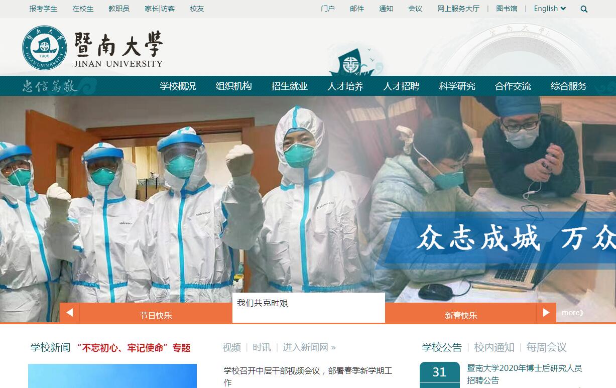 暨南大學(xué)是中國第一所由政府創(chuàng)辦的華僑學(xué)府,是國務(wù)院僑辦、教育部、廣東省共建的“211工程”重點綜合性大學(xué),直屬國務(wù)院僑辦領(lǐng)導(dǎo)?!棒吣稀倍殖鲎浴渡袝び碡暋罚骸皷|漸于海,西被于流沙,朔南暨,聲教訖于四海?!币饧疵嫦蚰涎?,將中華文化遠(yuǎn)播到五洲四海。學(xué)校的前身是1906年清政府創(chuàng)立于南京的暨南學(xué)堂。后遷至上海,1927年更名為國立暨南大學(xué)。抗日戰(zhàn)爭期間,遷址福建建陽。1946年遷回上海,1949年8月合并于復(fù)旦大學(xué)、交通大學(xué)等高校。新中國成立后,暨南大學(xué)于1958年在廣州重建,“文革”期間一度停辦,1978年在廣州復(fù)辦。改革開放后,學(xué)校快速發(fā)展。1996年6月,暨南大學(xué)成為全國面向21世紀(jì)重點建設(shè)的大學(xué)。2011年4月,國務(wù)院僑辦、教育部、廣東省政府簽署共建暨南大學(xué)協(xié)議。2015年6月,學(xué)校入選廣東省高水平大學(xué)重點建設(shè)高校。2017年9月,學(xué)校入選國家“雙一流”建設(shè)高校。素有“華僑最高學(xué)府”之稱的暨南大學(xué),恪守“忠信篤敬”之校訓(xùn),注重以中華民族優(yōu)秀的傳統(tǒng)道德文化培養(yǎng)造就人才。學(xué)校積極貫徹“面向海外,面向港澳臺”的辦學(xué)方針,建校至今,共培養(yǎng)了來自世界五大洲170多個國家和港澳臺地區(qū)的各類人才30余萬人,堪稱桃李滿天下。作為中國歷史最悠久的大學(xué)之一,暨南大學(xué)在中國高等教育史上有著重要地位:第一所由國家創(chuàng)辦的華僑高等學(xué)府,校名一直沿用的百年名校之一,全國首批試行學(xué)分制的高校,最早在綜合性大學(xué)里開辦醫(yī)學(xué)院的大學(xué),最早設(shè)立華僑華人問題研究機構(gòu)的大學(xué),最早創(chuàng)設(shè)商科的大學(xué)……目前,學(xué)校學(xué)科齊全,文理工醫(yī)兼?zhèn)洌O(shè)有36個學(xué)院,有62個系,17個直屬研究院(所);有本科專業(yè)94個,碩士學(xué)位授權(quán)一級學(xué)科點41個,博士學(xué)位授權(quán)一級學(xué)科點23個,專業(yè)學(xué)位授權(quán)類別27種;有博士后流動站16個,博士后科研工作站1個。近年來,在師生的努力下,學(xué)校學(xué)科建設(shè)和實力明顯提升。目前,學(xué)校有國家二級重點學(xué)科4個、國務(wù)院僑辦重點學(xué)科8個、國家中醫(yī)藥管理局重點學(xué)科2個、廣東省一級學(xué)科重點學(xué)科21個、廣東省二級學(xué)科重點學(xué)科4個。學(xué)校的工程學(xué)、化學(xué)、臨床醫(yī)學(xué)、藥理與毒理學(xué)、材料科學(xué)、生物學(xué)與生物化學(xué)、農(nóng)業(yè)科學(xué)、環(huán)境/生態(tài)學(xué)8個學(xué)科進(jìn)入ESI世界排名前1%。2013年1月教育部公布的全國高校學(xué)科評估排名中,我校7個一級學(xué)科上榜,其中應(yīng)用經(jīng)濟(jì)學(xué)、新聞傳播學(xué)、中藥學(xué)并列全國第五,中國語言文學(xué)、統(tǒng)計學(xué)并列全國第八,基礎(chǔ)醫(yī)學(xué)列第十一,光學(xué)工程列第十四。學(xué)校師資力量雄厚,結(jié)構(gòu)優(yōu)化,有專任教師2148人,其中中國科學(xué)院院士2人,中國工程院院士5人,長江學(xué)者(含特聘、講座、青年長江)21人,千人計劃入選者(含青年千人)25人,杰青、優(yōu)青獲得者33人,“珠江學(xué)者”36人,正高級職稱601人,副高級職稱839人,博士生導(dǎo)師623人,碩士生導(dǎo)師1270人。學(xué)校的辦學(xué)影響日益擴(kuò)大,面向全國31個?。ㄊ?、自治區(qū))招生,已經(jīng)成為海外華裔及港澳臺地區(qū)學(xué)生報考深造首選的熱門高校,也是國內(nèi)規(guī)模最大的港澳臺僑高素質(zhì)人才培養(yǎng)基地。學(xué)校有國家級特色專業(yè)8個,國家級人才培養(yǎng)模式創(chuàng)新實驗區(qū)1個,國家級專業(yè)綜合改革試點2項,國家級實驗教學(xué)示范中心3個,國家級大學(xué)生校外實踐教育基地3個,國家級精品在線開放課程2門,國家級精品課程(含雙語教學(xué)示范課程)8門,國家級精品視頻公開課5門,國家級精品資源共享課5門,教育部來華留學(xué)英語授課品牌課程4門,是國家大學(xué)生文化素質(zhì)教育基地、國家對外漢語教學(xué)基地、國務(wù)院僑辦華文教育基地。學(xué)校目前有全日制學(xué)生36222人,其中本科生25862人,研究生10360人,來自114個不同國家和地區(qū)在校華僑、港澳臺和外國留學(xué)生11745人。學(xué)校校園文化豐富多彩,社團(tuán)活動精彩紛呈,創(chuàng)新創(chuàng)業(yè)氛圍濃厚,學(xué)生在“挑戰(zhàn)杯”、全國大學(xué)生創(chuàng)業(yè)大賽、全國大運會等多種國內(nèi)外文體藝等賽事中屢創(chuàng)佳績,暨南健兒蘇炳添、陳艾森等在奧運會等重大國際賽事上為國爭光,令國人振奮。學(xué)校入選全國首批深化創(chuàng)新創(chuàng)業(yè)教育改革示范高校。暨大畢業(yè)生深受海內(nèi)外用人單位好評,就業(yè)率一直位居同類院校前列。學(xué)??蒲袑嵙χ鸩皆鰪?,現(xiàn)設(shè)有國家部省級科研平臺83個??蒲谐晒T果累累,學(xué)校近年獲得國家科技進(jìn)步獎3項,國家技術(shù)發(fā)明獎1項,國際科技合作獎1項,國家自然科學(xué)基金項目立項數(shù)、SCI等權(quán)威索引收錄的國際論文數(shù)量持續(xù)增長;2011-2017年,學(xué)校共獲批國家社科基金重大