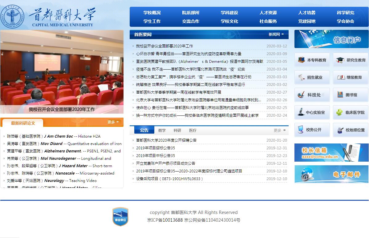 首都醫(yī)科大學(xué)建校于1960年,是北京市重點(diǎn)高等院校,北京市政府、國家衛(wèi)生健康委員會、教育部共建院校。已故著名泌尿外科專家、兩院院士、全國人大常委會副委員長吳階平教授為首任校長?,F(xiàn)任黨委書記為呼文亮研究員,校長為著名生物化學(xué)與分子生物學(xué)家、中國科學(xué)院院士尚永豐教授。學(xué)校校本部設(shè)有10個學(xué)院、1個學(xué)部、1個研究中心和1所附屬衛(wèi)生學(xué)校,包括基礎(chǔ)醫(yī)學(xué)院、藥學(xué)院、公共衛(wèi)生學(xué)院、護(hù)理學(xué)院、生物醫(yī)學(xué)工程學(xué)院、中醫(yī)藥學(xué)院、衛(wèi)生管理與教育學(xué)院、全科醫(yī)學(xué)與繼續(xù)教育學(xué)院、馬克思主義學(xué)部、國際學(xué)院、燕京醫(yī)學(xué)院,腦重大疾病研究中心,附屬衛(wèi)生學(xué)校。學(xué)?,F(xiàn)有19所附屬醫(yī)院、21所臨床醫(yī)學(xué)院,包括首都醫(yī)科大學(xué)宣武醫(yī)院(第一臨床醫(yī)學(xué)院)、附屬北京友誼醫(yī)院(第二臨床醫(yī)學(xué)院)、附屬北京朝陽醫(yī)院(第三臨床醫(yī)學(xué)院)、附屬北京同仁醫(yī)院(第四臨床醫(yī)學(xué)院)、附屬北京天壇醫(yī)院(第五臨床醫(yī)學(xué)院)、附屬北京安貞醫(yī)院(第六臨床醫(yī)學(xué)院)、附屬復(fù)興醫(yī)院(第八臨床醫(yī)學(xué)院)、附屬北京佑安醫(yī)院(第九臨床醫(yī)學(xué)院)、附屬北京胸科醫(yī)院(第十臨床醫(yī)學(xué)院)、首都醫(yī)科大學(xué)三博腦科醫(yī)院(第十一臨床醫(yī)學(xué)院)、附屬北京地壇醫(yī)院(第十二臨床醫(yī)學(xué)院)、附屬北京兒童醫(yī)院(兒科醫(yī)學(xué)院)、附屬北京口腔醫(yī)院(口腔醫(yī)學(xué)院)、附屬北京安定醫(yī)院(精神衛(wèi)生學(xué)院)、附屬北京婦產(chǎn)醫(yī)院(婦產(chǎn)醫(yī)學(xué)院)、附屬北京中醫(yī)醫(yī)院(中醫(yī)藥臨床醫(yī)學(xué)院)、附屬北京世紀(jì)壇醫(yī)院(腫瘤醫(yī)學(xué)院)、附屬北京康復(fù)醫(yī)院(北京康復(fù)醫(yī)學(xué)院)、附屬北京潞河醫(yī)院(潞河臨床醫(yī)學(xué)院)、中國康復(fù)研究中心(康復(fù)醫(yī)學(xué)院)、中日友好醫(yī)院(中日友好臨床醫(yī)學(xué)院),以及預(yù)防醫(yī)學(xué)教學(xué)基地(北京市疾病預(yù)防控制中心)。學(xué)校還設(shè)有38個臨床??茖W(xué)院、??茖W(xué)系。學(xué)校現(xiàn)有全日制在校生12098人,其中研究生4388人,本科生5092人,高專高職生1968人,留學(xué)生650人;成教生3619人。學(xué)校和附屬醫(yī)院現(xiàn)有教職員工和醫(yī)務(wù)人員42467人(校本部1538人,附屬醫(yī)院40929人),其中有院士7人;正高職稱2315人,副高職稱3715人;教授843人,副教授1238人;博士生導(dǎo)師673人,碩士生導(dǎo)師1113人。學(xué)?,F(xiàn)有8個國家重點(diǎn)學(xué)科,2個國家重點(diǎn)(培育)學(xué)科;60個國家臨床重點(diǎn)??疲ê嗅t(yī));14個國家中醫(yī)藥管理局重點(diǎn)(培育)學(xué)科;4個北京市一級重點(diǎn)學(xué)科,6個北京市二級重點(diǎn)學(xué)科,1個北京市重點(diǎn)交叉學(xué)科,1個北京地區(qū)高等學(xué)校學(xué)科群。6個國家臨床醫(yī)學(xué)研究中心,1個國家兒童醫(yī)學(xué)中心,1個省部共建國家重點(diǎn)實(shí)驗(yàn)室培育基地,4個教育部重點(diǎn)實(shí)驗(yàn)室,1個國家工程實(shí)驗(yàn)室,53個北京市重點(diǎn)實(shí)驗(yàn)室。學(xué)校臨床醫(yī)學(xué)、神經(jīng)科學(xué)與行為學(xué)、藥理學(xué)與毒理學(xué)、免疫學(xué)、生物學(xué)與生物化學(xué)、分子生物學(xué)與遺傳學(xué)、社會科學(xué)總論7個學(xué)科進(jìn)入ESI學(xué)科全球前1%排名,其中,臨床醫(yī)學(xué)進(jìn)入ESI學(xué)科前1‰。有8個一級學(xué)科博士學(xué)位授權(quán)點(diǎn)和13個一級學(xué)科碩士學(xué)位授權(quán)點(diǎn);按照三級學(xué)科統(tǒng)計(jì),有59個博士學(xué)位授權(quán)點(diǎn)和78個碩士學(xué)位授權(quán)點(diǎn);具有所有醫(yī)學(xué)及醫(yī)學(xué)相關(guān)學(xué)科的碩士、博士專業(yè)學(xué)位授予權(quán)。有9個博士后科研流動站。學(xué)校設(shè)置的長學(xué)制專業(yè)有臨床醫(yī)學(xué)、兒科學(xué)和口腔醫(yī)學(xué);本科專業(yè)有臨床醫(yī)學(xué)、基礎(chǔ)醫(yī)學(xué)、口腔醫(yī)學(xué)、兒科學(xué)、預(yù)防醫(yī)學(xué)、精神醫(yī)學(xué)、藥學(xué)、臨床藥學(xué)、中醫(yī)學(xué)、中藥學(xué)、護(hù)理學(xué)、生物醫(yī)學(xué)工程、假肢矯形工程、康復(fù)治療學(xué)、聽力與言語康復(fù)學(xué)、公共事業(yè)管理(衛(wèi)生管理)、法學(xué)(衛(wèi)生法學(xué))、醫(yī)學(xué)實(shí)驗(yàn)技術(shù)、醫(yī)學(xué)檢驗(yàn)技術(shù)、醫(yī)學(xué)影像技術(shù)、信息管理與信息系統(tǒng)(衛(wèi)生信息管理)21個。高職高專教育設(shè)有護(hù)理、醫(yī)學(xué)檢驗(yàn)技術(shù)、藥學(xué)等14個專業(yè)。學(xué)校培養(yǎng)醫(yī)學(xué)與醫(yī)學(xué)相關(guān)學(xué)科的學(xué)術(shù)型和應(yīng)用型人才,形成了全方位、多層次、創(chuàng)新型人才培養(yǎng)模式。學(xué)校目前有教育部、國家衛(wèi)生健康委員會“卓越醫(yī)生教育培養(yǎng)計(jì)劃”試點(diǎn)項(xiàng)目6個;7個國家級特色專業(yè)和10個市級特色專業(y