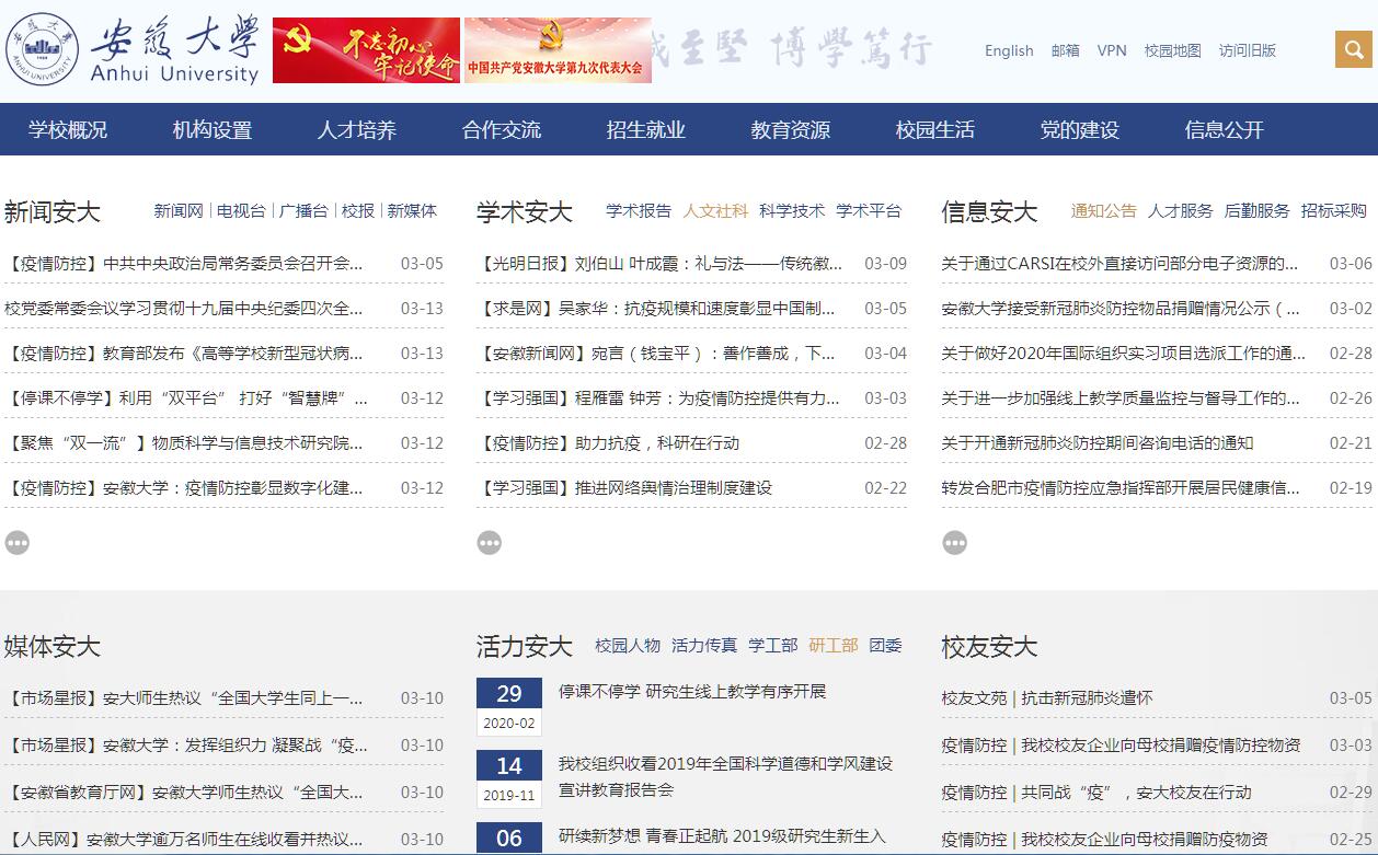 安徽大學(xué)(Anhui University)是國家“雙一流”建設(shè)高校,安徽省人民政府與教育部共建高校,安徽省屬重點(diǎn)綜合性大學(xué)。作為安徽現(xiàn)代高等教育的開端,學(xué)校創(chuàng)建于1928年當(dāng)時(shí)省會(huì)安慶市??箲?zhàn)期間,學(xué)校被迫西遷,并一度流散,1946年復(fù)校,為國立安徽大學(xué)。1949年12月遷至蕪湖,幾經(jīng)調(diào)整,學(xué)校于1956年遷建合肥市,1958年全面恢復(fù)招生。1958年9月16日,毛澤東同志親筆為學(xué)校題寫校名。伴隨著我國改革開放和現(xiàn)代化建設(shè)的偉大進(jìn)程,學(xué)校進(jìn)入歷史上發(fā)展最快最好的時(shí)期,尤其是進(jìn)入國家“211工程”高校建設(shè)行列之后,更是實(shí)現(xiàn)了跨越發(fā)展。學(xué)?,F(xiàn)有四個(gè)校區(qū)和一個(gè)大學(xué)科技園,校園面積達(dá)3200余畝,建筑面積125萬平方米,儀器設(shè)備總值8.18億元,館藏紙質(zhì)圖書350余萬冊?,F(xiàn)有教職工2600余人,其中教學(xué)人員1600余人,副高以上專業(yè)技術(shù)職務(wù)者900余人;國家杰出青年基金、優(yōu)秀青年科學(xué)基金獲得者各1名,教育部“長江學(xué)者”特聘教授1名、青年學(xué)者1名,國家“千人計(jì)劃”入選者2名,國家和省級教學(xué)名師25名,入選“國家百千萬人才工程”3名,國家“萬人計(jì)劃”1名,中宣部文化名家暨“四個(gè)一批”1名,入選教育部新世紀(jì)優(yōu)秀人才支持計(jì)劃12名,入選“皖江學(xué)者”14名,入選安徽省“百人計(jì)劃”6名,入選安徽省“外專百人計(jì)劃”8名,享受國務(wù)院和安徽省政府特殊津貼的專家139名,安徽省學(xué)術(shù)技術(shù)帶頭人和后備人選120名。在校生規(guī)模約28000余人:其中研究生6000余人,全日制本、??粕?1800余人。學(xué)校有13個(gè)博士后科研流動(dòng)站、15個(gè)博士學(xué)位授權(quán)一級學(xué)科、1個(gè)博士學(xué)位授權(quán)二級學(xué)科、32個(gè)碩士學(xué)位授權(quán)一級學(xué)科、2個(gè)碩士學(xué)位授權(quán)二級學(xué)科、28個(gè)專業(yè)碩士學(xué)位授權(quán)類別;設(shè)有26個(gè)院(系、部),95個(gè)本科專業(yè);涉及理學(xué)、工學(xué)、文學(xué)、歷史學(xué)、哲學(xué)、經(jīng)濟(jì)學(xué)、法學(xué)、管理學(xué)、教育學(xué)、藝術(shù)學(xué)等10個(gè)學(xué)科門類?,F(xiàn)有1個(gè)學(xué)科群入選國家“世界一流建設(shè)學(xué)科”,有2個(gè)國家級重點(diǎn)學(xué)科、25個(gè)省級重點(diǎn)學(xué)科;建有2個(gè)國家地方聯(lián)合工程實(shí)驗(yàn)室(研究中心)、1個(gè)教育部人文社科重點(diǎn)研究基地、2個(gè)教育部重點(diǎn)實(shí)驗(yàn)室、1個(gè)教育部工程研究中心和1個(gè)獲得國家CMA計(jì)量認(rèn)證的現(xiàn)代實(shí)驗(yàn)技術(shù)中心,1個(gè)國家級“2011協(xié)同創(chuàng)新中心”分中心;有1個(gè)省技術(shù)創(chuàng)新中心,13個(gè)省級重點(diǎn)實(shí)驗(yàn)室、工程實(shí)驗(yàn)室,6個(gè)省級高校人文社科重點(diǎn)研究基地,9個(gè)省級工程技術(shù)研究中心、3個(gè)省級科技創(chuàng)新公共服務(wù)平臺(tái)和2個(gè)國家級大學(xué)生校外實(shí)踐教育基地,設(shè)有4個(gè)國家級和9個(gè)省級實(shí)驗(yàn)教學(xué)(實(shí)訓(xùn))示范中心。建校以來,學(xué)校已為國家和地方建設(shè)輸送30余萬名優(yōu)秀畢業(yè)生。學(xué)校分別與省內(nèi)16個(gè)市簽訂了多層次的校市合作協(xié)議,與50多家大中型企業(yè)建立了緊密的合作關(guān)系,與600多家企業(yè)保持多種形式的產(chǎn)學(xué)研合作關(guān)系,為地方經(jīng)濟(jì)社會(huì)發(fā)展提供多方面的服務(wù),已成為研究與解決安徽經(jīng)濟(jì)建設(shè)、社會(huì)發(fā)展重大問題的主要基地。學(xué)校是外交部選拔錄用公務(wù)員定點(diǎn)高校,為外交部輸送了眾多專門人才。學(xué)校是國家公布的華文教育基地和接收政府獎(jiǎng)學(xué)金留學(xué)生的高校之一,與美、英、德、日等國家和地區(qū)的130余所高校和科研機(jī)構(gòu)建立了交流合作關(guān)系,與智利圣托馬斯大學(xué)、烏克蘭哈爾科夫大學(xué)、阿塞拜疆巴庫大學(xué)合作設(shè)立3所孔子學(xué)院,建立海外“中國中心”7個(gè)。學(xué)校辦學(xué)歷史悠久、文化底蘊(yùn)深厚,學(xué)科門類齊全、師資力量雄厚,科研特色鮮明、創(chuàng)新氛圍濃郁,校園環(huán)境優(yōu)美、辦學(xué)條件一流,是首屆“全國文明校園”單位,是安徽省高層次人才培養(yǎng)的重要基地和區(qū)域創(chuàng)新體系的一支重要力量,在國內(nèi)高校居于先進(jìn)地位、在國際上具有一定影響。在“至誠至堅(jiān),博學(xué)篤行”的校訓(xùn)精神指引下,一代代安大人潛心耕耘、勵(lì)志踐行,使得學(xué)校的建設(shè)發(fā)展不斷向前推進(jìn)。作為合肥綜合性國家科學(xué)中心教育科研區(qū)核心成員單位和安徽省系統(tǒng)推進(jìn)全面創(chuàng)新改革試驗(yàn)區(qū)建設(shè)試點(diǎn)高校,學(xué)校正全面推進(jìn)“雙一流”建設(shè),努力為現(xiàn)代化五大發(fā)展美好安徽建設(shè)和全面建成小康社會(huì)做出更大貢獻(xiàn)。面向未來,安徽大學(xué)奮發(fā)圖強(qiáng)、開拓創(chuàng)新,正朝著建設(shè)國際知名國內(nèi)一流高水平大學(xu