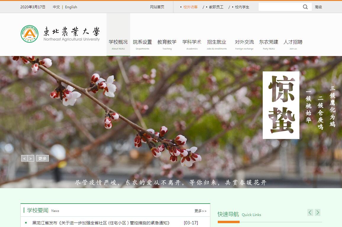 東北農(nóng)業(yè)大學(xué)是一所“以農(nóng)科為優(yōu)勢,以生命科學(xué)和食品科學(xué)為特色,農(nóng)、工、理、經(jīng)、管等多學(xué)科協(xié)調(diào)發(fā)展”的國家“211工程”重點(diǎn)建設(shè)大學(xué)和“世界一流學(xué)科”建設(shè)高校,是黑龍江省人民政府與農(nóng)業(yè)部省部共建大學(xué)、國家“中西部高?;A(chǔ)能力建設(shè)工程”項(xiàng)目入選高校、教育部本科教學(xué)工作水平評估優(yōu)秀院校。學(xué)校1948年創(chuàng)建于哈爾濱,始稱東北農(nóng)學(xué)院,是中國共產(chǎn)黨在解放區(qū)創(chuàng)辦的第一所普通高等農(nóng)業(yè)院校,知名教育家、哈爾濱市第一任市長劉達(dá)為學(xué)校第一任院長。建校以來,先后隸屬于東北行政委員會農(nóng)業(yè)部、國家高等教育部、國家農(nóng)業(yè)部、黑龍江省農(nóng)業(yè)委員會、黑龍江省教育廳,1981年被確定為黑龍江省省屬重點(diǎn)院校,1994年與黑龍江省農(nóng)業(yè)管理干部學(xué)院合并組建東北農(nóng)業(yè)大學(xué)。學(xué)校設(shè)有17個學(xué)院和1個教學(xué)部?,F(xiàn)有3個國家重點(diǎn)學(xué)科,3個國家重點(diǎn)(培育)學(xué)科,2個農(nóng)業(yè)部重點(diǎn)學(xué)科,2個省級重點(diǎn)學(xué)科群,10個省級一級重點(diǎn)學(xué)科,農(nóng)業(yè)科學(xué)、植物學(xué)與動物學(xué)2個學(xué)科進(jìn)入ESI國際學(xué)科排名前1%。學(xué)校是全國首批具有博士、碩士學(xué)位授予權(quán)的高等學(xué)校之一,現(xiàn)有10個博士學(xué)位授權(quán)一級學(xué)科點(diǎn),22個碩士學(xué)位授權(quán)一級學(xué)科點(diǎn);1個博士專業(yè)學(xué)位授權(quán)類別,10個碩士專業(yè)學(xué)位授權(quán)類別;10個博士后科研流動站、2個博士后科研工作站;71個本科專業(yè)。學(xué)?,F(xiàn)有專任教師1294人,其中教授303人、副教授480人;具有博士學(xué)位者772人,具有碩士學(xué)位者442人?,F(xiàn)有中國工程院院士1人,“千人計劃”入選者2人,“萬人計劃”入選者14人(含青年拔尖人才1人),“長江學(xué)者”特聘教授1人,國務(wù)院學(xué)位委員會學(xué)科評議組成員6人,國家杰出青年科學(xué)基金獲得者2人,“百千萬人才工程”國家級人選3人,科技部中青年科技創(chuàng)新領(lǐng)軍人才9人,教育部創(chuàng)新團(tuán)隊(duì)2個,教育部“跨世紀(jì)、新世紀(jì)優(yōu)秀人才支持計劃”入選者10人,國家級教學(xué)團(tuán)隊(duì)2個,國家級教學(xué)名師2人,教育部高等學(xué)校教學(xué)指導(dǎo)委員會分委員會副主任委員2人、委員12人,國家現(xiàn)代農(nóng)業(yè)產(chǎn)業(yè)技術(shù)體系崗位科學(xué)家17人,“龍江學(xué)者”特聘教授18人、講座教授3人,青年“龍江學(xué)者”2人,博士生導(dǎo)師203人。學(xué)?,F(xiàn)有全日制在校生27 134人,其中研究生3 962人、本科生23 017人、外國留學(xué)生155人,是首批“卓越農(nóng)林人才教育培養(yǎng)計劃”項(xiàng)目試點(diǎn)高校。擁有國家級特色專業(yè)10個,國家級人才培養(yǎng)模式創(chuàng)新實(shí)驗(yàn)區(qū)2個,國家級精品課程4門、國家級精品視頻公開課4門、國家級精品資源共享課2門,國家級精品在線開放課程1門,國家級實(shí)驗(yàn)教學(xué)示范中心4個,國家級虛擬仿真實(shí)驗(yàn)教學(xué)中心 1 個,國家級大學(xué)生校外實(shí)踐教育基地4個,教育部、農(nóng)業(yè)部農(nóng)科教合作人才培養(yǎng)基地4個,科技部創(chuàng)新人才培養(yǎng)基地1個,全國高校學(xué)生科技創(chuàng)業(yè)實(shí)習(xí)基地1個;獲得全國“百篇”優(yōu)秀博士學(xué)位論文1篇、提名4篇。學(xué)校是國家現(xiàn)代遠(yuǎn)程教育試點(diǎn)院校,設(shè)有全國重點(diǎn)建設(shè)職業(yè)教育師資培養(yǎng)培訓(xùn)基地。學(xué)校是全國畢業(yè)生就業(yè)典型經(jīng)驗(yàn)高校。建校至今已累計培養(yǎng)各級各類學(xué)生24萬人,其中既有一批站在世界科技前沿的“創(chuàng)新型”人才,也有一批遍布全國的“復(fù)合型”人才,更有一大批活躍在黑龍江省和全國農(nóng)業(yè)生產(chǎn)第一線的“應(yīng)用型”人才。學(xué)?,F(xiàn)有3個國家級工程技術(shù)研究中心,2個教育部重點(diǎn)實(shí)驗(yàn)室,5個農(nóng)業(yè)部重點(diǎn)實(shí)驗(yàn)室、1個農(nóng)業(yè)部區(qū)域試驗(yàn)站、3個農(nóng)業(yè)部農(nóng)業(yè)科學(xué)觀測實(shí)驗(yàn)站,2個農(nóng)業(yè)部科研基地,設(shè)有國家級大學(xué)科技園1個,是高等學(xué)校新農(nóng)村發(fā)展研究院首批建設(shè)院校之一。建校至今,獲得省部級以上科技獎勵500余項(xiàng),其中國家自然科學(xué)獎、發(fā)明獎和科技進(jìn)步獎32項(xiàng);先后9次獲得黑龍江省省長特別獎和重大科技效益獎,18次被中宣部、教育部、團(tuán)中央授予“社會實(shí)踐先進(jìn)集體”榮譽(yù)稱號,3次獲得黑龍江省“振興經(jīng)濟(jì)獎”,2次獲得黑龍江省“糧食生產(chǎn)貢獻(xiàn)獎”,并被授予黑龍江省“小康建設(shè)紅旗集體”榮譽(yù)稱號。學(xué)校堅(jiān)持開放辦學(xué),具有接收中國政府獎學(xué)金來華留學(xué)生資格,設(shè)有教育部赴俄留學(xué)培訓(xùn)基地,是中國東北地區(qū)與俄羅斯遠(yuǎn)東、西伯利亞地區(qū)大學(xué)校長論壇中方秘書處單位