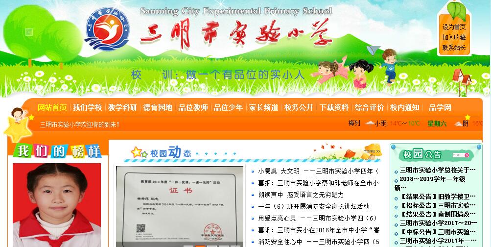 學(xué)校創(chuàng)建于1959年8月,原名三明市列東小學(xué),隸屬于三明市教育局,2004年更名為三明市實驗小學(xué)。學(xué)校集五十二年辦學(xué)之精華,乘教育改革之東風(fēng),秉承“為祖國未來著想,為孩子一生奠基”的辦學(xué)理念,繼承和發(fā)揚優(yōu)良的辦學(xué)傳統(tǒng),與 時俱進,堅持內(nèi)涵提質(zhì),努力培育“文明、好學(xué)、活潑、創(chuàng)新”的校風(fēng),“敬業(yè)、博學(xué)、嚴謹、求新”的教風(fēng),和“勤學(xué)、尊師、思辨、進取”的學(xué)風(fēng)。依法治校, 以德育人,大力推進素質(zhì)教育,不斷深化課程改革,逐步提高辦學(xué)品位,充分發(fā)揮優(yōu)勢,引領(lǐng)示范輻射,全面實施素質(zhì)教育,“以德治校,實踐創(chuàng)新”努力每一個學(xué) 生讓實現(xiàn)“我學(xué)習(xí)、我快樂;我運動,我健康;我思考,我成長?!钡慕逃妇?,長期以來我們以培養(yǎng)的學(xué)生基礎(chǔ)扎實、全面發(fā)展、樂觀向上、成績優(yōu)異贏得社會的 普遍贊譽。目前學(xué)校有36個教學(xué)班,在校生1759人,教職工100人,其中特級教師教師2人,小中高教師4人,小學(xué)高級教師75人,黨員教師36人,專任教師學(xué)歷達標(biāo)率100%,大專以上學(xué)歷教師86人,占教師總數(shù)86%。已達本科學(xué)歷教師65人,占教師總數(shù)65%。按目前發(fā)展?fàn)顩r,再過四年,達大專以上學(xué)歷教師將有98人,占教師總數(shù)98%;達本科學(xué)歷教師85人,占教師總數(shù)85%。 近年來,在市委、市政府和市教育局的關(guān)心支持下,我們?nèi)w實小人齊心協(xié)力,針對學(xué)校所處教育背景、地理位置、辦學(xué)歷史、師資水平、生源素質(zhì)等因素,努力把 握教育發(fā)展的大趨勢及學(xué)校傳統(tǒng),在教育教學(xué)的實踐探索,力爭做到先進教育理論與學(xué)校實際緊密結(jié)合,走出一條適合實小科學(xué)發(fā)展、快速發(fā)展的辦學(xué)路。我們緊緊 圍繞辦學(xué)理念——“為祖國未來著想,為孩子一生奠基”,走出一條深受學(xué)生、家長、社會認同的路子——“輕負擔(dān)、高質(zhì)量、全面發(fā)展”的辦學(xué)路子,讓每一個孩 子在美如畫、暖如家的實小校園過好充實愉快的每一天。在“文明、好學(xué)、活潑、創(chuàng)新”的校風(fēng)和“敬業(yè)、博學(xué)、嚴謹、求新”的教風(fēng)熏陶下,實小領(lǐng)導(dǎo)和教師形成 一種獨具魅力的工作作風(fēng)——時時認真、事事認真。全體實小人敬業(yè)樂教,因為教師樂教,所以愛校、愛學(xué)生;因為樂教,所以敬業(yè),對教育工作孜孜以求、樂此不 疲,潛心從教、矢志不渝;因為敬業(yè)樂教,實小教師做到全身心投入,全力參與,努力進取,不斷完善,不斷發(fā)展,不斷探索,不斷創(chuàng)新。正因為我們有追求的目 標(biāo),有一以貫之的辦學(xué)理念,我們實小教師勤于學(xué)習(xí),轉(zhuǎn)變工作作風(fēng),開拓創(chuàng)新,積極投身教改實踐,形成了勤奮務(wù)實,開拓進取,創(chuàng)新高效的工作機制。近幾年,在市委、市政府和市教育局的關(guān)心支持下,學(xué)校辦學(xué)水平逐年提高,在教育、教學(xué)中形成了自己的特色,并取得了顯著的成績,先后被確立為全國心理健康教 育重點課題實驗校、全國寫字教育實驗校、福建省課改實驗基地校、省中小學(xué)現(xiàn)代教育技術(shù)實驗校、省心理健康教育科研實驗校,并被授予“全國雙學(xué)雙有先進集 體”、“全國科技教育先進單位”、“全國中小學(xué)心理健康教育優(yōu)秀成果先進學(xué)校”、“全國中小學(xué)思想道德建設(shè)活動先進單位”、“全國少年軍校示范?!薄ⅰ案?建省示范小學(xué)”、“福建省先進基層黨組織”、“ 福建省誠信教育進校園活動先進單位”等60多個全國、省級以上榮譽,在社會上享有廣泛的聲譽。2012年初我校又榮獲得了兩項殊榮,獲首屆“福建省未成年人思想道德建設(shè)工作先進單位”稱號,同時被確認為首批省級小學(xué)體育特色學(xué)校與傳統(tǒng)體育學(xué)校稱號。自2009年來學(xué)校獲省市級表彰近30項,33位老師獲省市區(qū)級表彰,其中1人獲省特級教師稱號,1人獲省優(yōu)秀教師稱號,1人獲省學(xué)科帶頭人稱號,3人為省學(xué)科帶頭人培養(yǎng)對象。學(xué)?,F(xiàn)有國家、省、市級模范、優(yōu)秀教師10人;省級小學(xué)特級教師3人,國家、省、地級學(xué)科骨干教師10人。近幾年在省級以上學(xué)科課堂教學(xué)比賽中獲得2個全國二等獎、1個省特等獎、10個省一等獎;在市級各學(xué)科課堂教學(xué)觀摩研討活動中獲得25人次市級一等獎,10多次市級二等獎;被評為省市優(yōu)秀青年教師3名,省市課改先進個人5名,省市學(xué)科帶頭人5名,市教壇新秀4名,市十佳校長、十佳教師各1名,另有80余人次教師獲得區(qū)級以上各種表彰獎勵,學(xué)校已基本建立一支思想素質(zhì)好、業(yè)務(wù)能力強的骨干教師隊伍,在教育教學(xué)教研活動中發(fā)揮示范、輻射作用。學(xué)校樹立了“課研興校”的教學(xué)理念,堅持走“科研興教”之路,提出“問題即課題,教學(xué)即研究,效果即成果”的課題研究新思路,近三年,學(xué)校先后立項開展了16個課題實驗研究,其中國家級課題2 個,省級課題3 個,市級重點課題12個,共70多名教師積極參與課題研究工作。學(xué)