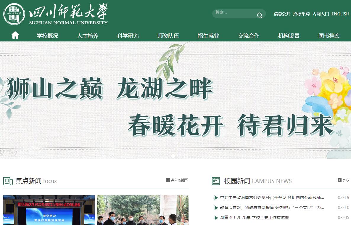 四川師范大學(xué)是四川省屬重點(diǎn)大學(xué)、國(guó)家首批“中西部高校基礎(chǔ)能力建設(shè)工程”實(shí)施高校,是四川省舉辦本科師范教育最早、師范類院校中辦學(xué)歷史最為悠久的大學(xué)。學(xué)校位于四川省省會(huì)——成都市,現(xiàn)有獅子山校區(qū)、成龍校區(qū)、東校區(qū)、廣漢科教園區(qū)四個(gè)校區(qū)。學(xué)校創(chuàng)建于1946年,其誕生與東北大學(xué)有直接的歷史淵源??箲?zhàn)初期,東北大學(xué)內(nèi)遷到四川省三臺(tái)縣辦學(xué)。抗戰(zhàn)勝利后,東北大學(xué)遷回沈陽(yáng),留川師生在原校址上創(chuàng)建了川北農(nóng)工學(xué)院。1949年吸納西山書院,更名為川北大學(xué),1950年合并川北文學(xué)院,遷址四川省南充市。1952年,以川北大學(xué)為主體,合并川東教育學(xué)院(原鄉(xiāng)村建設(shè)學(xué)院)、四川大學(xué)和華西大學(xué)的部分專業(yè),組建四川師范學(xué)院,1956年遷到成都現(xiàn)址。1964年,原成都大學(xué)(現(xiàn)西南財(cái)經(jīng)大學(xué))數(shù)理化三系并入我校。1985年,經(jīng)國(guó)家教育委員會(huì)批準(zhǔn),更名為四川師范大學(xué)。1999年,原煤炭部成都煤炭干部管理學(xué)院整體并入。學(xué)校是全國(guó)首批碩士授權(quán)單位,第十批博士授權(quán)單位,舉辦有文學(xué)、理學(xué)、工學(xué)、哲學(xué)、經(jīng)濟(jì)學(xué)、管理學(xué)、法學(xué)、歷史學(xué)、教育學(xué)、藝術(shù)學(xué)、農(nóng)學(xué)等十一個(gè)學(xué)科門類。建設(shè)有2個(gè)博士后流動(dòng)站、3個(gè)博士學(xué)位授權(quán)一級(jí)學(xué)科、26個(gè)博士學(xué)位授權(quán)點(diǎn)、24個(gè)碩士學(xué)位授權(quán)一級(jí)學(xué)科、12個(gè)碩士專業(yè)學(xué)位授權(quán)類別、82個(gè)本科專業(yè),其中省級(jí)重點(diǎn)學(xué)科建設(shè)項(xiàng)目4個(gè)、一級(jí)學(xué)科省級(jí)重點(diǎn)學(xué)科2個(gè)、二級(jí)學(xué)科省級(jí)重點(diǎn)學(xué)科17個(gè);建設(shè)有教育部人文社科重點(diǎn)研究基地1個(gè)、教育部重點(diǎn)實(shí)驗(yàn)室1個(gè)、四川省重點(diǎn)實(shí)驗(yàn)室1個(gè)、四川省“2011”協(xié)同創(chuàng)新中心3個(gè),四川省哲學(xué)社會(huì)科學(xué)重點(diǎn)研究基地4個(gè),四川省高校重點(diǎn)實(shí)驗(yàn)室、四川省國(guó)別研究中心、四川省工程實(shí)驗(yàn)室10個(gè),建有四川省省級(jí)大學(xué)科技園。建校以來(lái),學(xué)校先后涌現(xiàn)出了以著名墨學(xué)家伍非百、我國(guó)社會(huì)學(xué)和民俗學(xué)的創(chuàng)始人之一李安宅、我國(guó)教育心理學(xué)的創(chuàng)始人之一劉紹禹、楚辭學(xué)專家湯炳正、文獻(xiàn)學(xué)專家屈守元、訓(xùn)詁學(xué)專家劉君惠、凝聚態(tài)物理學(xué)專家趙敏光、拓?fù)鋵W(xué)專家劉旺金、非線性分析專家丁協(xié)平為代表的一批知名專家。學(xué)校教師先后獲評(píng)“國(guó)家有突出貢獻(xiàn)的中青年專家”7人,“國(guó)家百千萬(wàn)人才工程一二層次人選”1人,“國(guó)家萬(wàn)人計(jì)劃領(lǐng)軍人才”1人,“國(guó)家級(jí)教學(xué)名師”1人,教育部“新世紀(jì)優(yōu)秀人才支持計(jì)劃”人選6人,享受“國(guó)務(wù)院政府特殊津貼”專家51人;全國(guó)優(yōu)秀教師、全國(guó)師德標(biāo)兵、全國(guó)模范教師、全國(guó)五一勞動(dòng)獎(jiǎng)?wù)芦@得者、全國(guó)教育系統(tǒng)先進(jìn)工作者等共17人;“四川省有突出貢獻(xiàn)的優(yōu)秀專家”25人,“四川省千人計(jì)劃”4人,“四川省學(xué)術(shù)和技術(shù)帶頭人及后備人選”94人,“四川省教學(xué)名師”12人,四川省優(yōu)秀教師、四川省五一勞動(dòng)獎(jiǎng)?wù)芦@得者、四川省師德標(biāo)兵等共14人;建設(shè)有國(guó)家級(jí)本科教學(xué)團(tuán)隊(duì)1個(gè),省級(jí)本科教學(xué)團(tuán)隊(duì)7個(gè),四川省高水平社科研究團(tuán)隊(duì)2個(gè)。學(xué)校建有國(guó)家級(jí)大學(xué)生文化素質(zhì)教育基地,是全國(guó)深化創(chuàng)新創(chuàng)業(yè)教育改革示范校和國(guó)家級(jí)大學(xué)生創(chuàng)新創(chuàng)業(yè)訓(xùn)練計(jì)劃實(shí)施高校,創(chuàng)辦有1所具有33年歷史的“校中?!薄拇◣煼洞髮W(xué)美育學(xué)校。學(xué)校建有“質(zhì)量工程”國(guó)家級(jí)項(xiàng)目68項(xiàng)、省級(jí)項(xiàng)目280項(xiàng),其中,國(guó)家級(jí)卓越教師培養(yǎng)計(jì)劃項(xiàng)目3項(xiàng),國(guó)家級(jí)特色專業(yè)12個(gè),國(guó)家級(jí)人才培養(yǎng)模式創(chuàng)新實(shí)驗(yàn)區(qū)、國(guó)家級(jí)實(shí)驗(yàn)教學(xué)示范中心、國(guó)家級(jí)教學(xué)團(tuán)隊(duì)、國(guó)家級(jí)大學(xué)生校外實(shí)踐教育基地各1個(gè),國(guó)家級(jí)精品課程、雙語(yǔ)教學(xué)示范課程、精品視頻開(kāi)放課程、精品資源共享課程15門,“十一五”“十二五”國(guó)家級(jí)規(guī)劃教材19部,學(xué)生承擔(dān)國(guó)家級(jí)大學(xué)生創(chuàng)新創(chuàng)業(yè)訓(xùn)練項(xiàng)目326項(xiàng),學(xué)校獲近兩屆(2009、2014年)國(guó)家級(jí)教學(xué)成果二等獎(jiǎng)6項(xiàng)、四川省教學(xué)成果獎(jiǎng)59項(xiàng)(其中一等獎(jiǎng)23項(xiàng))。辦