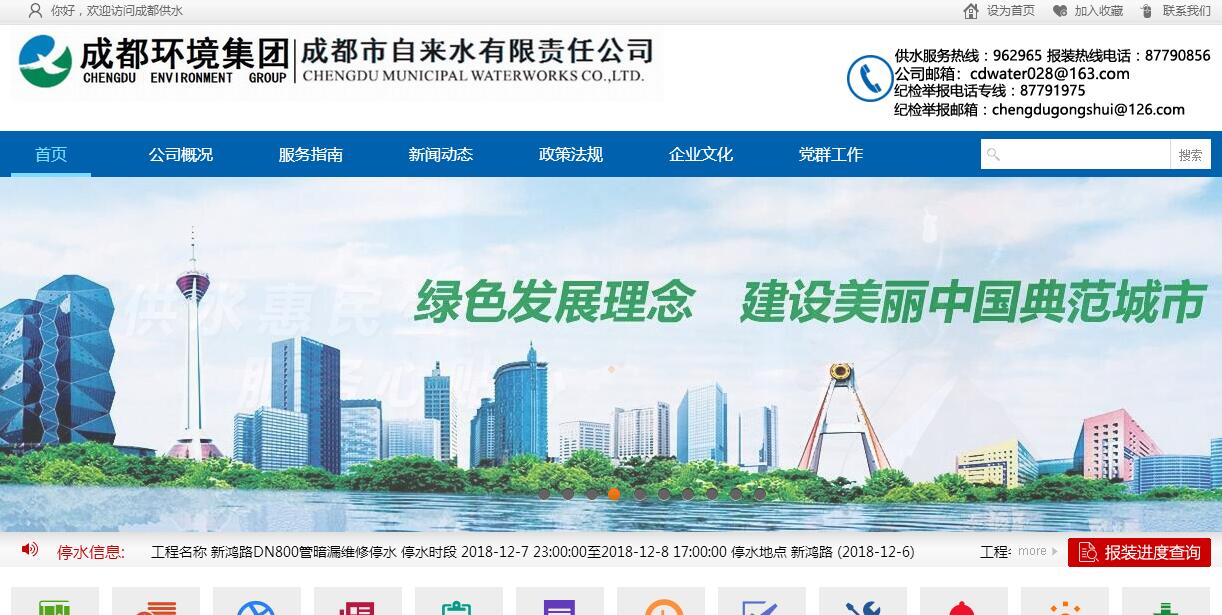 成都市自來(lái)水有限責(zé)任公司隸屬于成都環(huán)境投資集團(tuán)有限公司,始建于1946年,承擔(dān)著成都市中心城區(qū)、天府新區(qū)、周邊部分區(qū)(市)縣及海南省文昌市清瀾地區(qū)的城市供水服務(wù),迄今已經(jīng)歷了七十年的漫長(zhǎng)歲月。七十年來(lái),公司從最初的“人挑自來(lái)水”發(fā)展到成為國(guó)有大型二類供水企業(yè),經(jīng)營(yíng)范圍為自來(lái)水制造、輸配、銷售服務(wù),供水范圍由幾條街發(fā)展到500多平方公里,供水管道長(zhǎng)度由5.7公里發(fā)展到DN100及以上管徑5730公里,供水人口由2.64萬(wàn)人擴(kuò)大到600多萬(wàn)人,日供水能力由0.5萬(wàn)立方米增加到278萬(wàn)立方米。成都市自來(lái)水有限責(zé)任公司秉承七十年發(fā)展的底蘊(yùn),不斷加強(qiáng)經(jīng)營(yíng)管理,提高供水保障能力,改進(jìn)供水水質(zhì),完善供水服務(wù)。2005年,公司整體劃歸成都環(huán)境投資集團(tuán)有限公司,公司供水事業(yè)發(fā)展再次邁上新臺(tái)階,公司圍繞集團(tuán)“5—10年奮力打造全球同行業(yè)知名企業(yè)”和“打造千億級(jí)環(huán)境產(chǎn)業(yè)集團(tuán)”的戰(zhàn)略目標(biāo),努力適應(yīng)外界環(huán)境的變化和客戶需求,按照現(xiàn)代企業(yè)制度的要求,不斷推進(jìn)和深化企業(yè)內(nèi)部改革,加大市場(chǎng)拓展力度,構(gòu)建與成都市國(guó)家中心城市發(fā)展定位相適應(yīng)的城市供水新機(jī)制。公司以創(chuàng)新服務(wù)理念、提升服務(wù)水平為追求目標(biāo),建立以客戶為中心的服務(wù)管理體系,實(shí)現(xiàn)了由生產(chǎn)型企業(yè)向服務(wù)型企業(yè)的轉(zhuǎn)變;公司采用橫向聯(lián)合的方式研發(fā)了國(guó)內(nèi)領(lǐng)先的生產(chǎn)數(shù)據(jù)采集與監(jiān)控(SCADA)系統(tǒng)、供水管網(wǎng)地理信息系統(tǒng)(GIS)、管網(wǎng)水力模型系統(tǒng),依托技術(shù)進(jìn)步滿足快速發(fā)展的成都市用水需求和供水系統(tǒng)安全高效運(yùn)行;建立了完善的水質(zhì)監(jiān)督和監(jiān)測(cè)體系,在西部地區(qū)率先達(dá)到國(guó)內(nèi)《生活飲用水衛(wèi)生標(biāo)準(zhǔn)》全部106項(xiàng)水質(zhì)指標(biāo),并獲得“全國(guó)供水突出貢獻(xiàn)單位”等榮譽(yù);建立了與市場(chǎng)接軌的薪酬管理體系,構(gòu)架了新的職位價(jià)值導(dǎo)向和績(jī)效價(jià)值導(dǎo)向機(jī)制;公司通過(guò)不斷優(yōu)化和持續(xù)改進(jìn),提高了業(yè)務(wù)管理水平和管理效率。成都市自來(lái)水有限責(zé)任公司擁有一支專業(yè)化、知識(shí)化、年輕化的管理團(tuán)隊(duì)和高素質(zhì)的職工隊(duì)伍,77%以上的中層及以上管理人員具有中、高級(jí)技術(shù)職稱。近年來(lái),公司先后榮獲“國(guó)家二級(jí)企業(yè)”、“中國(guó)500家最大工業(yè)企業(yè)”、“全國(guó)建設(shè)系統(tǒng)精神文明先進(jìn)單位”、“全國(guó)創(chuàng)建文明行業(yè)工作先進(jìn)單位”、“全國(guó)質(zhì)量管理小組活動(dòng)優(yōu)秀企業(yè)”等光榮稱號(hào),并連續(xù)十一年獲得“全國(guó)安康杯競(jìng)賽優(yōu)勝企業(yè)”稱號(hào)。公司將一如既往地遵循“水質(zhì)好、壓力足、計(jì)量準(zhǔn)、服務(wù)周到、方便用戶、全心全意為城市生產(chǎn)和人民生活服好務(wù)”的生產(chǎn)經(jīng)營(yíng)方針,求真務(wù)實(shí),開(kāi)拓創(chuàng)新,為實(shí)現(xiàn)集團(tuán)“5—10年奮力打造全球同行業(yè)知名企業(yè)”和“打造千億級(jí)環(huán)境產(chǎn)業(yè)集團(tuán)”的戰(zhàn)略目標(biāo)而不懈努力!