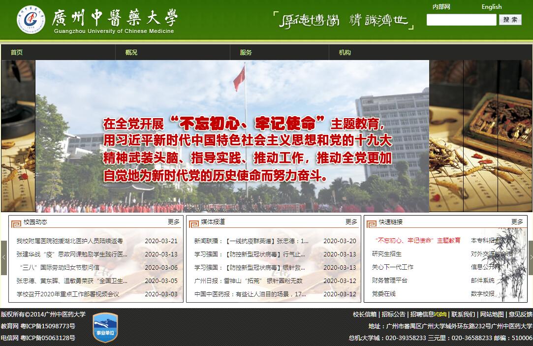 廣州中醫(yī)藥大學(xué)創(chuàng)辦于1956年,是新中國(guó)首批建立的四所中醫(yī)藥高等學(xué)校之一,先后直屬國(guó)家衛(wèi)生部、國(guó)家中醫(yī)藥管理局領(lǐng)導(dǎo),2000年轉(zhuǎn)由廣東省人民政府管理,現(xiàn)為廣東省“211工程”重點(diǎn)建設(shè)高校和高水平大學(xué)重點(diǎn)學(xué)科建設(shè)單位,2017年入選首批國(guó)家一流學(xué)科建設(shè)高校。經(jīng)過六十年的建設(shè)和發(fā)展,學(xué)校整體辦學(xué)水平、醫(yī)療服務(wù)能力和國(guó)際影響力均位居全國(guó)中醫(yī)藥院校前列。學(xué)校秉持嶺南人特有的開放和務(wù)實(shí)精神,大力推進(jìn)中醫(yī)藥高等教育的改革發(fā)展。學(xué)校現(xiàn)有二級(jí)學(xué)院16個(gè),本科專業(yè)27個(gè),橫跨醫(yī)學(xué)、理學(xué)、工學(xué)、管理學(xué)、經(jīng)濟(jì)學(xué)、文學(xué)、教育學(xué)7個(gè)學(xué)科門類。擁有碩士學(xué)位授權(quán)一級(jí)學(xué)科6個(gè)、碩士點(diǎn)47個(gè),博士學(xué)位授權(quán)一級(jí)學(xué)科3個(gè)、博士點(diǎn)19個(gè)。全日制在校生17742人,其中本科生12551人,專科生832人,碩士研究生3450人,博士研究生700人。學(xué)校擁有一級(jí)學(xué)科國(guó)家重點(diǎn)學(xué)科1個(gè);擁有一級(jí)學(xué)科廣東省重點(diǎn)學(xué)科3個(gè),其中廣東省攀峰重點(diǎn)學(xué)科1個(gè),廣東省優(yōu)勢(shì)重點(diǎn)學(xué) 科2個(gè);擁有國(guó)家中醫(yī)藥管理局中醫(yī)藥重點(diǎn)學(xué)科25個(gè);中醫(yī)學(xué)進(jìn)入國(guó)家“一流學(xué)科”建設(shè)行列;是擁有一級(jí)學(xué)科國(guó)家重點(diǎn)學(xué)科的兩所中醫(yī)藥高校之一,也是擁有一級(jí)學(xué)科國(guó)家重點(diǎn)學(xué)科的唯一一所省屬高校。根據(jù)2012年教育部公布的學(xué)科評(píng)估結(jié)果,一級(jí)學(xué)科中醫(yī)學(xué)全國(guó)排名第二、中藥學(xué)全國(guó)排名第三(并列)、中西醫(yī)結(jié)合全國(guó)排名第四。湯森路透2016年7月15日數(shù)據(jù)顯示,學(xué)校臨床醫(yī)學(xué)學(xué)科已進(jìn)入ESI全球前1%行列,表明學(xué)校在關(guān)鍵研究領(lǐng)域達(dá)到國(guó)際先進(jìn)水平,具有廣泛的學(xué)術(shù)影響?!爸亟?jīng)典、強(qiáng)臨床”是學(xué)校本科教學(xué)最鮮明的特色,也是學(xué)校辦學(xué)六十年最重要的經(jīng)驗(yàn)總結(jié)。八十年代中期,學(xué)校率先啟動(dòng)經(jīng)典回歸臨床的教學(xué)改革,把四大經(jīng)典作為必修課程納入教學(xué)計(jì)劃,實(shí)施“院系合一”的管理體制,促進(jìn)醫(yī)教協(xié)同發(fā)展?!啊亟?jīng)典、強(qiáng)臨床’高素質(zhì)中醫(yī)人才特色培養(yǎng)模式”獲得2014年國(guó)家級(jí)教學(xué)成果獎(jiǎng)二等獎(jiǎng)。2002年、2008年學(xué)校兩次接受教育部本科教學(xué)工作水平評(píng)估,成績(jī)均為“優(yōu)秀”。近五年來,學(xué)生參加全國(guó)執(zhí)業(yè)醫(yī)師資格考試成績(jī)突出,通過率始終名列全國(guó)中醫(yī)藥院校前茅。在總結(jié)七年制辦學(xué)成功經(jīng)驗(yàn)的基礎(chǔ)上,學(xué)校于2015年被教育部確定為首批實(shí)施“卓越醫(yī)生(中醫(yī))教育培養(yǎng)計(jì)劃改革試點(diǎn)”高校和承擔(dān)“中醫(yī)拔尖創(chuàng)新人才模式改革試點(diǎn)項(xiàng)目”高校,繼續(xù)引領(lǐng)中醫(yī)藥高等教育的改革發(fā)展。學(xué)校學(xué)位與研究生教育始于1978年,是全國(guó)首批獲得博士、碩士學(xué)位授予權(quán)的高校之一,研究生招生規(guī)模長(zhǎng)期居于全國(guó)中醫(yī)藥院校前列,培養(yǎng)質(zhì)量和學(xué)位論文質(zhì)量受到社會(huì)的高度評(píng)價(jià),在2015年中國(guó)期刊網(wǎng)《中國(guó)博碩學(xué)位論文引證報(bào)告》中,學(xué)校研究生學(xué)位論文總被引用頻次居全國(guó)醫(yī)藥衛(wèi)生類院校首位。學(xué)?,F(xiàn)有中醫(yī)學(xué)、中藥學(xué)、中西醫(yī)結(jié)合3個(gè)博士后科研流動(dòng)站,是全國(guó)唯一連續(xù)兩屆獲得中醫(yī)學(xué)全國(guó)優(yōu)秀博士后科研流動(dòng)站的高校。學(xué)校堅(jiān)持突出特色,彰顯優(yōu)勢(shì),以開展嶺南醫(yī)學(xué)研究為己任,取得了一批高水平的的科研成果。國(guó)醫(yī)大師鄧鐵濤教授牽頭的“脾虛重癥肌無力的臨床和實(shí)驗(yàn)研究”于1992年獲國(guó)家科學(xué)技術(shù)進(jìn)步二等獎(jiǎng);終身教授王建華領(lǐng)軍的“脾虛證辨證論治的系列研究”獲得2000年國(guó)家科學(xué)技術(shù)進(jìn)步獎(jiǎng)二等獎(jiǎng),其標(biāo)志性成果“脾虛理論及其應(yīng)用研究傳承與創(chuàng)新”于2016年入選《中國(guó)中醫(yī)藥重大理論傳承創(chuàng)新典藏》;袁浩教授領(lǐng)銜的“中西醫(yī)結(jié)合治療股骨頭缺血性壞死及其相關(guān)疾病的研究”獲得2000年國(guó)家科學(xué)技術(shù)進(jìn)步二等獎(jiǎng)。在中醫(yī)藥防治重大傳染性疾病中,學(xué)校勇于擔(dān)當(dāng),主動(dòng)作為。面對(duì)突如其來的非典疫情,擔(dān)任國(guó)家中醫(yī)藥管理局抗非典中醫(yī)專家組組長(zhǎng)的國(guó)醫(yī)大師鄧鐵濤主張中醫(yī)藥早介入,廣東也因此病死率全球最低,搶救成功率全球最高,得到世界衛(wèi)生組織專家的認
