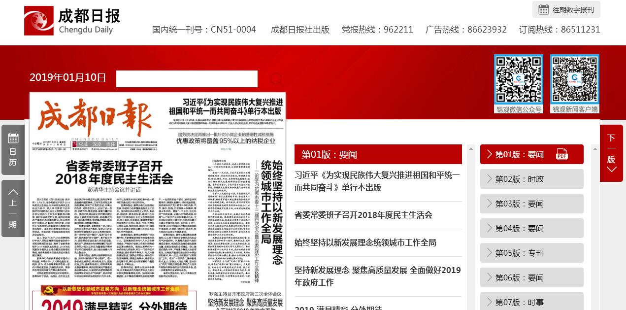 | 網(wǎng)站簡(jiǎn)介: 《成都日?qǐng)?bào)》國(guó)內(nèi)統(tǒng)一刊號(hào) CN51-0004,現(xiàn)日出對(duì)開(kāi)16版,日均發(fā)行20萬(wàn)份,日均零售量5萬(wàn)份?!冻啥既?qǐng)?bào)》是中共成都市委機(jī)關(guān)報(bào),成立于1956年5月1日,1961年更名為《成都晚報(bào)》,2001年7月1日,經(jīng)國(guó)家新聞出版總署批準(zhǔn),再次更名為《成都日?qǐng)?bào)》,一張經(jīng)歷了45載風(fēng)雨歷程的機(jī)關(guān)報(bào)從此開(kāi)始了新型城市黨報(bào)的成長(zhǎng)史。《成都日?qǐng)?bào)》作為黨和人民的喉舌橋梁,出刊以來(lái),始終秉承“創(chuàng)造全新新聞價(jià)值”的辦報(bào)理念,努力致力于傳播黨和人民的聲音,在全面、深入、準(zhǔn)確、及時(shí)地宣傳中央、省市委的大政方針、政策法規(guī)的同時(shí),積極關(guān)注著國(guó)內(nèi)外的風(fēng)云變幻、新聞事件,關(guān)注著成都城市的發(fā)展變遷,記錄和傳遞人們對(duì)各種發(fā)展變遷、新聞事件的感知,鞭撻社會(huì)丑惡,弘揚(yáng)正義正氣,服務(wù)民生大眾,與人民群眾同呼吸、共命運(yùn),同甘苦、共憂樂(lè)。《成都日?qǐng)?bào)》作為讀者喜愛(ài)、市民信任的權(quán)威媒體,得到了眾多優(yōu)秀企業(yè)的充分認(rèn)同,成為了商家進(jìn)行形象宣傳、商務(wù)交流的最佳展示平臺(tái)之一。 |