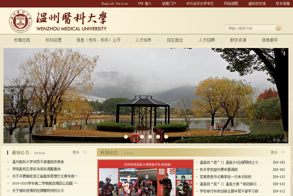 溫州醫(yī)科大學(xué)是浙江省省屬普通高等學(xué)校。學(xué)校可溯源至創(chuàng)辦于1912年的浙江醫(yī)學(xué)專門學(xué)校,1958年8月由浙江醫(yī)學(xué)院從杭州分遷至溫州建立,初名“浙江第二醫(yī)學(xué)院”,后以校址所在地改名為“溫州醫(yī)學(xué)院”,2013年更名為“溫州醫(yī)科大學(xué)”,2015年成為浙江省政府、國家衛(wèi)生計生委和教育部共建高校。2017年,成為浙江省重點建設(shè)高校。學(xué)校1958年開始招收五年制本科學(xué)生,1978年招收碩士研究生,是全國首批碩士學(xué)位授予單位,具有博士學(xué)位授予權(quán)?,F(xiàn)有臨床醫(yī)學(xué)、基礎(chǔ)醫(yī)學(xué)、藥學(xué)、生物醫(yī)學(xué)工程一級學(xué)科博士點和臨床醫(yī)學(xué)專業(yè)學(xué)位博士點,臨床醫(yī)學(xué)、護理學(xué)、中藥學(xué)、生物學(xué)、生物醫(yī)學(xué)工程、基礎(chǔ)醫(yī)學(xué)、中西醫(yī)結(jié)合、藥學(xué)、醫(yī)學(xué)技術(shù)、口腔醫(yī)學(xué)、公共衛(wèi)生與預(yù)防醫(yī)學(xué)、公共管理等12個一級學(xué)科碩士點,臨床醫(yī)學(xué)、生物醫(yī)學(xué)工程、口腔醫(yī)學(xué)、護理、公共管理、藥學(xué)、公共衛(wèi)生、應(yīng)用心理等8個專業(yè)碩士學(xué)位授權(quán)點;設(shè)有臨床醫(yī)學(xué)一級學(xué)科博士后科研流動站。學(xué)校位列ESI全國高校綜合排名第76名,臨床醫(yī)學(xué)、化學(xué)、藥理學(xué)與毒理學(xué)4個學(xué)科進入ESI全球排名前1%,其中臨床醫(yī)學(xué)專業(yè)進入ESI全球排名前 0.2%。擁有1個省部共建國家重點實驗室、1個國家工程技術(shù)研究中心、1個國家國際科技合作基地、1個國家國際聯(lián)合研究中心、15個省部級重點實驗室(研究中心)、1個浙江省“2011協(xié)同創(chuàng)新中心”,1個浙江省哲學(xué)社會科學(xué)重點研究基地。2個浙江省“重中之重一級學(xué)科”,3個浙江省A類一流學(xué)科、7個B類一流學(xué)科,10個浙江省高校重點學(xué)科,2個浙江省重點建設(shè)學(xué)科。學(xué)校堅持以社會需求為導(dǎo)向,以百姓滿意為宗旨,著力培養(yǎng)有情懷有自信、能做事能創(chuàng)新的優(yōu)秀醫(yī)學(xué)人才。學(xué)校現(xiàn)有27個本科招生專業(yè),涉及醫(yī)學(xué)、理學(xué)、工學(xué)、管理學(xué)等四大學(xué)科門類。有全日制在校生16576人(不含獨立學(xué)院——溫州醫(yī)科大學(xué)仁濟學(xué)院),其中博士研究生135人,碩士研究生2967人,學(xué)歷教育留學(xué)生817人。學(xué)校已形成從本科生到碩士生、博士生及博士后,從全日制到成人教育、留學(xué)生和港澳臺學(xué)生教育全方位、多層次的人才培養(yǎng)體系。人才培養(yǎng)質(zhì)量穩(wěn)步提升,臨床醫(yī)學(xué)類畢業(yè)生參加國家執(zhí)業(yè)醫(yī)師資格考試通過率一直位居全國前10%。據(jù)浙江省教育評估院2017年調(diào)查報告顯示,我校2016屆(畢業(yè)后一年)、2014屆(畢業(yè)后三年)本科畢業(yè)生職業(yè)發(fā)展與人才培養(yǎng)質(zhì)量總排名均位居全省本科院校第一。學(xué)?,F(xiàn)有教職員工及醫(yī)護人員10000余人(含附屬醫(yī)院),其中具有高級專業(yè)技術(shù)職務(wù)1600余人。學(xué)校本部現(xiàn)有專任教師1422人,其中具有正高級專業(yè)技術(shù)職務(wù)349人,具有副高級專業(yè)技術(shù)職務(wù)462人,博士學(xué)位813人。一批優(yōu)秀教師入選國家“千人計劃”、國家“萬人計劃”、“長江學(xué)者獎勵計劃”、國家“百千萬人才工程”、國家有突出貢獻中青年專家、教育部“新世紀(jì)優(yōu)秀人才支持計劃”、國家衛(wèi)生計生委有突出貢獻的中青年專家、省特級專家、省“千人計劃”、省高校特聘教授等高層次人才;教師榮獲“全國優(yōu)秀教師”“全國師德標(biāo)兵”“全國三八紅旗手”“全國衛(wèi)生計生系統(tǒng)先進個人”,“眼視光學(xué)院教師團隊”入選首批全國高校黃大年式教師團隊等榮譽。獲評省重才愛才先進單位。學(xué)校擁有國家特色專業(yè)建設(shè)點4個、國家級教學(xué)團隊1個、國家級人才培養(yǎng)創(chuàng)新實驗區(qū)1個、國家級實驗教學(xué)示范中心2個、國家級實踐教育基地1個、國家級精品資源共享課程5門、國家雙語教學(xué)示范課程1門、國家級來華留學(xué)生英語授課品牌課程2門,獲教育部“卓越醫(yī)生教育培養(yǎng)計劃”試點項目5個、國家專業(yè)綜合改革試點項目1個;獲國家級教學(xué)成果二等獎2項。學(xué)校承擔(dān)國家級科研項目千余項,科研成果獲得省部級以上獎勵160余項,其中獲國家科技進步獎一等獎1項,國家科技進步獎二等獎4項,國家技術(shù)發(fā)明獎二等獎2項,教育部科技獎一等獎1項、二等獎3項,中華醫(yī)學(xué)科技獎一等獎5項,中國藥學(xué)會科技獎一等獎1項,浙江省科學(xué)技術(shù)獎重大貢獻獎1項,浙江省科學(xué)技術(shù)獎一等獎15項,教育部人文社會科學(xué)優(yōu)秀成果獎二等獎1項,浙江省哲學(xué)社會科學(xué)優(yōu)秀成果獎一等獎3項。學(xué)校積極推進教育國際化,先后與28個國家(地區(qū))120多所高校和教育科研機構(gòu)建立了良好的交流合作關(guān)系,其中包括20余所世界百強大學(xué),在學(xué)生海外交流和聯(lián)合培養(yǎng)、教師學(xué)術(sh