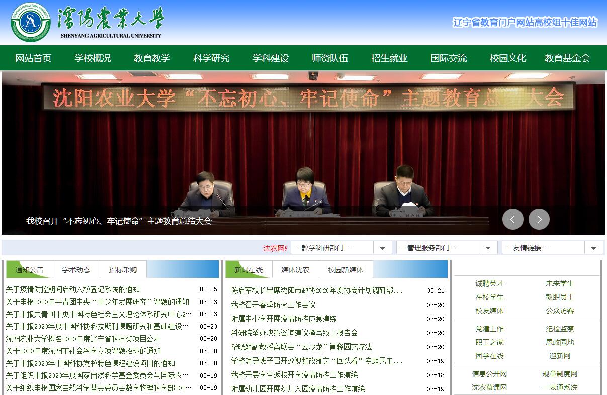 沈陽農(nóng)業(yè)大學(xué)是一所地方與中央共建的全國重點(diǎn)大學(xué)。學(xué)校坐落在沈撫同城連接帶中心區(qū)域天柱山南麓,東與世界文化遺產(chǎn)清福陵毗鄰,南與沈水渾河相望,占地面積10246畝。校園環(huán)境幽雅,風(fēng)景秀麗,人文氣息濃厚,教學(xué)、科研條件優(yōu)越。沈陽農(nóng)業(yè)大學(xué)的辦學(xué)歷史可追溯到我國農(nóng)業(yè)教育的始興時期—1906年清政府設(shè)立的省立奉天農(nóng)業(yè)學(xué)堂,以后經(jīng)歷了奉天農(nóng)業(yè)大學(xué)、東北大學(xué)農(nóng)學(xué)院和沈陽農(nóng)學(xué)院幾個歷史時期,1952年全國高等院校調(diào)整,與復(fù)旦大學(xué)農(nóng)學(xué)院合并組建成了新的沈陽農(nóng)學(xué)院。1979年10月經(jīng)國務(wù)院批準(zhǔn)為全國重點(diǎn)高等院校,1981年被批準(zhǔn)為首批具有博士、碩士學(xué)位授予權(quán)單位;1985年10月,更名為沈陽農(nóng)業(yè)大學(xué),鄧小平同志親自為學(xué)校題寫了校名。2000年,學(xué)校由農(nóng)業(yè)部所屬劃轉(zhuǎn)為以遼寧省管理為主、遼寧省與中央共建的全國重點(diǎn)大學(xué)。在黨的教育方針指引下,幾代沈農(nóng)人努力拼搏,開拓創(chuàng)新,學(xué)校的各項(xiàng)事業(yè)不斷發(fā)展壯大,成為中西部高校基礎(chǔ)能力建設(shè)工程重點(diǎn)建設(shè)高校,國家首批建設(shè)新農(nóng)村發(fā)展研究院試點(diǎn)高校,教育部、農(nóng)業(yè)部、國家林業(yè)局開展的國家首批卓越農(nóng)林人才教育培養(yǎng)計(jì)劃改革試點(diǎn)高校。今天的沈陽農(nóng)業(yè)大學(xué)已成為教學(xué)和科研并舉,以農(nóng)業(yè)與生命科學(xué)為特色,農(nóng)、理、工、經(jīng)、管、法多學(xué)科協(xié)調(diào)發(fā)展的教學(xué)研究型大學(xué)。學(xué)校形成了比較完整的農(nóng)業(yè)教育科研體系?,F(xiàn)有6個博士后科研流動站,75個博士學(xué)位授予權(quán)專業(yè),115個碩士學(xué)位授予權(quán)專業(yè),57個本科專業(yè);學(xué)校有3個國家重點(diǎn)學(xué)科,3個農(nóng)業(yè)部重點(diǎn)學(xué)科,7個遼寧省高等學(xué)校一流學(xué)科,24個遼寧省重點(diǎn)學(xué)科。根據(jù)科睿唯安發(fā)布的最新ESI數(shù)據(jù)顯示,我校農(nóng)業(yè)科學(xué)持續(xù)進(jìn)入全球ESI前1%學(xué)科。學(xué)校設(shè)有16個學(xué)院、4個教學(xué)部(中心、所);有包括國家工程實(shí)驗(yàn)室、國家地方聯(lián)合工程實(shí)驗(yàn)室、科技部和教育部批準(zhǔn)設(shè)立的新農(nóng)村發(fā)展研究院在內(nèi)的省級以上(含沈陽市)科學(xué)研究機(jī)構(gòu)82個、基礎(chǔ)實(shí)驗(yàn)室及實(shí)驗(yàn)教學(xué)中心19個。建校以來,一大批海內(nèi)外知名學(xué)者先后來校任教。自1990年以來,已有257人享受國務(wù)院政府特殊津貼。學(xué)校現(xiàn)有教職工1568人,其中專任教師1077人,教授216人,副教授430人,博士研究生導(dǎo)師120人和碩士研究生導(dǎo)師554人。專業(yè)教師中有院士2人,特聘院士5人,國家杰出青年科學(xué)基金獲得者2人,國家優(yōu)秀青年基金獲得者1人,國家“千人計(jì)劃”青年項(xiàng)目獲得者1人,國家長江學(xué)者講座教授1人,國家千人計(jì)劃特聘專家2人,國家“百千萬人才工程”第一、二層次人選3人,新世紀(jì)百千萬人才工程國家級人選2人,國家百千萬人才工程人選1人,國家級教學(xué)名師1人,教育部優(yōu)秀人才支持計(jì)劃人選4人,國務(wù)院學(xué)科評議組成員3人,教育部創(chuàng)新團(tuán)隊(duì)1個,農(nóng)業(yè)部農(nóng)業(yè)科研杰出人才及其創(chuàng)新團(tuán)隊(duì)1個,農(nóng)業(yè)部“神農(nóng)計(jì)劃”人選2人,遼寧省“院士培養(yǎng)工程”人選1人,遼寧省首批高端人才引進(jìn)工程1人,遼寧省攀登學(xué)者5人、特聘教授16人,遼寧省學(xué)科評議組成員5人,遼寧省教學(xué)名師14人。一支以博士和碩士研究生導(dǎo)師為骨干、以具有博士學(xué)位的中青年教師為主體的高水平的師資隊(duì)伍已經(jīng)形成,學(xué)校具備了發(fā)展新興學(xué)科、邊緣學(xué)科和進(jìn)行多學(xué)科聯(lián)合科技攻關(guān)的基礎(chǔ)和優(yōu)勢。學(xué)?,F(xiàn)有國家級優(yōu)秀教學(xué)團(tuán)隊(duì)1個和遼寧省優(yōu)秀教學(xué)團(tuán)隊(duì)9個,國家級特色專業(yè)和綜合改革試點(diǎn)專業(yè)5個,國家卓越農(nóng)林人才教育培養(yǎng)計(jì)劃改革試點(diǎn)項(xiàng)目2個,涵蓋8個專業(yè),省級特色、重點(diǎn)支持和轉(zhuǎn)型發(fā)展試點(diǎn)專業(yè)34個,國家級精品資源共享課1門,國家級優(yōu)秀網(wǎng)絡(luò)課程2門,遼寧省精品課程21門,遼寧省精品資源共享課16門,遼寧省視頻公開課2門,首批國家級農(nóng)科教合作人才培養(yǎng)基地4個,大學(xué)生校外實(shí)踐教育基地2個,實(shí)驗(yàn)教學(xué)示范中心1個,省級實(shí)驗(yàn)教學(xué)示范中心13個,大學(xué)生實(shí)踐教育基地13個,校內(nèi)外教學(xué)實(shí)習(xí)基地174個。學(xué)校始終把提高人才培養(yǎng)質(zhì)量放在各項(xiàng)工作的首位,重視教學(xué)研究和改革,著力于學(xué)生的綜合素質(zhì)和創(chuàng)新精神培養(yǎng)。建校以來,學(xué)校為祖國社會主義建設(shè)事業(yè)培養(yǎng)本、專科生和博士、碩士研究生11萬人。