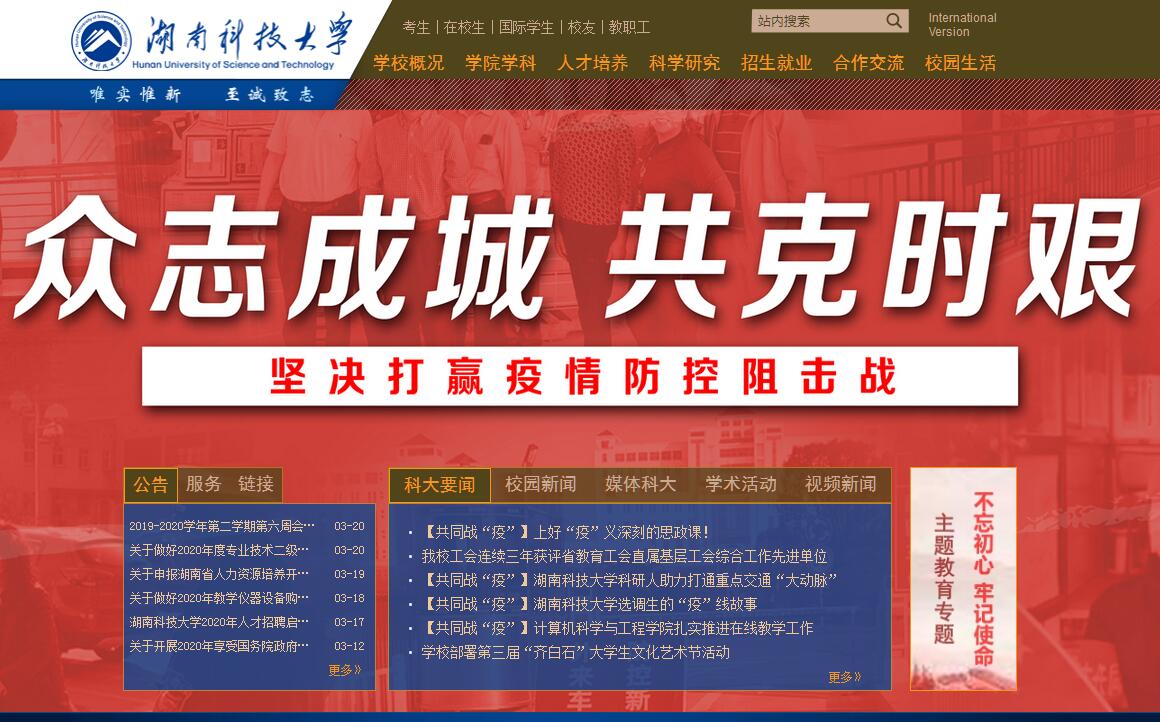 湖南科技大學(xué)肇始于解放前夕的湘北建設(shè)學(xué)院,2003年由湘潭工學(xué)院與湘潭師范學(xué)院合并組建而成,是湖南省人民政府與國(guó)家國(guó)防科技工業(yè)局共建高校、湖南省人民政府與原國(guó)家安全生產(chǎn)監(jiān)督管理總局共建高校、“十三五”國(guó)家百所中西部高?;A(chǔ)能力建設(shè)工程支持高校。學(xué)校占地3100余畝,建筑面積110余萬平方米,教學(xué)科研儀器設(shè)備總值5.67億元,紙質(zhì)、電子文獻(xiàn)總量591萬冊(cè)。設(shè)有19個(gè)教學(xué)院及研究生院、繼續(xù)教育學(xué)院、國(guó)際教育學(xué)院和瀟湘學(xué)院(獨(dú)立學(xué)院),88個(gè)本科招生專業(yè)覆蓋11個(gè)學(xué)科門類。擁有3個(gè)一級(jí)學(xué)科博士后科研流動(dòng)站,5個(gè)博士學(xué)位授權(quán)一級(jí)學(xué)科,29個(gè)碩士學(xué)位授權(quán)一級(jí)學(xué)科,9種專業(yè)碩士學(xué)位授權(quán)類別及優(yōu)秀應(yīng)屆本科畢業(yè)生免試攻讀碩士研究生推薦資格、“碩師計(jì)劃”推免資格。擁有3個(gè)國(guó)防特色學(xué)科,1個(gè)省級(jí)優(yōu)勢(shì)特色重點(diǎn)學(xué)科,8個(gè)省級(jí)重點(diǎn)學(xué)科。擁有8個(gè)國(guó)家特色專業(yè)、17個(gè)省級(jí)特色專業(yè)、1個(gè)國(guó)家專業(yè)綜合改革試點(diǎn)專業(yè)。學(xué)?,F(xiàn)有教職工2535人,其中專任教師1618人、正高職稱279人、博士學(xué)位教師866人。有國(guó)家863計(jì)劃主題專家、“萬人計(jì)劃”哲學(xué)社會(huì)科學(xué)領(lǐng)軍人才、“四個(gè)一批”人才、國(guó)家有突出貢獻(xiàn)的中青年專家、“新世紀(jì)百千萬人才工程”國(guó)家級(jí)人選、國(guó)家級(jí)教學(xué)名師和享受國(guó)務(wù)院政府特殊津貼專家等30余人,教育部“新世紀(jì)優(yōu)秀人才支持計(jì)劃”6人。學(xué)校本科招生第一批次覆蓋全國(guó)?,F(xiàn)有全日制在校本科生27410人、研究生2300人,另有瀟湘學(xué)院(獨(dú)立學(xué)院)學(xué)生5757人。擁有1個(gè)國(guó)家級(jí)教學(xué)團(tuán)隊(duì)、7個(gè)省級(jí)教學(xué)團(tuán)隊(duì)。擁有2個(gè)國(guó)家級(jí)實(shí)驗(yàn)教學(xué)示范中心、1個(gè)國(guó)家級(jí)虛擬仿真實(shí)驗(yàn)教學(xué)中心、1個(gè)教育部“卓越計(jì)劃”校外實(shí)踐教育基地、45個(gè)省級(jí)實(shí)踐教學(xué)平臺(tái),39門省級(jí)優(yōu)秀課程、重點(diǎn)課程和精品課程。“十二五”以來,主持省級(jí)以上教研教改課題180多項(xiàng),獲國(guó)家級(jí)教學(xué)成果獎(jiǎng)3項(xiàng),省部級(jí)教學(xué)成果獎(jiǎng)70項(xiàng)。學(xué)校是教育部本科教學(xué)工作水平評(píng)估“優(yōu)秀”高校、教育部“卓越工程師教育培養(yǎng)計(jì)劃”高校、全國(guó)首批創(chuàng)新創(chuàng)業(yè)典型經(jīng)驗(yàn)高校、全國(guó)畢業(yè)生就業(yè)典型經(jīng)驗(yàn)高校。學(xué)校有27個(gè)國(guó)家、省部級(jí)自科類科技創(chuàng)新平臺(tái),10個(gè)省級(jí)社科類創(chuàng)新平臺(tái)?!笆濉币詠?,承擔(dān)“863計(jì)劃”項(xiàng)目、“973計(jì)劃”項(xiàng)目、國(guó)家自然科學(xué)基金項(xiàng)目、國(guó)家社會(huì)科學(xué)基金項(xiàng)目等國(guó)家計(jì)劃項(xiàng)目548項(xiàng)。榮獲國(guó)家和省部級(jí)科研成果獎(jiǎng)107項(xiàng),獲得國(guó)家授權(quán)專利、軟件著作權(quán)等1265項(xiàng),推廣新技術(shù)96項(xiàng)。學(xué)校學(xué)報(bào)自科版和社科版均入選中文核心期刊要目總覽,社科版入選CSSCI來源期刊、全國(guó)高校百?gòu)?qiáng)社科學(xué)報(bào)。學(xué)校領(lǐng)銜研制的“海牛”號(hào)深海海底60米多用途鉆機(jī),標(biāo)志著使我國(guó)深海鉆機(jī)技術(shù)躋身世界一流水平。學(xué)校先后與美國(guó)、英國(guó)、俄羅斯、德國(guó)、意大利、瑞典、奧地利、愛爾蘭、日本、韓國(guó)、泰國(guó)、馬來西亞、我國(guó)臺(tái)灣等10多個(gè)國(guó)家和地區(qū)的幾十所高校建立了良好的合作關(guān)系,已招收20個(gè)國(guó)家的來華留學(xué)生及臺(tái)灣地區(qū)交流生來校學(xué)習(xí),定期派遣師生赴國(guó)(境)外學(xué)習(xí)深造或開展?jié)h語教學(xué)。