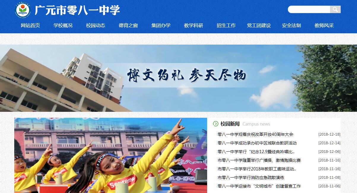 四十年的光榮與夢想,四十年的奮斗與追求。這里是一方沃土,孕育了無數(shù)花朵,成長著萬千樹苗;這里是一方大地,撒滿陽光,把希望的種子播撒。這是一首奮進的歌,朝氣蓬勃,欣欣向榮。這是一艘啟錨揚帆的航船,滿載莘莘學子,駛向知識的海洋。 這更是一只展翅的雄鷹,翱翔藍天,展望未來。鬧市中的凈土——廣元市零八一中學。廣元市零八一中學,前身是1968年國有大中型軍工企業(yè)零八一電子集團創(chuàng)建的零八一子弟中學,2004年,在企業(yè)改制的大潮中,回歸地方管理,更名為廣元市零八一中學。2014年,在廣元市教育局的戰(zhàn)略布局中,和廣元中學結成教育集團。秉承企業(yè)人開拓創(chuàng)新,求真務實的精神,學校已形成了獨具特色的校園文化。學校以“尊重教育”為辦學理念,以爭創(chuàng)省內名校為辦學目標,腳踏實地走好每一步。廣元市零八一中學是一所教學設施完備、教育特色鮮明的九年一貫制學校,廣元市教育局直屬管理?,F(xiàn)有40多個教學班,在校學生近2000人,教職員工116人,獲市級優(yōu)秀班主任、先進教師、教壇新秀和骨干教師等榮譽稱號教師共30余人。教師年富力強,敬業(yè)愛崗。學校優(yōu)雅的環(huán)境,高水平的師資隊伍,科學的教育、教學管理,為全面提高學生素質創(chuàng)造了良好的條件。近年來,學校抓住機遇,在各級黨委、政府、社會各界人士的悉心關懷下,積極籌措資金,大規(guī)模進行學校建設。學校先后建成校園遠程教育接收系統(tǒng)、校園廣播系統(tǒng)等現(xiàn)代信息技術系統(tǒng);標準的運動場、嶄新的住宿樓可滿足上千人運動、住宿的需求。德育、教學成績顯著,先后被共青團中央、教育部、全國少工委評為“全國優(yōu)秀少先隊集體”榮譽稱號。被共青團四川省委評為“五四紅旗團委”。被四川省教科所評為“信息化和課堂教學融合”示范學校。在一代代零八一中學人的奮力拼搏下,學校已成為眾多學子帶著圓夢情結抒寫人生傳奇的神圣殿堂。