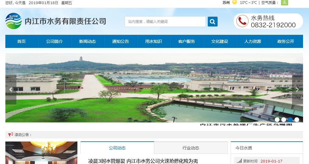 內(nèi)江市水務(wù)有限責(zé)任公司成立于1958年,擔(dān)負(fù)著內(nèi)江城區(qū)的自來水供應(yīng)和污水處理任務(wù)。內(nèi)江水務(wù)始終踐行“讓政府放心、讓用戶滿意”的經(jīng)營服務(wù)理念,忠實地履行為城市經(jīng)濟和人民生活服務(wù)的職能。經(jīng)過幾代水務(wù)人50余年的艱苦創(chuàng)業(yè)和奮力拼搏,內(nèi)江水務(wù)已由最初的囤船取水發(fā)展為今天兼具供水排水的中型企業(yè)。公司現(xiàn)有水廠二座,擁有內(nèi)江市污水處理有限責(zé)任公司、內(nèi)江市豪盛管道安裝有限責(zé)任公司、內(nèi)江市豪鵬二次供水服務(wù)有限責(zé)任公司3個子公司,日供水能力15萬立方米、污水處理能力10萬立方米,固定資產(chǎn)約8億元。公司先后獲得“省級和諧企業(yè)”、“省級先進企業(yè)”、“省級文明單位”、“省職業(yè)道德建設(shè)先進單位”,國家建設(shè)部授予的“全國城建系統(tǒng)規(guī)范化服務(wù)競賽活動優(yōu)秀單位”和中國水協(xié)授予的“城鎮(zhèn)供排水行業(yè)突出貢獻單位”、“全國污水處理廠績效評比優(yōu)質(zhì)運營單位”等一系列榮譽,為內(nèi)江城市供排水事業(yè)實現(xiàn)跨越式發(fā)展做出積極貢獻?!笆濉逼陂g,內(nèi)江水務(wù)將圍繞內(nèi)江建設(shè)“雙百”城市的發(fā)展戰(zhàn)略規(guī)劃,加大供水基礎(chǔ)設(shè)施建設(shè),將投資10余億元,建設(shè)內(nèi)江市第二污水處理廠及配套管網(wǎng)、內(nèi)江市第三自來水廠及配套引水管道、內(nèi)江市應(yīng)急供水搶險基地等重點供水排水項目,為內(nèi)江經(jīng)濟建設(shè)助力。在新的歷史起點,公司將一如既往,堅持“安全供水,優(yōu)質(zhì)服務(wù)”這一生產(chǎn)經(jīng)營方針,求真務(wù)實,開拓創(chuàng)新,為實現(xiàn)國內(nèi)一流供水企業(yè)的目標(biāo)而不懈努力!新的機制,新的機遇,內(nèi)江水務(wù)人將憑著勤奮與智慧,求實與探索,迎接新挑戰(zhàn),以非凡的業(yè)績,為建設(shè)幸福美麗內(nèi)江和經(jīng)濟騰飛作出新的貢獻。