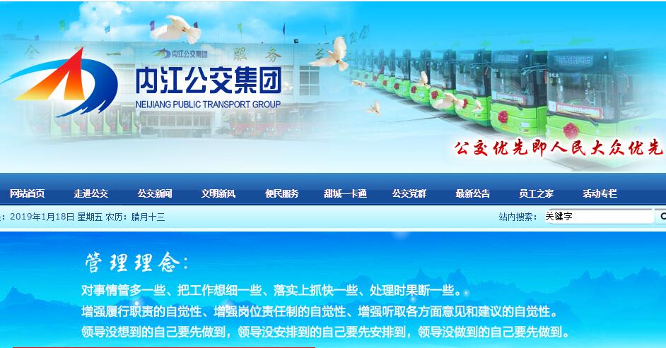 內(nèi)江市公交集團(tuán)是內(nèi)江市轄區(qū)唯一獲得城市公交特許經(jīng)營的民營公交企業(yè)。集團(tuán)始建于1958年3月,2000年11月整體改制為“內(nèi)江市公共交通有限責(zé)任公司”,2009年11月更名為“內(nèi)江市公交集團(tuán)”,母公司名稱為內(nèi)江市公共交通集團(tuán)有限責(zé)任公司。經(jīng)過公交人58年的艱苦創(chuàng)業(yè)和奮力拼搏,特別是2000年企業(yè)改制后,公司在抓好城市公交主業(yè)的同時,通過兼并、收購等形式實(shí)現(xiàn)了企業(yè)經(jīng)營規(guī)模和經(jīng)營項(xiàng)目的擴(kuò)張。集團(tuán)以城市公交為主業(yè),涵蓋道路運(yùn)輸、客貨車小車維修、駕駛培訓(xùn)、車輛檢測年審、CNG氣瓶改裝檢測、物業(yè)管理、旅游、廣告、餐飲、賓館、印刷、幼兒教育等業(yè)務(wù),現(xiàn)有員工1800余名,城市公交車852輛、營運(yùn)線路75條、年客運(yùn)量1.37億人次。內(nèi)江市公交集團(tuán)在狠抓經(jīng)濟(jì)建設(shè)的同時,忠誠地履行著服務(wù)市民出行的公益性職能,精心打造服務(wù)品牌,創(chuàng)建獨(dú)具特色的企業(yè)文化。集團(tuán)始終堅(jiān)持“服務(wù)大眾、奉獻(xiàn)社會”的服務(wù)宗旨,著力打造“誠信、和諧、平安、活力”的企業(yè)集團(tuán),在激烈的市場競爭中,集團(tuán)發(fā)揚(yáng)自力更生、艱苦奮斗、勵精圖治、銳意進(jìn)取的優(yōu)良傳統(tǒng),推動著內(nèi)江公交事業(yè)健康持續(xù)發(fā)展:產(chǎn)值年均增長8%;公交車在市民出行中的分擔(dān)率由17%上升到25%,黨風(fēng)政風(fēng)行風(fēng)群眾滿意度社會評價連續(xù)三年名列全市公共服務(wù)部門前列;年繳稅費(fèi)2300余萬元,系內(nèi)江市納稅單位前20強(qiáng);獲得了“全國模范職工之家”“四川省創(chuàng)先爭優(yōu)先進(jìn)基層黨組織”“四川省五一勞動獎狀”“四川省勞動關(guān)系和諧企業(yè)”“四川省民營企業(yè)文化建設(shè)先進(jìn)單位”“四川省文明單位”等榮譽(yù)稱號,涌現(xiàn)出各級各類先進(jìn)集體和個人100余人次,黨建成為全市乃至全省非公企業(yè)的重要品牌。
