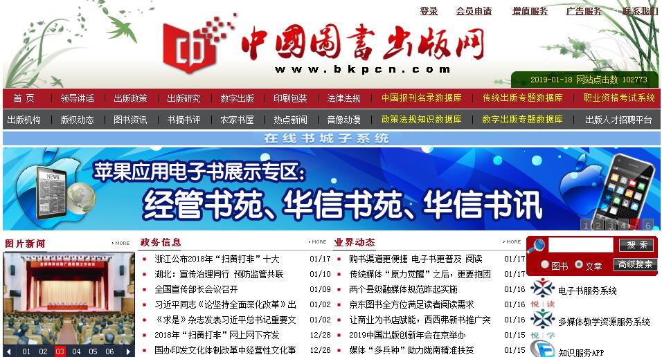 《中國圖書出版網(wǎng)》(www.bkpcn.com)是一個面向所有圖書出版單位和從業(yè)人員的管理和服務(wù)性網(wǎng)站,內(nèi)容涉及圖書出版業(yè)的方方面面。其主要任務(wù)是宣傳黨和政府有關(guān)圖書出版方面的相關(guān)政策法規(guī),發(fā)布政務(wù)信息,介紹行業(yè)動態(tài)?!吨袊鴪D書出版網(wǎng)》的開通是圖書出版業(yè)改進(jìn)管理手段、推進(jìn)信息化建設(shè)的重要舉措,《中國圖書出版網(wǎng)》自2003年6月10日開通至今,一直堅持“政務(wù)平臺、信息窗口、服務(wù)中心”這一宗旨,為提高圖書出版管理部門的服務(wù)質(zhì)量和工作效率,推動整個圖書出版業(yè)的迅速發(fā)展做出了自己的貢獻(xiàn),在業(yè)界形成了一定的影響力,獲得了從業(yè)單位的好評?!吨袊鴪D書出版網(wǎng)》得到了新聞出版總署、各級新聞出版管理部門以及中央各出版單位主管部門、各圖書出版單位的關(guān)心和支持?!吨袊鴪D書出版網(wǎng)》在開發(fā)建設(shè)的過程中,新聞出版總署原署長石宗源、原副署長于永湛、現(xiàn)新聞出版總署署長柳斌杰、副署長鄔書林曾先后多次過問此事,并作了許多重要的指示和批示。新聞出版總署原副署長于永湛、現(xiàn)新聞出版總署副署長鄔書林、副署長閻曉宏、圖書司司長吳尚之、副司長王英利等主要領(lǐng)導(dǎo)曾多次親臨《中國圖書出版網(wǎng)》視察指導(dǎo)工作。信息的豐富、權(quán)威和及時是《中國圖書出版網(wǎng)》的主要特色?!吨袊鴪D書出版網(wǎng)》主要欄目有政務(wù)信息、公告欄、選題備案、質(zhì)量監(jiān)管、教育培訓(xùn)、出版信息化、出版觀察、體制改革、專題推薦、國內(nèi)外出版動態(tài)、國內(nèi)外圖書資訊、精彩書評、新書速遞、圖書排行榜等欄目?!吨袊鴪D書出版網(wǎng)》采用會員制的管理辦法,向所有圖書出版單位及從業(yè)人員開放,主要圍繞圖書出版,提供法律法規(guī)、出版管理、教育培訓(xùn)和行業(yè)資訊等多種信息服務(wù)。會員用戶通過瀏覽器以合法會員的身份登錄,依權(quán)限的不同進(jìn)行信息瀏覽、網(wǎng)上查詢、網(wǎng)上申報等操作。從《中國圖書出版網(wǎng)》可以及時了解新聞出版總署、出版管理司的重要通知、政務(wù)活動、業(yè)界動態(tài)、深度分析信息和圖書資訊等?!吨袊鴪D書出版網(wǎng)》已經(jīng)成為出版單位和從業(yè)人員了解行業(yè)重要信息的窗口。