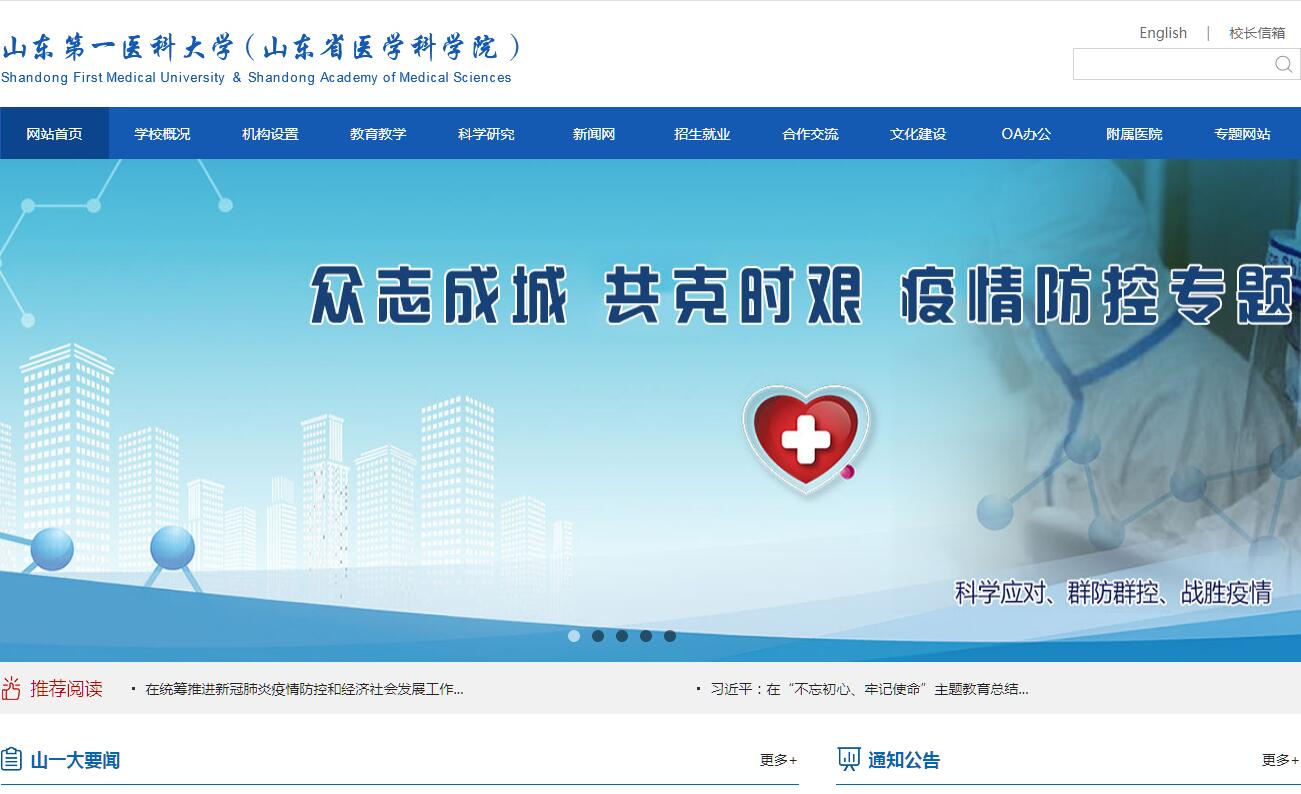 為優(yōu)化山東省高等教育發(fā)展布局,實(shí)現(xiàn)內(nèi)涵式發(fā)展,山東省委省政府實(shí)施科教融合戰(zhàn)略,整合泰山醫(yī)學(xué)院、山東省醫(yī)學(xué)科學(xué)院等資源組建山東第一醫(yī)科大學(xué)。2019年2月,山東第一醫(yī)科大學(xué)正式成立,同時(shí)掛山東省醫(yī)學(xué)科學(xué)院牌子。山東第一醫(yī)科大學(xué)(山東省醫(yī)學(xué)科學(xué)院)是山東省重點(diǎn)建設(shè)的應(yīng)用研究型大學(xué),也是山東省最大的醫(yī)學(xué)科學(xué)研究機(jī)構(gòu)。校(院)設(shè)有濟(jì)南、泰安兩個(gè)校區(qū),在濟(jì)南、青島、濟(jì)寧等地建有研究機(jī)構(gòu),總占地面積6000余畝。主校區(qū)位于濟(jì)南國際醫(yī)學(xué)科學(xué)中心核心區(qū)域,規(guī)劃占地面積約2600畝,建筑面積90萬平方米。泰安校區(qū)占地3000余畝,校舍面積82萬平方米。校(院)擁有一支以中國工程院院士領(lǐng)銜的高層次師資和科研隊(duì)伍。目前,有教職工5566人。其中,中國工程院院士3人,副高及以上專業(yè)技術(shù)人員1831人,具有碩士、博士學(xué)位人員3395人。現(xiàn)有44個(gè)本科專業(yè),5個(gè)碩士學(xué)位授權(quán)一級(jí)學(xué)科,64個(gè)碩士學(xué)位授權(quán)點(diǎn),6個(gè)山東省重點(diǎn)學(xué)科,是博士學(xué)位授予立項(xiàng)建設(shè)單位。臨床醫(yī)學(xué)學(xué)科已連續(xù)六年進(jìn)入ESI世界排名前1%。校(院)依托人才優(yōu)勢(shì),開展醫(yī)學(xué)基礎(chǔ)研究和應(yīng)用基礎(chǔ)研究,取得一系列具有重大社會(huì)效益和經(jīng)濟(jì)效益的研究成果。近五年,共承擔(dān)國家科技支撐計(jì)劃、國家重點(diǎn)研發(fā)計(jì)劃等28項(xiàng);獲得國家科技進(jìn)步獎(jiǎng)二等獎(jiǎng)3項(xiàng),何梁何利基金科學(xué)與技術(shù)進(jìn)步獎(jiǎng)1項(xiàng),山東省科學(xué)技術(shù)最高獎(jiǎng)2項(xiàng),山東省科技獎(jiǎng)勵(lì)一等獎(jiǎng)7項(xiàng)。擁有省部共建國家重點(diǎn)實(shí)驗(yàn)室培育基地、國家衛(wèi)健委重點(diǎn)實(shí)驗(yàn)室、省重點(diǎn)實(shí)驗(yàn)室等高水平創(chuàng)新平臺(tái)。校(院)臨床醫(yī)療和疾病防治實(shí)力雄厚,擁有三級(jí)甲等醫(yī)院9所,其中綜合醫(yī)院4所、??漆t(yī)院5所;國家臨床重點(diǎn)???6個(gè),國家藥物臨床試驗(yàn)機(jī)構(gòu)6個(gè)。曾在全國率先實(shí)現(xiàn)以省為單位基本消滅黑熱病、絲蟲病、瘧疾、麻風(fēng)病,奪得新中國滅病史上“四連冠”,目前指導(dǎo)全省開展職業(yè)病、皮膚病、寄生蟲病、腫瘤早診早治、輻射防護(hù)、防盲治盲、罕少見疾病防治工作;擁有世界衛(wèi)生組織合作中心。校(院)是首批頒發(fā)山東省政府外國留學(xué)生獎(jiǎng)學(xué)金院校,自2004年起招收來自美國、韓國、加拿大、印度、尼泊爾等20余個(gè)國家和地區(qū)的本科和碩士留學(xué)生,國際辦學(xué)聲譽(yù)良好。先后與美國、英國、澳大利亞、俄羅斯、日本等30余個(gè)國家及港澳臺(tái)地區(qū)的高校和醫(yī)療、科研機(jī)構(gòu)建立了良好的合作關(guān)系;6名外籍合作專家榮獲“齊魯友誼獎(jiǎng)”。校(院)將以建成國內(nèi)一流、國際上有重要影響的,有明顯優(yōu)勢(shì)和特色的應(yīng)用研究型大學(xué)為目標(biāo),不斷增強(qiáng)人才培養(yǎng)、科技創(chuàng)新、成果轉(zhuǎn)化、醫(yī)療衛(wèi)生服務(wù)等方面的實(shí)力,助力新舊動(dòng)能轉(zhuǎn)換重大工程和醫(yī)養(yǎng)健康產(chǎn)業(yè)發(fā)展,充分發(fā)揮在重大疑難疾病的診療與防治、醫(yī)學(xué)幫扶、國際醫(yī)療服務(wù)、產(chǎn)學(xué)研合作等領(lǐng)域的作用,為全省乃至全國的高等醫(yī)學(xué)教育和醫(yī)學(xué)科學(xué)事業(yè)作出新的更大貢獻(xiàn)。