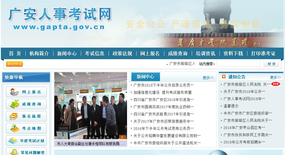 廣安人事考試網(wǎng)由廣安市考試指導(dǎo)中心主辦。根據(jù)《關(guān)于調(diào)整廣安市考試指導(dǎo)中心機(jī)構(gòu)編制事項(xiàng)的通知》(廣委編發(fā)〔2012〕7號(hào))將廣安市國(guó)家公務(wù)員培訓(xùn)中心職責(zé)并入廣安市考試指導(dǎo)中心,廣安市考試指導(dǎo)中心(增掛廣安市公務(wù)員培訓(xùn)中心的牌子)為廣安市人力資源和社會(huì)保障局管理的事業(yè)單位。廣安市考試指導(dǎo)中心的主要職責(zé):承擔(dān)全市公務(wù)員錄用考試、事業(yè)單位招聘考試、專業(yè)技術(shù)資格考試、執(zhí)業(yè)資格考試的考務(wù)工作;負(fù)責(zé)考試信息的采集、數(shù)據(jù)處理、考試歸檔工作;負(fù)責(zé)考試試卷運(yùn)送、保管、安全保密工作;對(duì)考試考務(wù)違規(guī)違紀(jì)行為進(jìn)行認(rèn)定,提出處理意見;參與制定有關(guān)人事考試政策;承擔(dān)社會(huì)化考試的命題工作。承擔(dān)公務(wù)員初任培訓(xùn)、科級(jí)干部任職培訓(xùn)、更新知識(shí)培訓(xùn)、專門業(yè)務(wù)培訓(xùn),專業(yè)技術(shù)人員繼續(xù)教育培訓(xùn),軍隊(duì)轉(zhuǎn)業(yè)干部崗前培訓(xùn)的組織和施教工作。