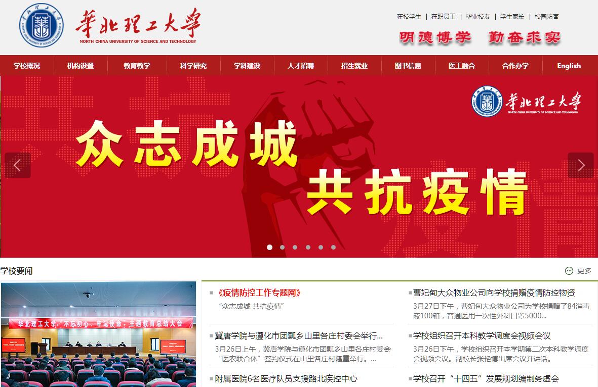 華北理工大學(xué)是一所以工、醫(yī)為主,理、經(jīng)、管、文、法、藝、教等多科性協(xié)調(diào)發(fā)展,具有留學(xué)生教育、博士碩士研究生教育、本科教育、繼續(xù)教育等教育類別和層次的省屬重點骨干大學(xué)、省重點支持的國家一流大學(xué)建設(shè)高校。學(xué)校為河北省人民政府與國家安全生產(chǎn)監(jiān)督管理總局、河北省人民政府與國家國防科技工業(yè)局共建高校。學(xué)校前身河北聯(lián)合大學(xué)于2010年5月經(jīng)教育部批準(zhǔn),由原河北理工大學(xué)和華北煤炭醫(yī)學(xué)院強(qiáng)強(qiáng)聯(lián)合組建而成。河北理工大學(xué)前身為創(chuàng)辦于1895年的北洋西學(xué)學(xué)堂礦務(wù)學(xué)學(xué)門,1958年建校,1959年天津大學(xué)礦冶系成建制并入,曾沿用唐山礦冶學(xué)院、河北礦冶學(xué)院、唐山工程技術(shù)學(xué)院、河北理工學(xué)院等校名。華北煤炭醫(yī)學(xué)院前身為創(chuàng)辦于1926年的開灤高級護(hù)士職業(yè)學(xué)校,1963年開始本科建制,曾沿用唐山煤礦醫(yī)學(xué)院、河北醫(yī)學(xué)院等校名。學(xué)?,F(xiàn)有各類在校生7.9萬余人,其中全日制在校生5.1萬余人,繼續(xù)教育學(xué)生2.8萬余人。學(xué)校設(shè)有19個職能處室,29個教學(xué)單位,4個教輔機(jī)構(gòu)和10個直屬單位。2016年8月,學(xué)校規(guī)劃占地4500畝、總建筑面積103.6萬㎡的國內(nèi)一流現(xiàn)代化智慧校園正式啟用,建有一流的語音教室、多媒體教室、電子閱覽室、CAD中心、計算中心、電教中心和網(wǎng)絡(luò)中心等現(xiàn)代化教學(xué)設(shè)施設(shè)備。圖書館建筑面積7.8萬平方米, 擁有紙質(zhì)藏書230萬冊,中外文數(shù)據(jù)庫82個,數(shù)據(jù)存儲量達(dá)70TB,通過創(chuàng)建學(xué)科空間,實現(xiàn)了“學(xué)科一站式”服務(wù)。學(xué)校主辦有自然科學(xué)、醫(yī)學(xué)、社會科學(xué)類等5種公開發(fā)行的學(xué)術(shù)期刊,在國內(nèi)外具有一定影響。學(xué)校擁有隸屬附屬醫(yī)院和非隸屬附屬醫(yī)院25家。堅持特色發(fā)展和新型交叉的學(xué)科專業(yè)建設(shè)原則,主動適應(yīng)經(jīng)濟(jì)社會發(fā)展需求,服務(wù)國家發(fā)展戰(zhàn)略。學(xué)?,F(xiàn)有92個本科專業(yè),1個博士后科研流動站,3個博士學(xué)位授權(quán)一級學(xué)科,25個碩士學(xué)位授權(quán)一級學(xué)科,13個專業(yè)學(xué)位授權(quán)類別;冶金工程為世界一流建設(shè)學(xué)科,礦業(yè)工程和公共衛(wèi)生與預(yù)防醫(yī)學(xué)為國家一流建設(shè)學(xué)科;擁有10個國家級特色專業(yè),18個國家部委和省確定的重點學(xué)科,18個國家部委和省級科技創(chuàng)新平臺,1個河北省技術(shù)轉(zhuǎn)移示范機(jī)構(gòu),3個省級協(xié)同創(chuàng)新中心,37個市廳級科技創(chuàng)新平臺,10個省級科技創(chuàng)新券創(chuàng)新服務(wù)提供機(jī)構(gòu),13個市級科技創(chuàng)新券科技服務(wù)機(jī)構(gòu);建有國家安全生產(chǎn)監(jiān)督管理總局礦山醫(yī)療救護(hù)中心培訓(xùn)基地、河北省知識產(chǎn)權(quán)培訓(xùn)基地、河北省創(chuàng)傷研究所、教育部批準(zhǔn)的“匈牙利研究中心”、河北省城鄉(xiāng)統(tǒng)籌及一體化發(fā)展研究基地;中科院唐山科學(xué)發(fā)展研究院、唐山市城鄉(xiāng)一體化發(fā)展研究中心、唐山市院士工作站等機(jī)構(gòu)依托學(xué)校建設(shè)。學(xué)校全面貫徹落實河北省“雙一流”建設(shè)工作部署,系統(tǒng)推進(jìn)“3433”學(xué)科群建設(shè)工作,重點建設(shè)冶金與材料學(xué)科群、礦業(yè)與安全學(xué)科群 、職業(yè)衛(wèi)生與安全學(xué)科群3個強(qiáng)勢特色學(xué)科群;大力發(fā)展化工與環(huán)境學(xué)科群、建筑與土木工程學(xué)科群、先進(jìn)制造與裝備學(xué)科群、基礎(chǔ)醫(yī)學(xué)與臨床醫(yī)學(xué)學(xué)科群4個重點優(yōu)勢學(xué)科群;適度拓展經(jīng)濟(jì)與管理學(xué)科群、人文法學(xué)與藝術(shù)學(xué)科群、信息與計算學(xué)科3個基礎(chǔ)文理學(xué)科群;積極扶持生命科學(xué)學(xué)科群、海洋科學(xué)學(xué)科群、腦認(rèn)知科學(xué)學(xué)科群3個新興交叉學(xué)科群。堅持以提高質(zhì)量為核心的內(nèi)涵式發(fā)展道路,培養(yǎng)適應(yīng)能力強(qiáng)、綜合素質(zhì)高的應(yīng)用研究與創(chuàng)新型人才。學(xué)校擁有1名國家“萬人計劃”教學(xué)名師,13名河北省省級教學(xué)名師;擁有8個國家和省級教學(xué)團(tuán)隊,54門國家和省級精品資源共享課及精品課,9個國家和省級專業(yè)綜合改革試點,13個國家和省級實驗教學(xué)示范中心,4個國家和省級大學(xué)生校外教育實踐基地。近五年,學(xué)校入選國家專業(yè)綜合改革試點、卓越工程師和卓越醫(yī)師培養(yǎng)計劃,獲得多項實驗教學(xué)示范中心、人才培養(yǎng)模式創(chuàng)新試驗區(qū)、新工科研究與實踐項目等國家級和省級“本科教學(xué)工程”項目,獲得多項國家和省級教學(xué)成果獎。學(xué)校共培養(yǎng)10多萬名專業(yè)技術(shù)及管理人才,已成為冶金、礦業(yè)、重化工等行業(yè)總經(jīng)理、總工程師的搖籃,煤炭行業(yè)高級醫(yī)學(xué)人才、職業(yè)病防治業(yè)務(wù)骨干的