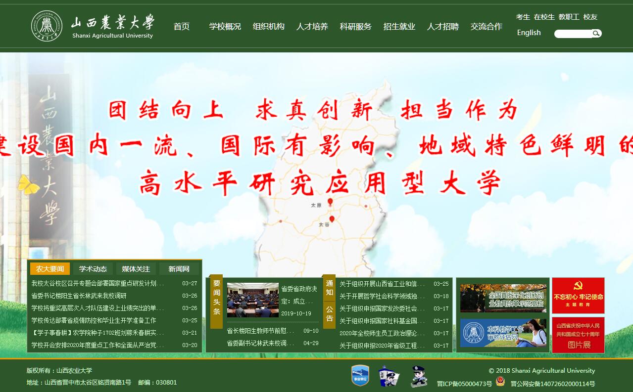 山西農(nóng)業(yè)大學(xué)是我國(guó)著名的高等農(nóng)業(yè)學(xué)府,建國(guó)前山西省兩所本科高校之一,首批獲得碩士學(xué)位授權(quán)、第七批獲得博士學(xué)位授權(quán)的高校之一,教育部本科教學(xué)評(píng)估優(yōu)秀高校,省政府與農(nóng)業(yè)部共建高校,全國(guó)首批深化創(chuàng)新創(chuàng)業(yè)教育改革示范高校,國(guó)家中西部基礎(chǔ)能力建設(shè)高校,山西省高等教育綜合改革試點(diǎn)高校。百年學(xué)府,歷史厚重。學(xué)校始建于1907年孔祥熙創(chuàng)辦的私立銘賢學(xué)堂,后發(fā)展為私立銘賢農(nóng)工??茖W(xué)校、私立銘賢學(xué)院,與山西大學(xué)堂一起,開(kāi)創(chuàng)了山西近代高等教育的先河;1951年改私立為公辦,成立山西農(nóng)學(xué)院;1979年更名為山西農(nóng)業(yè)大學(xué),成為改革開(kāi)放初全國(guó)99所重點(diǎn)大學(xué)之一。在110年的辦學(xué)實(shí)踐中,學(xué)校立足山西,面向全國(guó),服務(wù)“三農(nóng)”,不斷提高人才培養(yǎng)質(zhì)量、科技創(chuàng)新水平和社會(huì)服務(wù)能力,推進(jìn)文化傳承與創(chuàng)新,為山西乃至全國(guó)的經(jīng)濟(jì)建設(shè)和社會(huì)發(fā)展作出了重要貢獻(xiàn),鑄就了“崇學(xué)事農(nóng)、艱苦興?!钡霓k學(xué)精神,積淀了“甘于奉獻(xiàn)、敬業(yè)樂(lè)教”的教風(fēng),培育了“勤奮學(xué)習(xí)、注重實(shí)踐”的學(xué)風(fēng)。建校以來(lái),培養(yǎng)了13萬(wàn)余名各類人才,分布在大江南北,各行各業(yè)。學(xué)校培養(yǎng)了一大批革命家、政治家和黨政干部,如太谷地區(qū)最早的共產(chǎn)黨員張維琛,原中國(guó)革命軍事博物館副館長(zhǎng)趙振鑫、國(guó)務(wù)院外事辦公室副主任郝德青、中央黨校副校長(zhǎng)侯維煜、外交部紀(jì)委副書(shū)記朱霖、八路軍129師新編第10旅30團(tuán)政委馬定夫、吉林省委書(shū)記王大任、河南省委書(shū)記張樹(shù)德、北京農(nóng)業(yè)大學(xué)校長(zhǎng)安民、政治局委員(天津市委書(shū)記)譚紹文、山東省委書(shū)記高克亭、交通部部長(zhǎng)李清、國(guó)家海洋局局長(zhǎng)羅鈺如、山西省政協(xié)主席鄭社奎、山西省政協(xié)主席金銀煥、山西省紀(jì)委書(shū)記馮芝茂、山西省政協(xié)副主席湯祊德、山西省政協(xié)副主席聶向庭、山西省人大副主任張銘等;培養(yǎng)了一大批科學(xué)家,如2012年國(guó)家最高科技獎(jiǎng)獲得者鄭哲敏,中科院院士王志均,中科院院士席承藩,中科院院士郭承基,工程院院士朱尊權(quán),中科院院士莊文穎,中科院院士高福,全國(guó)著名大豆育種專家王綬,養(yǎng)豬專家張龍志,養(yǎng)羊?qū)<覅涡幔B(yǎng)牛專家冀一倫,聯(lián)合國(guó)糧農(nóng)組織助理總干事王韌等。農(nóng)科為基,特色鮮明?,F(xiàn)有農(nóng)學(xué)院、動(dòng)物科技學(xué)院、林學(xué)院、園藝學(xué)院、資源環(huán)境學(xué)院、工學(xué)院、經(jīng)濟(jì)管理學(xué)院、食品科學(xué)與工程學(xué)院、文理學(xué)院、生命科學(xué)學(xué)院、公共管理學(xué)院、信息科學(xué)與工程學(xué)院、軟件學(xué)院、城鄉(xiāng)建設(shè)學(xué)院、體育學(xué)院、馬克思主義學(xué)院(思想政治理論教學(xué)研究部)、中德學(xué)院、信息學(xué)院等教學(xué)單位。學(xué)科專業(yè)涵蓋了農(nóng)學(xué)、理學(xué)、工學(xué)、經(jīng)濟(jì)學(xué)、管理學(xué)、文學(xué)、法學(xué)、藝術(shù)學(xué)、教育學(xué)等9個(gè)門(mén)類。有博士后科研流動(dòng)站8個(gè),一級(jí)學(xué)科博士學(xué)位授權(quán)點(diǎn)9個(gè),二級(jí)學(xué)科博士學(xué)位授權(quán)點(diǎn)34個(gè),專業(yè)博士學(xué)位授權(quán)點(diǎn)1個(gè);一級(jí)學(xué)科碩士學(xué)位授權(quán)點(diǎn)14個(gè),二級(jí)學(xué)科碩士學(xué)位授權(quán)點(diǎn)60個(gè),專業(yè)碩士學(xué)位授權(quán)點(diǎn)7個(gè);國(guó)家重點(diǎn)(培育)學(xué)科1個(gè),省級(jí)重點(diǎn)學(xué)科5個(gè),省級(jí)重點(diǎn)建設(shè)學(xué)科5個(gè),省級(jí)重點(diǎn)扶持學(xué)科3個(gè),省級(jí)優(yōu)勢(shì)學(xué)科1個(gè),省級(jí)特色學(xué)科4個(gè),“1331”工程優(yōu)勢(shì)學(xué)科1個(gè),省優(yōu)勢(shì)學(xué)科攀升計(jì)劃學(xué)科1個(gè),省服務(wù)產(chǎn)業(yè)創(chuàng)新學(xué)科群1個(gè);本科專業(yè)65個(gè);成人函授本科專業(yè)11個(gè),成人函授專科專業(yè)6個(gè);主考的自學(xué)考試本科專業(yè)4個(gè)。匯聚人才,立德樹(shù)人。現(xiàn)有全日制在校生2萬(wàn)余人,教職員工1700余人。教師中有國(guó)務(wù)院學(xué)位委員會(huì)學(xué)科評(píng)議組成員1人,教育部高等學(xué)校教學(xué)指導(dǎo)委員會(huì)委員7人,國(guó)家有突出貢獻(xiàn)專家2人,教育部“新世紀(jì)優(yōu)秀人才支持計(jì)劃”入選者3人,享受政府特殊津貼32人,“青年三晉學(xué)者”6人,省“百人計(jì)劃”入選者34人,中央聯(lián)系的高級(jí)專家1人,省委聯(lián)系的高級(jí)專家28人,省教育廳聯(lián)系的高級(jí)專家43人,省學(xué)術(shù)技術(shù)帶頭人15人,省“131”人才項(xiàng)目第一層次柔性引進(jìn)院士12人,第二層次知名學(xué)者和學(xué)術(shù)帶頭人67人。學(xué)校大力實(shí)施