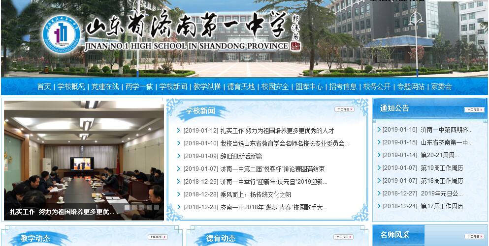 山東省濟南第一中學創(chuàng)建于1903年,有著醇厚的文化氛圍和悠久的育人傳統(tǒng)。一百多年來,濟南一中以不屈不撓、勇于奮進的精神,兼收并蓄、厚積薄發(fā)的品格,民主科學、嚴謹求實的作風,為民族的崛起和振興,培養(yǎng)了一代又一代的社會英才。楚圖南、胡也頻、李廣田、卞之琳等近代著名學者、作家都曾在這里任教;鄧恩銘、季羨林、羅干、臧克家、賀敬之、歐陽中石等都曾在這里讀書學習;中科院(工程院)院士陳力為、葉連俊、馬祖光、袁業(yè)立、崔爾杰、王恩多、彭實戈和美國科學院院士、著名數(shù)學家王浩等都是從這里走向成功。濟南一中是山東省首批重點中學、首批省級規(guī)范化學校、首批全國現(xiàn)代教育技術(shù)實驗學校、山東省電化教育示范學校、山東省藝術(shù)教育示范學校、山東省教書育人先進單位、山東省精神文明先進單位、全國體育工作先進單位、山東省教育國際交流合作基地、北京理工大學生源基地、中國科協(xié)青少年創(chuàng)新人才培養(yǎng)項目優(yōu)秀項目實驗學校。學校現(xiàn)有59個教學班,3600多名學生,教職工229人。其中高級教師61名,特級教師1名,38人具有碩士學位。全國模范教師、全國優(yōu)秀班主任、山東省優(yōu)秀教師、山東省特級教師劉暖祥,山東省優(yōu)秀教師、濟南市十佳教師劉增敏,濟南市五一勞動獎?wù)芦@得者、濟南市師德建設(shè)先進個人、濟南市名師張健等是其優(yōu)秀代表。他們師德高尚,治學嚴謹,教藝精湛,教學成績斐然,深受學生歡迎。近幾年學校在全市統(tǒng)考、全省會考、學業(yè)水平測試和高考中成績突出,先后榮獲“濟南市教學質(zhì)量進步獎”、“濟南市教學質(zhì)量優(yōu)勝獎”。學生學習勤奮刻苦,學風濃厚。繼第23屆國際化學奧林匹克競賽中我校金寧同學獲得金牌第一名后,先后又有近百名學生在全國、全省、全市各學科競賽中獲獎并取得保送升入高等院校資格,在青少年科技創(chuàng)新大賽和全省中學生運動會上也都取得了驕人成績。百年的業(yè)績、百年的英名使學校具有獨特的魅力、悠久的歷史和廣博深厚的文化。學校新校區(qū)的落成又使這所百年老校面貌煥然一新,呈現(xiàn)出蓬勃的生機和活力。新校區(qū)占地99959平方米,建筑面積92319平方米,校園環(huán)境幽靜優(yōu)美,校舍莊重、古樸、典雅,具備現(xiàn)代化功能、充滿人文氣息,成為省城濟南一座令青少年學生向往的高中學府。深厚的歷史文化積淀,優(yōu)良的辦學傳統(tǒng),不斷創(chuàng)新的管理機制和制度,優(yōu)秀的教師隊伍,現(xiàn)代化的教學設(shè)施,為學??茖W發(fā)展,和諧發(fā)展,特色發(fā)展,率先發(fā)展,跨越發(fā)展奠定了雄厚的發(fā)展基礎(chǔ)。百年精魂礪心志,攜手同心展宏圖。學校秉承“革命性、民主性、科學性”的優(yōu)良傳統(tǒng)和“勤學致知,敦品勵行”的校訓,全面貫徹落實黨的教育方針,全面實施素質(zhì)教育,積極推進新課程實踐與創(chuàng)新,正在步入全國一流高中行列。