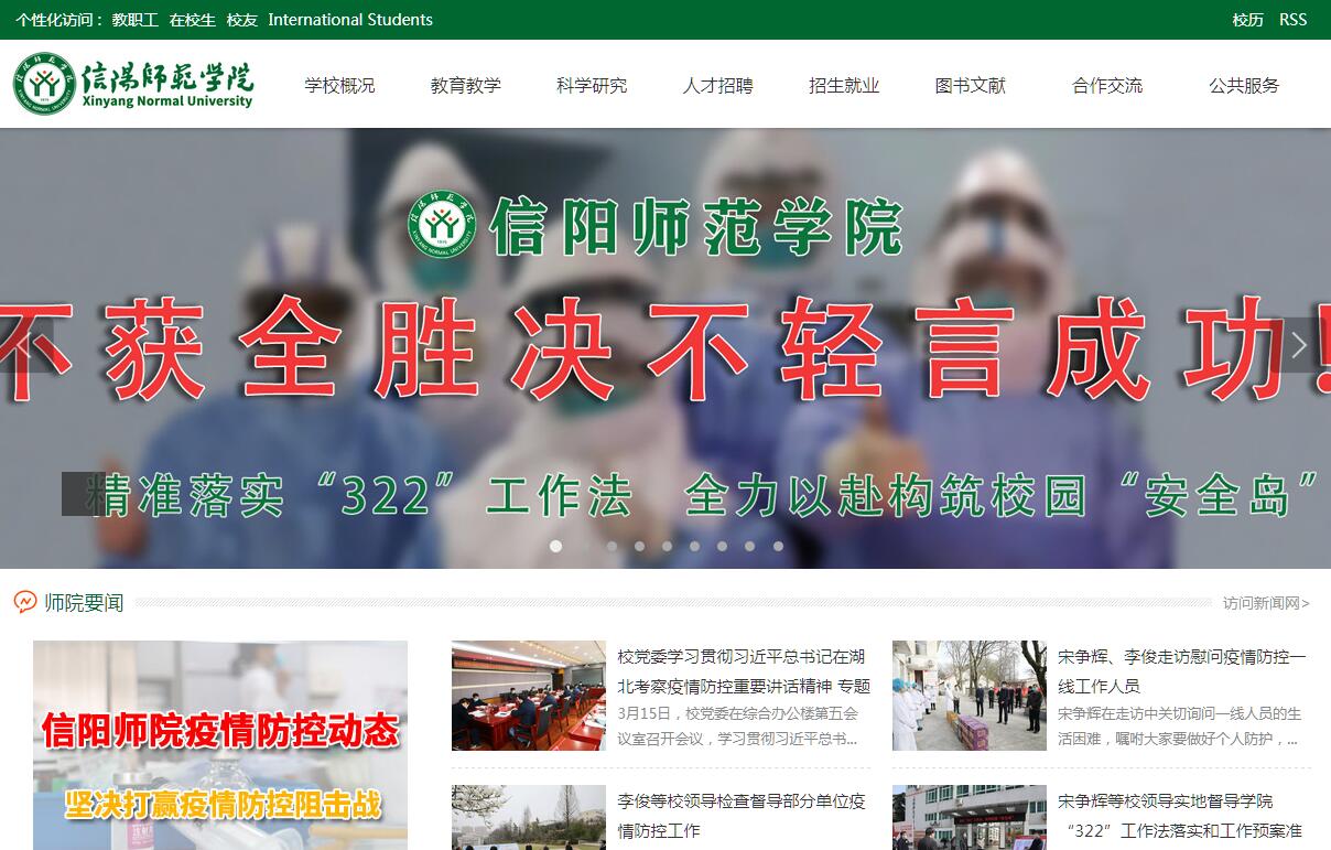 信陽師范學(xué)院 (Xinyang Normal University),簡(jiǎn)稱信陽師院(XYNU),是我國(guó)改革開放后河南省創(chuàng)辦的第一所本科高校,是河南省重點(diǎn)建設(shè)的兩所師范大學(xué)之一,是大別山地區(qū)一張閃亮的高等教育名片,被譽(yù)為“教師之搖籃 ”,被贊為“河南省最美的高?!薄ⅰ稗k在花園中的大學(xué)”、“在綠水青山中自由自在學(xué)習(xí)的好大學(xué)”。信陽師范學(xué)院坐落在中國(guó)茶都、紅色之城信陽市賢山北麓、浉水之濱,與中國(guó)四大避暑勝地之雞公山相近,散步就可到“長(zhǎng)淮明珠”南灣湖,青山秀水,高低錯(cuò)落,紅綠四季,詩(shī)情畫意,茶香人靚,宜居宜學(xué)。美麗師院,來了就不想走的大學(xué),春踏芳草看百花,夏棲綠蔭聽蟬鳴,秋聞桂香逗天鵝,冬擁白雪動(dòng)詩(shī)情。學(xué)校創(chuàng)建于1975年,時(shí)名開封師范學(xué)院(今河南大學(xué))信陽分院。1978年經(jīng)國(guó)務(wù)院批準(zhǔn)為本科建制并改為現(xiàn)名,1979年成為首批學(xué)士學(xué)位授權(quán)單位。1998年經(jīng)國(guó)務(wù)院學(xué)位委員會(huì)批準(zhǔn)為碩士學(xué)位授權(quán)單位。學(xué)校擁有40余年的本科和20余年的研究生辦學(xué)歷史與經(jīng)驗(yàn)。設(shè)有馬克思主義學(xué)院、法學(xué)與社會(huì)學(xué)學(xué)院、文學(xué)院、數(shù)學(xué)與統(tǒng)計(jì)學(xué)院、物理電子工程學(xué)院、化學(xué)化工學(xué)院、外國(guó)語學(xué)院、生命科學(xué)學(xué)院、茶學(xué)與食品科技學(xué)院、地理科學(xué)學(xué)院、建筑與土木工程學(xué)院、計(jì)算機(jī)與信息技術(shù)學(xué)院、旅游學(xué)院、商學(xué)院、體育學(xué)院、教育科學(xué)學(xué)院、美術(shù)與設(shè)計(jì)學(xué)院、音樂與舞蹈學(xué)院、歷史文化學(xué)院、傳媒學(xué)院、國(guó)際教育學(xué)院、教師教育學(xué)院、大學(xué)外語部、網(wǎng)絡(luò)信息與計(jì)算中心、繼續(xù)教育學(xué)院。擁有文學(xué)、史學(xué)、理學(xué)、工學(xué)、經(jīng)濟(jì)學(xué)、管理學(xué)、法學(xué)、教育學(xué)、藝術(shù)學(xué)、農(nóng)學(xué)等10大學(xué)科門類,設(shè)有79個(gè)本科專業(yè),15個(gè)碩士學(xué)位授權(quán)一級(jí)學(xué)科,8種專業(yè)碩士授權(quán)類別,與閩南師范大學(xué)、中國(guó)林科院等單位聯(lián)合培養(yǎng)博士生。現(xiàn)有校區(qū)2300余畝,校舍總建筑面積80余萬平方米。圖書館各類紙質(zhì)圖書261萬冊(cè),電子圖書162萬冊(cè),數(shù)字資源數(shù)據(jù)庫(kù)34個(gè),可訪問各類資源數(shù)據(jù)庫(kù)數(shù)量129個(gè),中外文期刊4508種。各類實(shí)驗(yàn)室和多媒體教室、微格教室充分滿足教育教學(xué)需要和學(xué)生成長(zhǎng)成才。學(xué)生來自全國(guó)27個(gè)省、市、自治區(qū)。學(xué)校現(xiàn)有教職工1800余人,其中具有高級(jí)專業(yè)技術(shù)職務(wù)的近600人,具有博士、碩士學(xué)位的教師1300余人,擁有雙聘院士2人,學(xué)部委員2人,中原百人計(jì)劃1人,享受國(guó)務(wù)院特殊津貼專家、河南省優(yōu)秀專家、河南省特聘教授、河南省學(xué)術(shù)技術(shù)帶頭人、河南省教學(xué)名師、二級(jí)教授等專家學(xué)者120余人?!澳虾毕盗歇?jiǎng)勵(lì)計(jì)劃人才工程,引領(lǐng)豫南人才高地建設(shè)。學(xué)校全面貫徹黨的教育方針,落實(shí)習(xí)近平教育思想,堅(jiān)持立德樹人,始終把人才培養(yǎng)作為立校之本,追求一流的育人質(zhì)量,以學(xué)生的全面發(fā)展與成才為中心,實(shí)現(xiàn)全程育人、全方位育人。實(shí)施本科教學(xué)工程,設(shè)立校長(zhǎng)教學(xué)質(zhì)量獎(jiǎng),在河南省較早成立教師教學(xué)發(fā)展中心,“努力用最優(yōu)秀的人去培養(yǎng)更優(yōu)秀的人”,建立保障教學(xué)質(zhì)量不斷提高的長(zhǎng)效機(jī)制和科學(xué)的教學(xué)質(zhì)量評(píng)價(jià)監(jiān)督體系。牽頭成立“豫南教師教育聯(lián)盟”,構(gòu)建了高校,地方政府,中小學(xué)、幼兒園“三位一體”協(xié)同育人機(jī)制,打造了師范與非師范教育、本科生教育與研究生教育、職前教育與職后培訓(xùn)協(xié)調(diào)發(fā)展的人才培養(yǎng)體系。擁有3個(gè)國(guó)家級(jí)特色專業(yè)、1個(gè)國(guó)家級(jí)專業(yè)綜合改革試點(diǎn)專業(yè)、1門國(guó)家級(jí)精品資源共享課程、13個(gè)省級(jí)特色專業(yè)、9個(gè)省級(jí)專業(yè)綜合改革試點(diǎn)專業(yè)、1個(gè)省級(jí)工程教育人才培養(yǎng)模式改革試點(diǎn)專業(yè)、8個(gè)省級(jí)優(yōu)秀教學(xué)團(tuán)隊(duì)、14門省級(jí)精品課程、10門省級(jí)精品資源共享課程、2門省級(jí)精品視頻公開課、3門省級(jí)雙語教學(xué)示范課程、9個(gè)省高校實(shí)驗(yàn)教學(xué)示范中心,建有省基礎(chǔ)教育研究中心和省研究生教育創(chuàng)新培養(yǎng)基地、全國(guó)教育碩士專業(yè)學(xué)位研究生聯(lián)合培養(yǎng)基地等。率先在河南省本科院校中實(shí)行了本專科學(xué)生升降格制,在本科生教育實(shí)習(xí)中,首創(chuàng)“雙向培訓(xùn)”模式,先后獲國(guó)家、河南省高等學(xué)校教學(xué)成果一、二等獎(jiǎng)60余項(xiàng)。在2007年教育部本科教學(xué)工作