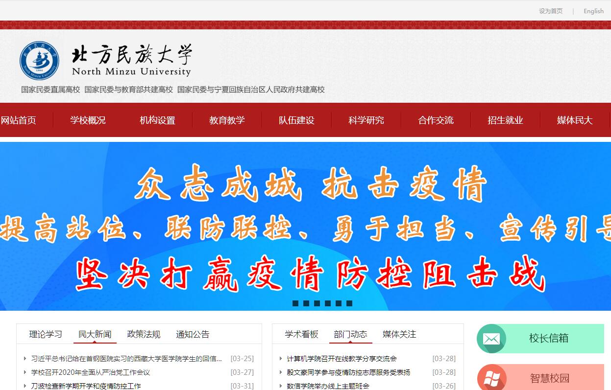 北方民族大學(xué)直屬于國家民族事務(wù)委員會,是一所綜合性民族類普通高等院校。學(xué)校坐落在“塞上江南”——寧夏回族自治區(qū)首府銀川市,是我國唯一一所建立在少數(shù)民族自治區(qū)的部委高校。學(xué)校前身為西北第二民族學(xué)院,始建于1984年,2008年更名為北方民族大學(xué)。學(xué)校為國務(wù)院學(xué)位辦批準(zhǔn)的學(xué)士、碩士、博士學(xué)位授予權(quán)單位。學(xué)校堅持中國特色社會主義大學(xué)“四個服務(wù)”的辦學(xué)方向,全面貫徹黨的教育方針,遵循高等教育規(guī)律,尊重民族高等教育特點,堅持為少數(shù)民族和民族地區(qū)服務(wù)、為國家發(fā)展戰(zhàn)略服務(wù)的辦學(xué)宗旨。學(xué)校是培養(yǎng)少數(shù)民族優(yōu)秀人才的重要基地,是研究民族理論與民族政策的重要基地,是傳承和弘揚民族優(yōu)秀文化的重要基地,也是展示我國民族政策和對外交流的重要窗口。學(xué)?,F(xiàn)有來自全國31個省、市、自治區(qū)的56個民族的碩士生、本科生、預(yù)科生2.1萬余人,少數(shù)民族學(xué)生比例為60%,是中華民族大家庭的縮影。30多年來,學(xué)校為少數(shù)民族和民族地區(qū)經(jīng)濟社會發(fā)展培養(yǎng)了5萬余名優(yōu)秀人才,他們深諳民族文化傳統(tǒng),熟悉民族風(fēng)俗民情,在民族地區(qū)安心工作,已經(jīng)成為各民族“共同團結(jié)奮斗,共同繁榮發(fā)展”的踐行者,少數(shù)民族和民族地區(qū)經(jīng)濟社會發(fā)展的建設(shè)者,民族優(yōu)秀文化的弘揚和傳播者,民族團結(jié)、祖國統(tǒng)一的捍衛(wèi)者。學(xué)校高度重視學(xué)科專業(yè)建設(shè),現(xiàn)有文學(xué)、理學(xué)、工學(xué)、法學(xué)、歷史學(xué)、管理學(xué)、經(jīng)濟學(xué)、藝術(shù)學(xué)、教育學(xué)、醫(yī)學(xué)10個學(xué)科門類的72個本科專業(yè);民族學(xué)等10個一級學(xué)科碩士學(xué)位點; MPA等9個專業(yè)碩士學(xué)位點;民族學(xué)為一級學(xué)科博士學(xué)位授權(quán)點;中國少數(shù)民族史等16個省部級重點學(xué)科;材料科學(xué)與工程等4個國家級特色專業(yè);漢語言文學(xué)等9個省部級優(yōu)勢特色專業(yè);法學(xué)等4個省部級重點建設(shè)專業(yè);自動化等7個省部級“十三五”重點建設(shè)專業(yè)(群); 材料科學(xué)為國家級實驗教學(xué)示范中心,化工技術(shù)基礎(chǔ)等8個省部級實驗教學(xué)示范中心。學(xué)校實施“人才強?!睉?zhàn)略,堅持培養(yǎng)和引進并重,建設(shè)了一支質(zhì)量較高、結(jié)構(gòu)合理的專業(yè)人才隊伍?,F(xiàn)有教職工1332人,其中具有高級專業(yè)技術(shù)職務(wù)人員537人;國家“萬人計劃”哲學(xué)社會科學(xué)領(lǐng)軍人才1人,國家“萬人計劃”科技創(chuàng)新領(lǐng)軍人才1人,“百千萬人才工程”國家級人選3人,文化名家暨“四個一批”人才工程1人,享受國務(wù)院政府特殊津貼7人,全國“百千萬知識產(chǎn)權(quán)人才工程”百名高層次人才1人,全國優(yōu)秀教師1人,教育部“新世紀(jì)人才支持計劃”2人,科技部中青年科技創(chuàng)新領(lǐng)軍人才1人,國家民委突出貢獻(xiàn)專家4人,享受自治區(qū)政府特殊津貼4人。學(xué)校在培養(yǎng)少數(shù)民族優(yōu)秀人才的同時,積極面向民族地區(qū)經(jīng)濟社會發(fā)展開展科學(xué)研究,加強與地方政府的交流與合作,建立了依托地方、融入地方、服務(wù)地方的合作辦學(xué)、合作攻關(guān)聯(lián)合機制,加大校地校企合作步伐,在社會服務(wù)中實現(xiàn)大學(xué)使命和價值回歸。近五年來,學(xué)校承擔(dān)省級以上科研項目546項,在粉體材料與特種陶瓷研究、工業(yè)廢棄物循環(huán)再利用、葡萄種植與葡萄酒釀造技術(shù)、北方語言研究、生態(tài)移民及精準(zhǔn)扶貧等方面形成了一定的特色和優(yōu)勢。學(xué)校建設(shè)了發(fā)酵釀造工程生物技術(shù)重點開放實驗室等6個省部級重點實驗室、1個國家和地方聯(lián)合工程研究中心、1個示范型國家國際科技合作基地、1個全國科普教育基地、3個國家民委人文社科研究基地、 1個自治區(qū)級技術(shù)創(chuàng)新中心、3個自治區(qū)高等學(xué)校科技創(chuàng)新平臺。學(xué)校堅持開放辦學(xué),積極開展對外合作交流。合肥工業(yè)大學(xué)為國家民委和教育部指定的對口支援高校;同時,學(xué)校還與北京大學(xué)、西安交通大學(xué)、北京科技大學(xué)、蘭州大學(xué)等多所國內(nèi)高校、科研機構(gòu)、地方政府、行業(yè) 企業(yè)開展交流合作并保持著良好的合作關(guān)系。學(xué)校主動服務(wù)“一帶一路”倡議,大力推進教育對外開放,于2014年成立了國際教育學(xué)院,2015年加入絲綢之路大學(xué)聯(lián)盟,2017年獲批3個教育部國別和區(qū)域研究中心。通過舉辦中亞國家青年漢語培訓(xùn)班、寧夏國際友城青年漢語培訓(xùn)班,招收和培養(yǎng)漢語進修、學(xué)歷教育、項目培訓(xùn)留學(xué)生。加強國際教育,目前有國際留學(xué)生82人;學(xué)校先后與美國、法國、馬來西亞等28個國家和地區(qū)的60多所高校、機構(gòu)簽署了合作協(xié)議。學(xué)校積極開展“雙創(chuàng)”教育,實施“雙驅(qū)動”+“雙三位一體”的創(chuàng)新創(chuàng)業(yè)教育