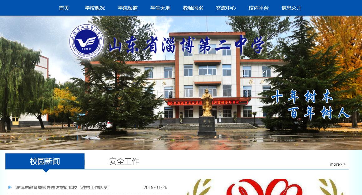 山東省淄博第二中學(xué)始建于1952年,是一所具有悠久歷史和光榮傳統(tǒng)的市屬中學(xué)。是市級規(guī)范化學(xué)校、市級文明單位、淄博市花園式單位、市區(qū)教學(xué)先進單位、社會治安綜合治理先進單位。以中國科學(xué)院院士石廣玉教授為代表的二中學(xué)子,在各自的工作崗位上建功立業(yè),成為千行百業(yè)的棟梁之才。學(xué)校地處風(fēng)景如畫的博山區(qū)源泉鎮(zhèn)。這里山清水秀,花草遍地,環(huán)境優(yōu)美,是學(xué)生成長成才的樂園。學(xué)校教學(xué)設(shè)施齊全,建有多媒體教室、計算機房、校園網(wǎng);每個教室內(nèi)都裝配有數(shù)字化教學(xué)設(shè)備,教師人人配備筆記本電腦,為教育教學(xué)提供了良好的條件。學(xué)校建有學(xué)生公寓、餐廳,潔凈、安全、衛(wèi)生,為學(xué)生提供優(yōu)良的服務(wù)。2011年下半年,新的領(lǐng)導(dǎo)班子提出了“內(nèi)強素質(zhì),外樹形象,求是創(chuàng)新,再創(chuàng)輝煌”的整體工作思路,確定了“一心一意抓教學(xué),千方百計提質(zhì)量”的目標(biāo)要求,全校上下緊緊圍繞三個“有利于”(有利于學(xué)校的發(fā)展,有利于學(xué)生的健康成長,有利于教師的專業(yè)成長)開展工作,教師愛崗敬業(yè),勤于奉獻,教書育人;學(xué)生的自我教育、自我管理、自我發(fā)展意識明顯提高。教風(fēng)嚴(yán),學(xué)風(fēng)正,校風(fēng)好,學(xué)校面貌煥然一新。學(xué)校堅持德育為先,強化養(yǎng)成教育,從小處入手,規(guī)范學(xué)生的一言一行,培養(yǎng)學(xué)生良好習(xí)慣和文明行為;構(gòu)建以“責(zé)任與感恩教育”為主導(dǎo)的德育體系,教育學(xué)生學(xué)會感恩,擔(dān)當(dāng)責(zé)任;以豐富多彩的活動為載體,拓寬德育途徑,提升學(xué)生素養(yǎng),增強德育工作實效性。學(xué)校不斷深化教學(xué)改革,面向全體,分層施教,重視特長生培養(yǎng);推廣實施生本教育,全力打造高效課堂;引進應(yīng)用全國教育技術(shù)研究“十一五”規(guī)劃重點課題研究成果——《基于web的自適應(yīng)學(xué)習(xí)測評系統(tǒng)》,著力培養(yǎng)學(xué)生的自主學(xué)習(xí)能力,學(xué)生的學(xué)習(xí)成績不斷提高。學(xué)校高度重視學(xué)生安全工作。依托門衛(wèi)室建立了校園警務(wù)室,設(shè)立安全保衛(wèi)科,配備專職保安和安全防衛(wèi)器械,安裝監(jiān)控設(shè)施和110聯(lián)網(wǎng)報警系統(tǒng)。學(xué)校實行封閉管理,采取多種形式對學(xué)生進行安全教育,加強學(xué)校周邊環(huán)境治理,定期舉行安全疏散演練,筑牢安全“防火墻”,為學(xué)生成長保駕護航。今年淄博二中將迎來60周年華誕。現(xiàn)在,學(xué)校的校舍改造工程、數(shù)字化校園建設(shè)工程、人才隊伍培養(yǎng)工程都在緊鑼密鼓的進行。屆時,一個嶄新的二中將呈現(xiàn)在世人面前。