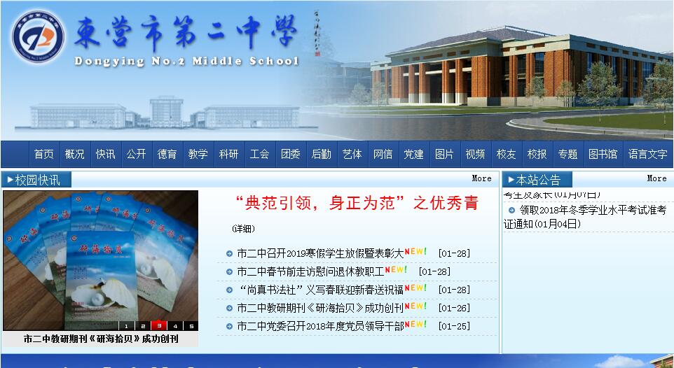 東營市第二中學(xué)是東營市人民政府2000年3月批準成立的一所市直普通高級中學(xué)。學(xué)校先后榮獲全國青少年校園足球特色學(xué)校、山東省依法治校先進學(xué)校、山東省英語特色教育重點實驗學(xué)校、山東省青少年科技輔導(dǎo)員協(xié)會單位會員、山東省校園足球訓(xùn)練營、東營市規(guī)范化學(xué)校、東營市教學(xué)示范學(xué)校、全市教育系統(tǒng)先進集體、東營市五一勞動獎狀、全國生命教育科研先進單位、東營市地震科普示范學(xué)校、市直事業(yè)單位績效考核A級單位等30余項榮譽和稱號。2016年8月25日學(xué)校遷入新址(東營區(qū)海河路589號)辦學(xué)。新校坐落于東營市“生態(tài)新城”規(guī)劃區(qū)內(nèi),位于東三路以西、海河路以北、水城路以南。新校以“生態(tài)學(xué)府、水綠書院”為設(shè)計理念,采用“現(xiàn)代簡約手法與歐式古典符號相結(jié)合、優(yōu)美綠化景觀與多樣空間形態(tài)相結(jié)合”的建筑風(fēng)格,形成了外觀古樸、空間活躍、綠色生態(tài)、文化濃厚校園環(huán)境。以“一軸一院兩組團”為總體構(gòu)思,以主入口、立實廣場、圖書綜合樓、成搏廣場、禮堂、風(fēng)雨操場為校園中軸線,以圖書綜合樓為核心,構(gòu)筑了教學(xué)區(qū)組團,以教師公寓為核心,構(gòu)筑了生活區(qū)組團,中軸線上的禮堂、風(fēng)雨操場與西側(cè)食堂圍合成了一個景觀活動院落;教學(xué)區(qū)組團與生活區(qū)組團通過中部的景觀活動院落聯(lián)系起來,“一軸一院兩組團”式的結(jié)構(gòu)骨架,完整地組織起校園教學(xué)、文體和生活三大功能區(qū)核心。突出“以人為本”的規(guī)劃原則,建立起科學(xué)完整的“人車分流”交通組織系統(tǒng),車行交通沿立實廣場和專業(yè)建筑群外圍形成環(huán)路,在校園中部設(shè)東西道路與環(huán)路相連成為一個整體;人行交通按照可達性、安全性要求,沿各功能區(qū)內(nèi)部連廊及貫通校園生活休閑區(qū)與教學(xué)區(qū)之間二層空中連廊,構(gòu)筑出便捷暢通的、融入綠地環(huán)境中的步道流線體系,形成最為人性化的空間和獨特的校園景觀。新校占地356畝,規(guī)劃辦學(xué)規(guī)模為100個教學(xué)班,5000名在校生,總建筑面積17.8萬平方米,其中地上建筑面積16.5萬平方米,地下建筑面積1.3萬平方米;設(shè)計圖書綜合樓(含人防工程及地下停車場)1棟、教學(xué)樓3棟、實驗樓2棟、藝術(shù)科技樓1棟、禮堂1棟、風(fēng)雨操場1棟、食堂1棟、學(xué)生公寓6棟、教師公寓1棟,體育運動場2個。已投入使用的一期工程建筑面積為12.5萬平方米;二期工程(5.3萬平方米)于2017年開工建設(shè)。學(xué)?,F(xiàn)有60個教學(xué)班,2900名在校生,260名教職工,其中專任教師213人(中學(xué)高級教師48人、中學(xué)中級教師79人),學(xué)歷達標率100%。市級及以上優(yōu)質(zhì)課和精品課一等獎40人,市級及以上教學(xué)能手45人;全國優(yōu)秀教師1人。43名教師入圍東營市梯級教師培養(yǎng)隊伍,市級名師工作室2個。學(xué)校堅持“能行教育立本、多元發(fā)展育人”的辦學(xué)思想。堅持育人為本、德育為先,堅持“以教師為主導(dǎo)、以學(xué)生為主體、以教學(xué)為中心、以質(zhì)量為生命”的辦學(xué)策略,努力實現(xiàn)“學(xué)校規(guī)范加特色、學(xué)生合格加特長”的辦學(xué)目標,不斷加強教師業(yè)務(wù)學(xué)習(xí)和專業(yè)培訓(xùn)工作,拓新教育理念,更新業(yè)務(wù)知識,提高教學(xué)素養(yǎng),把市二中建設(shè)成為讓每個學(xué)生都進步,每個學(xué)生家長都放心,每個教師都幸福樂教的東營市窗口學(xué)校。學(xué)校積極踐行“個性教育、多元發(fā)展”的教學(xué)理念。在教師中倡樹“能行教育”觀、科學(xué)的教學(xué)觀和正確的學(xué)生觀,因材施教,分層指導(dǎo),分類培養(yǎng);堅持新課程理念,從學(xué)情實際出發(fā),積極推行“問題引領(lǐng)、學(xué)案導(dǎo)學(xué)”課堂教學(xué)模式和“小組合作”學(xué)習(xí)模式;開發(fā)建設(shè)校本課程,廣開辦學(xué)門路,整合校內(nèi)外資源,多元合作,努力辦好適合每一名學(xué)生發(fā)展的教育。學(xué)校堅持“育人為本、成人成才”的德育理念。學(xué)校建立了全面育人導(dǎo)師制,“教師人人做導(dǎo)師、學(xué)生人人有導(dǎo)師”;建立了“班級教導(dǎo)會”制度,發(fā)揮班級教學(xué)團隊作用和家校教育資源,形成了以班主任為核心、任課教師參與、家委會代表參加的“班級教導(dǎo)會”,定期研討解決班級和學(xué)生中存在的問題;建立了校級、年級、班級三級家長委員會工作制度,健全章程和活動制度,家長委員會全面參與學(xué)校的辦學(xué)與管理工作;建立了教書育人“一崗雙責(zé)”考核制度。學(xué)校自2012年9月起實施“二次創(chuàng)業(yè)”十年戰(zhàn)略。重視加強內(nèi)部管理,實現(xiàn)內(nèi)涵質(zhì)量發(fā)展,確立了“創(chuàng)規(guī)范、求改革、謀發(fā)展”的工作思路,注重“抓制度規(guī)范、抓過程管理、抓細節(jié)監(jiān)督、抓工作落實”,牢固樹立“為教學(xué)、為教師、為學(xué)生服務(wù)”的思想,全面實施“教書育人、管理育人、服務(wù)育人、實踐育人、環(huán)境育人”工程;統(tǒng)籌兼顧德
