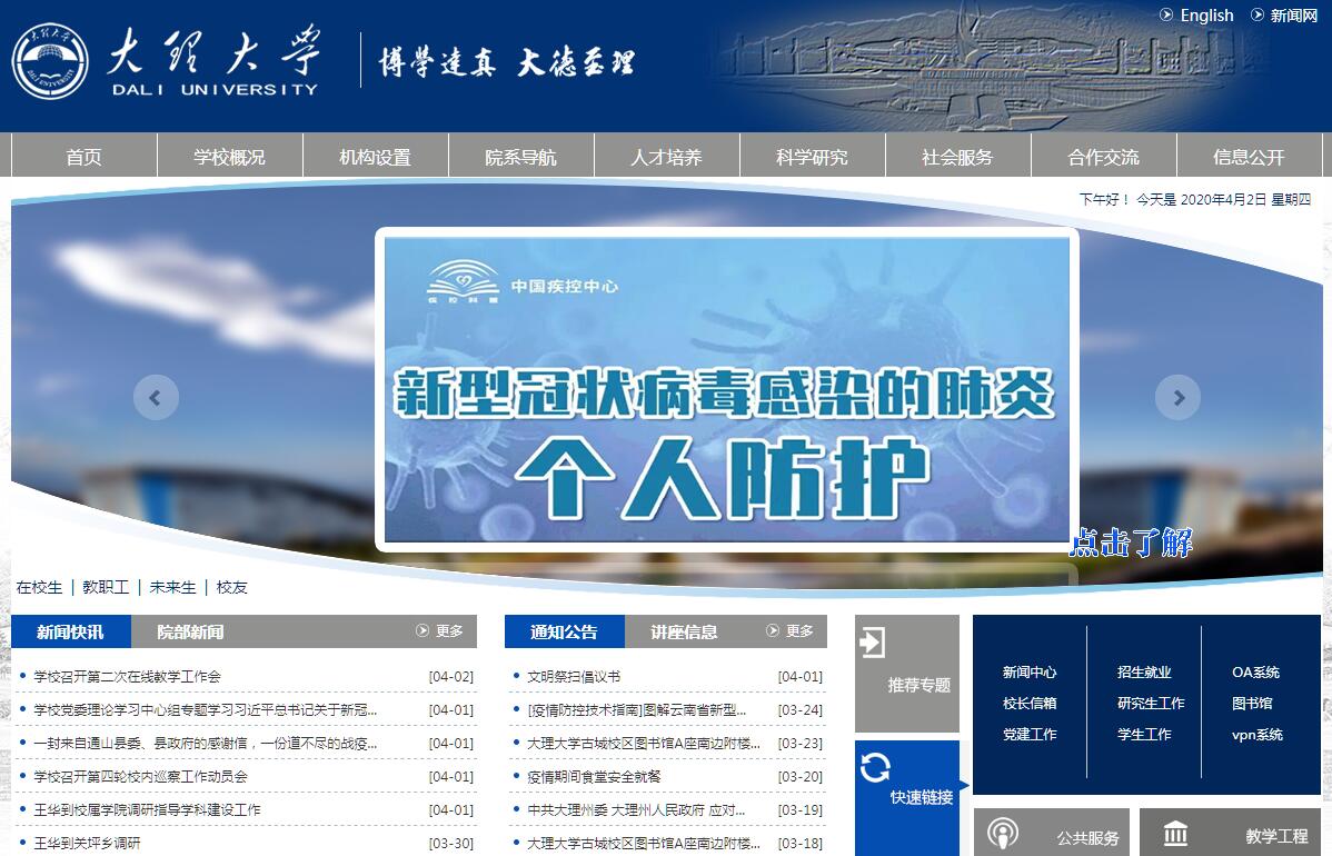 大理大學(xué)是省州共建的地方性高等院校,其前身是成立于1978年的大理醫(yī)學(xué)院、大理師范高等專科學(xué)校。學(xué)校經(jīng)過40年的辦學(xué)積淀,已發(fā)展成為一所以醫(yī)藥學(xué)、教育學(xué)、生物學(xué)、生態(tài)學(xué)為優(yōu)勢,民族學(xué)和藝術(shù)學(xué)為特色,多學(xué)科交叉融合、多層次協(xié)調(diào)發(fā)展的綜合性本科高校,是云南省地處非省會城市辦學(xué)高校中成立最早且最先具有碩士學(xué)位授予權(quán)和省級立項建設(shè)新增博士學(xué)位授予單位。學(xué)校坐落于滇西中心城市——大理。校園總占地面積2300多畝,校舍總建筑面積約55萬平方米,有古城和下關(guān)兩個校區(qū)。學(xué)校芳草凝綠、鳥語花香,被譽(yù)為“山水中的大學(xué)、大學(xué)中的山水”。學(xué)校設(shè)有17個教學(xué)學(xué)院,2所直屬附屬醫(yī)院?,F(xiàn)有65個本科專業(yè),6個一級學(xué)科碩士學(xué)位授權(quán)點(diǎn),33個二級學(xué)科碩士學(xué)位授權(quán)點(diǎn),6個碩士專業(yè)學(xué)位授權(quán)點(diǎn),全日制在校生17000余人。有專任教師1109人,其中,副高級以上職稱493人。有“長江學(xué)者”、國家有突出貢獻(xiàn)專家、中組部“萬人計劃”哲學(xué)社會科學(xué)領(lǐng)軍人才和青年拔尖人才、國家文化名家暨“四個一批”人才、百千萬人才工程國家級人選、教育部“新世紀(jì)優(yōu)秀人才支持計劃”入選者、云嶺學(xué)者等專家學(xué)者70多人次。學(xué)?,F(xiàn)有國家地方聯(lián)合工程研究中心、國家民委民族理論政策研究基地、中國文藝評論基地等16個省部級以上科研平臺。近5年來,累計獲得國家自然科學(xué)基金和社會科學(xué)基金137項,國家專利授權(quán)127項。2017年,獲得國家社會科學(xué)基金和自然科學(xué)基金項目數(shù),分別名列云南省高校第3位和第8位,國家社科基金立項數(shù)進(jìn)入全國百強(qiáng)榜。學(xué)校扎根邊疆民族地區(qū),為社會培養(yǎng)輸送各類高素質(zhì)人才10萬余名。連續(xù)12年獲得云南省高校畢業(yè)生就業(yè)工作一等獎。2008年獲得本科教育教學(xué)水平評估優(yōu)秀結(jié)論。2009年被評為全國50所畢業(yè)生就業(yè)典型經(jīng)驗高校。2015年被評為全國文明單位。長期以來,學(xué)校堅持“立足大理,服務(wù)滇西,面向云南及周邊省區(qū),輻射南亞東南亞”的服務(wù)定位,秉承“融四海文化,鑄大學(xué)精神”的理念和“博學(xué)達(dá)真,大德至理”的校訓(xùn),緊緊圍繞區(qū)域經(jīng)濟(jì)社會發(fā)展需要,致力于人才培養(yǎng)、科學(xué)研究、文化傳承與創(chuàng)新、國際合作與交流工作,辦學(xué)成效不斷顯現(xiàn),辦學(xué)特色日益彰顯,為擴(kuò)大大理的影響力,提升大理的知名度,推動區(qū)域經(jīng)濟(jì)社會發(fā)展作出了積極貢獻(xiàn)。一是根植滇西,培養(yǎng)服務(wù)邊疆民族地區(qū)的高素質(zhì)人才。學(xué)校緊密結(jié)合云南省及滇西得天獨(dú)厚的區(qū)位和資源優(yōu)勢,不斷挖掘?qū)W科專業(yè)特色,創(chuàng)新人才培養(yǎng)模式,培養(yǎng)了大批高素質(zhì)人才,其中80%以上在邊疆少數(shù)民族地區(qū)工作,為促進(jìn)邊疆繁榮穩(wěn)定、民族團(tuán)結(jié)和諧提供了人才保障和智力支撐。二是服務(wù)地方,積極開展區(qū)域經(jīng)濟(jì)社會發(fā)展的科學(xué)研究。學(xué)校堅持“一山一水一族一史一路”的科研理念,致力于生態(tài)環(huán)境保護(hù)、昆蟲藥物研發(fā)、民族文化研究、滇西特色藥用植物開發(fā)、民族醫(yī)藥研發(fā)、地方病防治研究等,培養(yǎng)了大批研究者及傳承者,為區(qū)域經(jīng)濟(jì)社會發(fā)展做出了應(yīng)有的貢獻(xiàn)。三是服務(wù)國家戰(zhàn)略,積極拓展面向南亞東南亞辦學(xué)空間。學(xué)?,F(xiàn)與22個國家和國外50所大學(xué)建立了教育教學(xué)及交流合作關(guān)系,設(shè)立了海上絲路帕那空皇家大學(xué)孔子學(xué)院,是全國孔子學(xué)院獎學(xué)金招生資格院校和國際漢語教師資格證考點(diǎn)、云南省首批“走出去”試點(diǎn)高校和國際應(yīng)用型人才培養(yǎng)基地。據(jù)教育部公布的最新數(shù)據(jù),全日制本科學(xué)歷留學(xué)生人數(shù)在全國高校中名列第10位,長期在全國西部高校中名列第1位。國際合作與交流已經(jīng)成為大理對外開放的一張靚麗名片。當(dāng)前,學(xué)校將緊緊圍繞建成區(qū)域內(nèi)有重要影響的人才高地和學(xué)術(shù)高地、有重要影響的高素質(zhì)人才培養(yǎng)基地和高等教育開放合作示范基地的“兩高兩基”發(fā)展目標(biāo),以“三化一突破”為主線,著力推進(jìn)教育思想現(xiàn)代化、管理手段信息化、教育水準(zhǔn)國際化、實現(xiàn)博士點(diǎn)零的突破,以內(nèi)涵發(fā)展為核心,以科技創(chuàng)新為動力,以特色優(yōu)勢學(xué)科專業(yè)建設(shè)為主線,以師資隊伍建設(shè)為關(guān)鍵,全面深化綜合改革,全面提升教學(xué)質(zhì)量和辦學(xué)水平,努力把學(xué)校建成省內(nèi)一流、國內(nèi)知名、南亞東南亞有較大影響的區(qū)域性高水平綜合性大學(xué)。